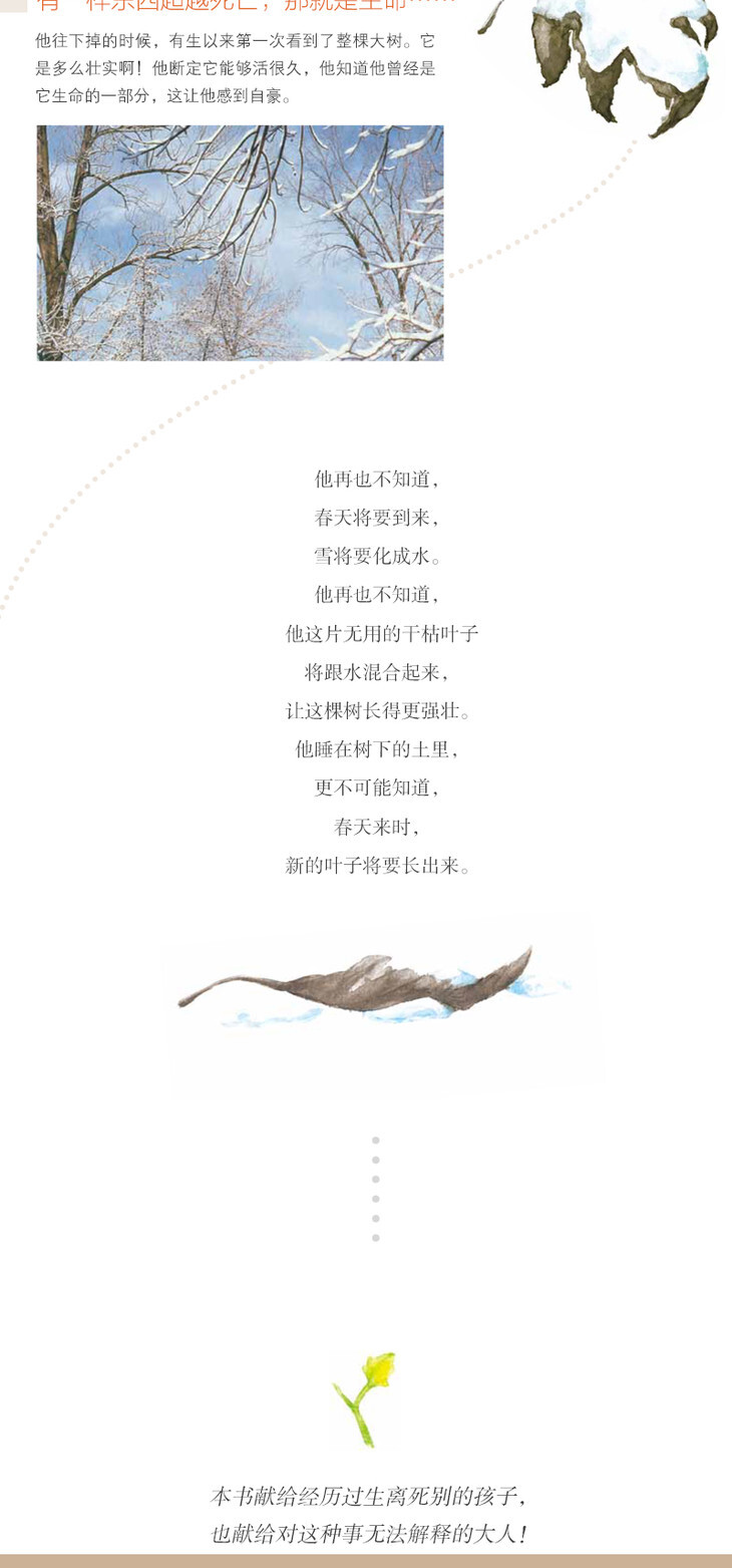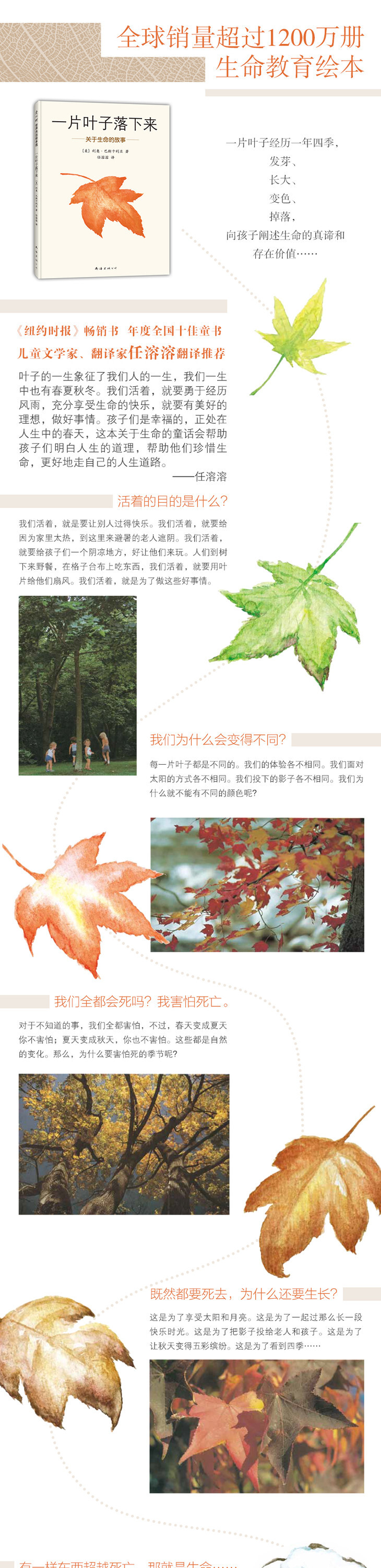 《一片叶子落下来:关于生命的故事》内容简介:这是一则关于生命的童话。图书出版后迅速在美国流传开来,第2周即登上《纽约时报》畅销书排行榜榜首。作品以一片叶子经历四季的故事,来展现生命的历程,阐述生命存在的价值。简单亲切的文字,意味深长的寓意,清新简洁的画面,无不令人感动,给人慰藉……