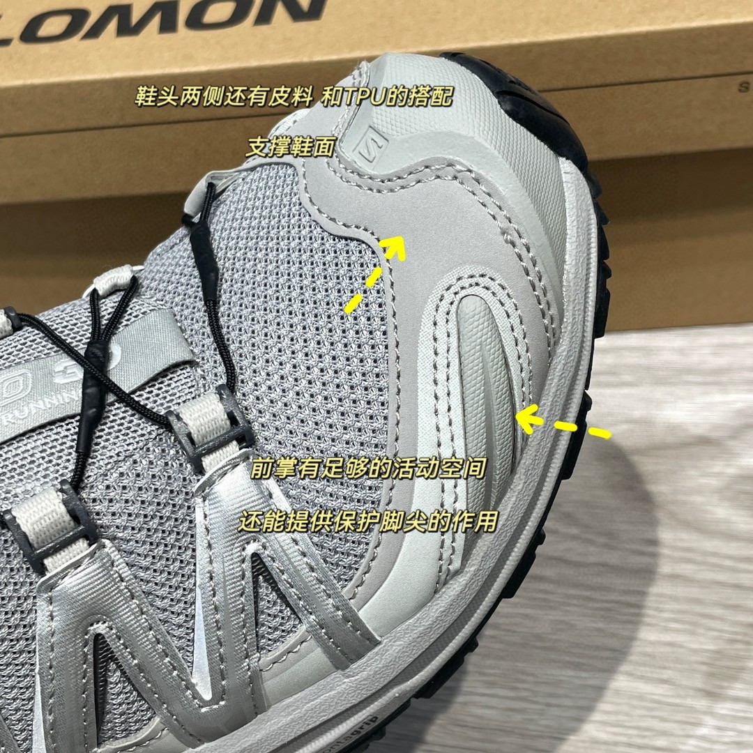 鞋面采用透气网材,多层网材设计,网孔较细的内层在透气的同时还能有效阻挡碎石细沙等侵入鞋内造成不适。另外还有皮料 和TPU的搭配来支撑鞋面