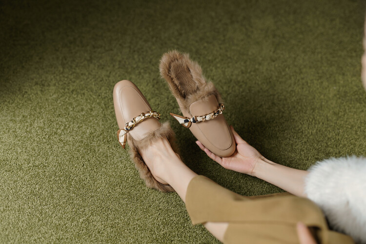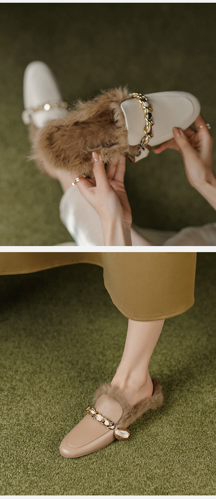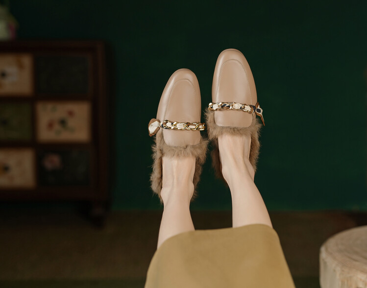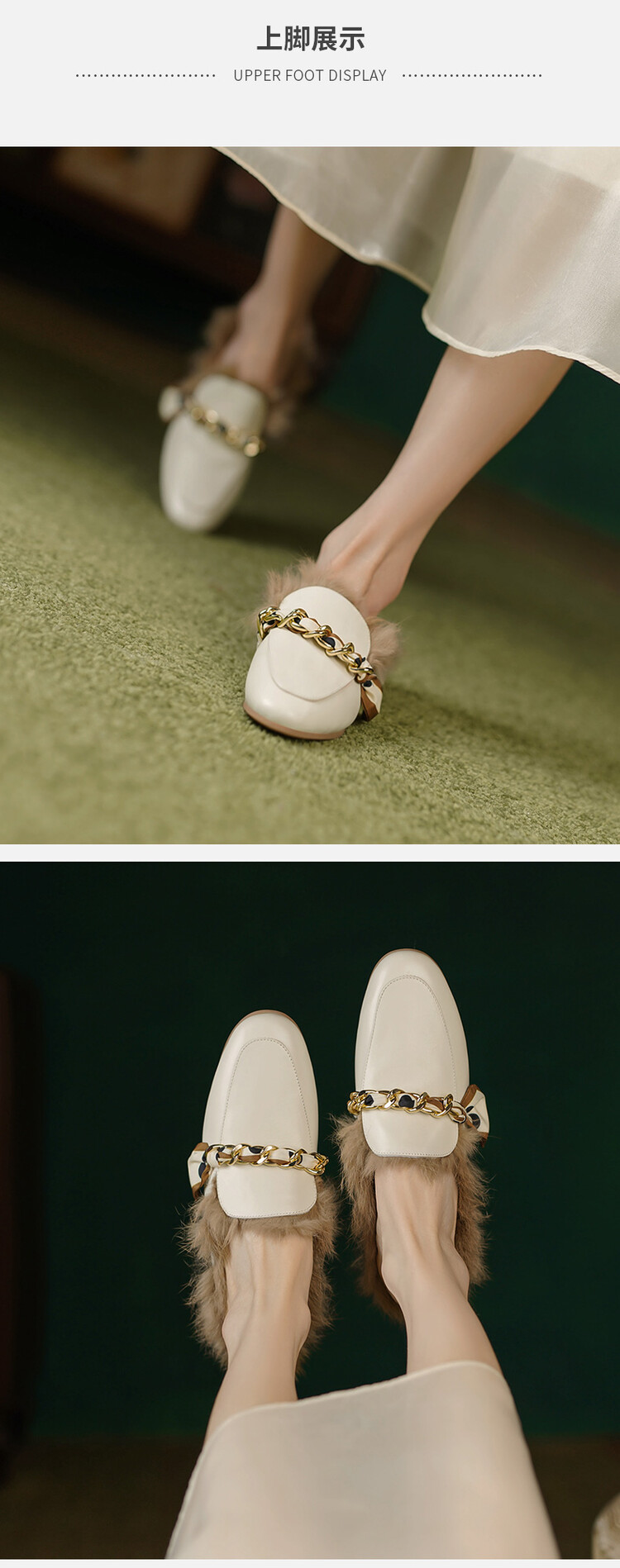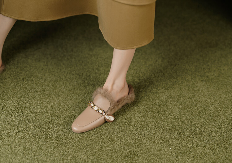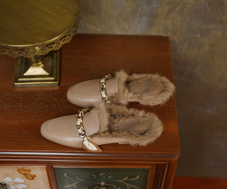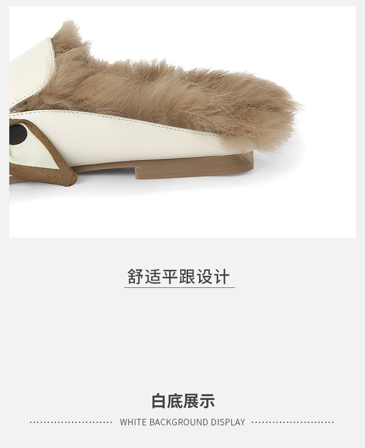 包头半拖鞋女士穆勒鞋,牛皮圆头丝巾装饰平底兔毛保暖拖鞋MCC-C8691