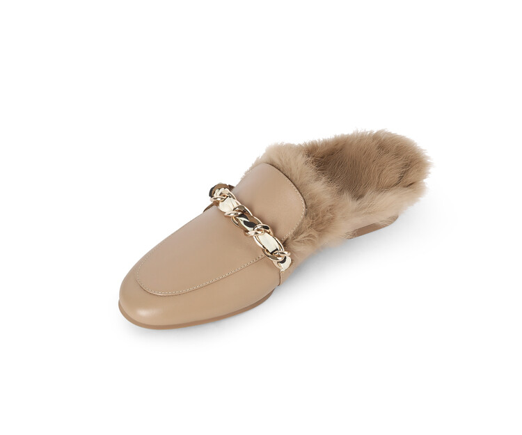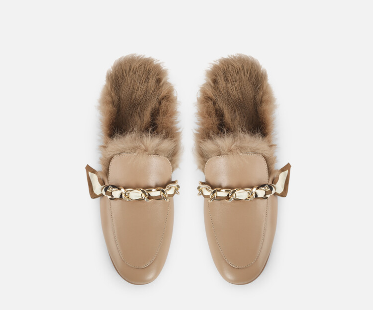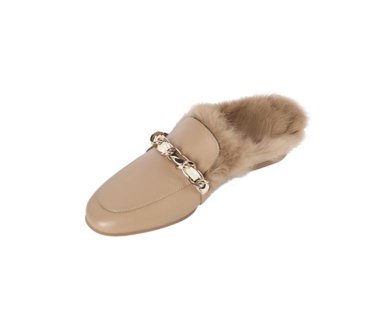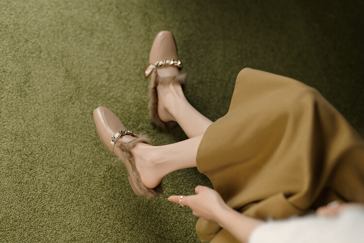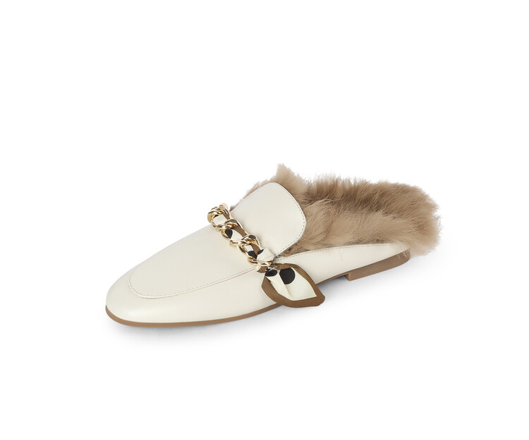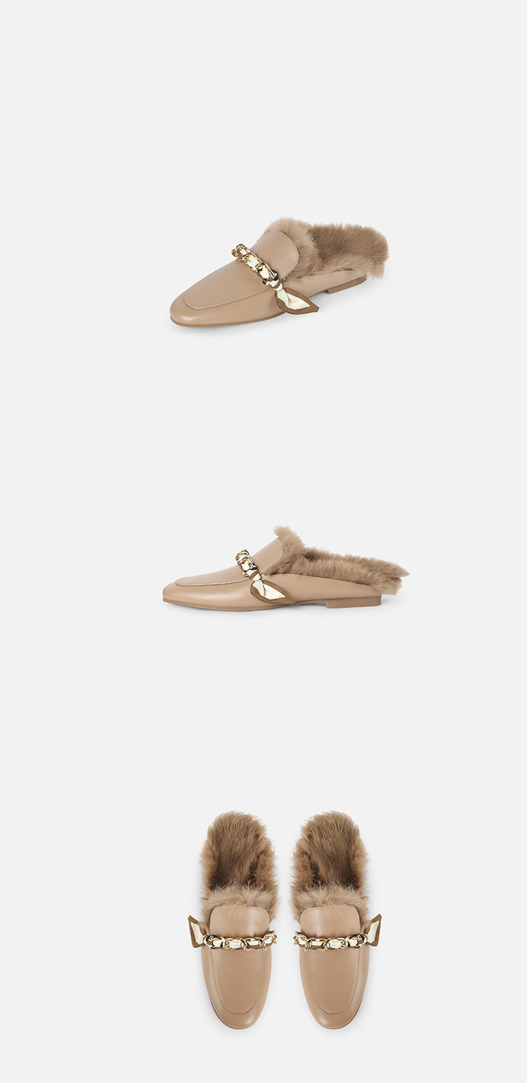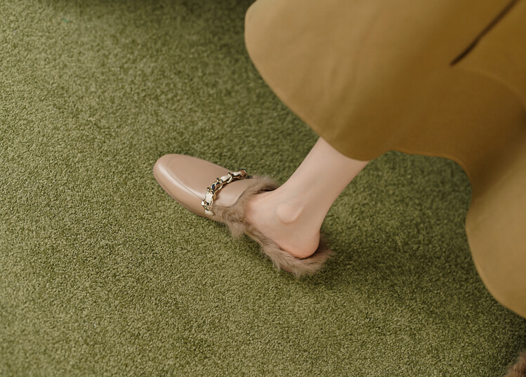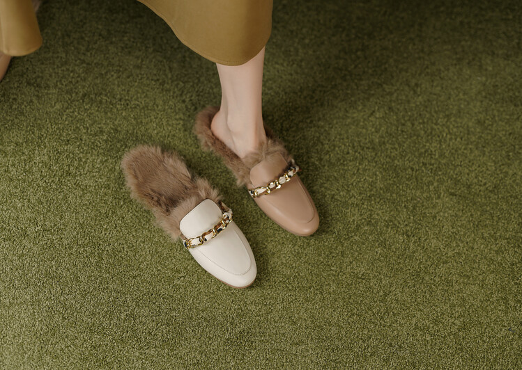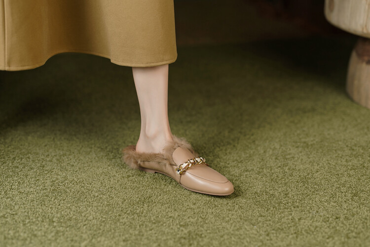 包头半拖鞋女士穆勒鞋,牛皮圆头丝巾装饰平底兔毛保暖拖鞋MCC-C8691