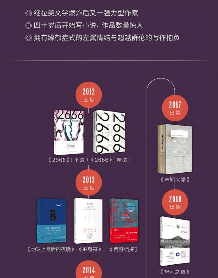 波拉尼奥四十岁才开始写小说,作品数量却十分惊人,身后留下十部小说、四部短篇小说集以及三部诗集。1998年出版的《荒野侦探》在拉美文坛引起的轰动,不亚于三十年前《百年孤独》出版时的盛况。而其身后出版的《2666》更是引发欧美舆论压倒性好评,均致以杰作、伟大、里程碑、天才等等赞誉。苏珊?桑塔格、约翰?班维尔、科尔姆?托宾、斯蒂芬?金等众多作家对波拉尼奥赞赏有加,更有评论认为此书的出版自此将作者带至塞万提斯、斯特恩、梅尔维尔、普鲁斯特、穆齐尔与品钦的同一队列。