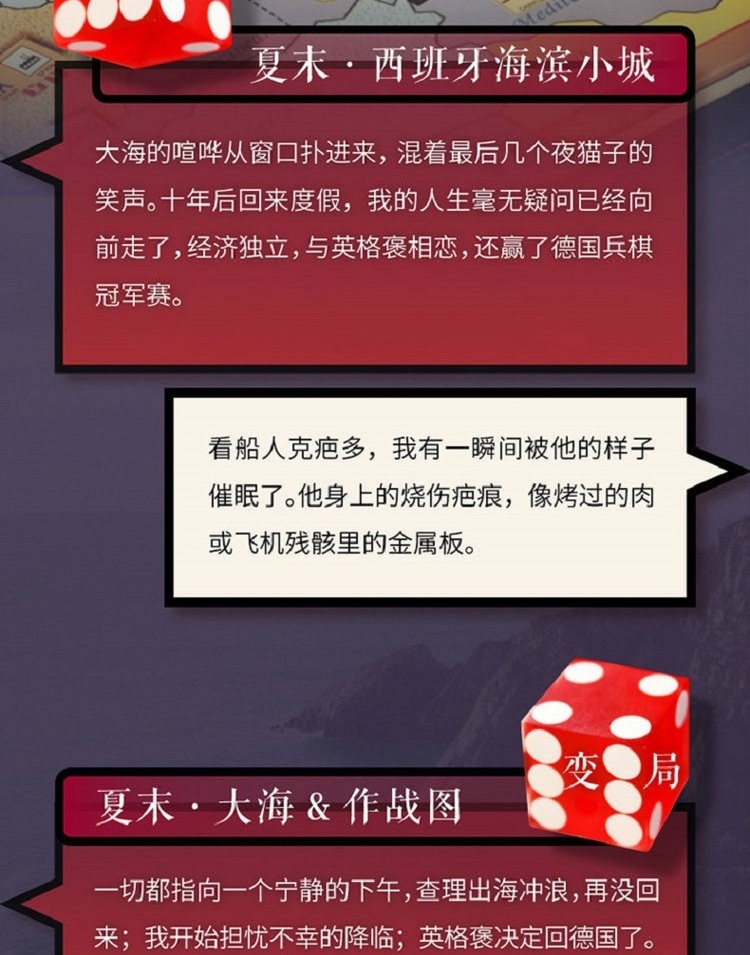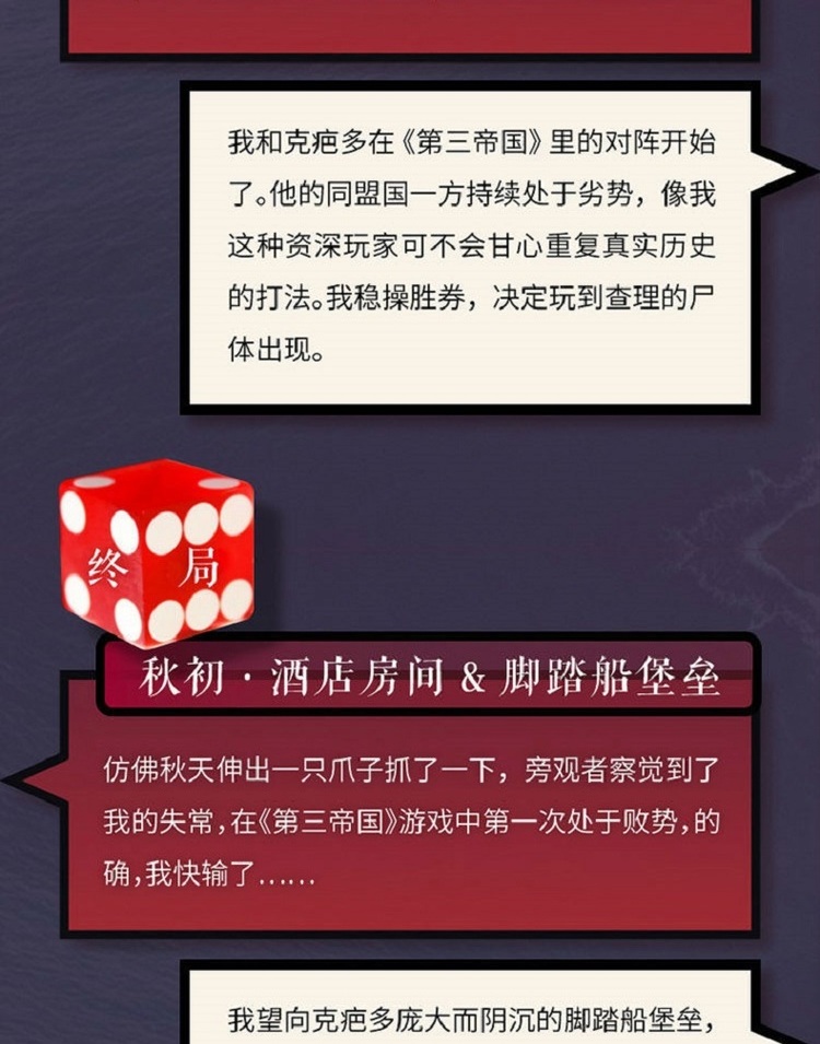 查理生死未卜,汉娜决定返回德国,英格褒也认为他们应该尽早启程回国,但乌多却似乎被什么看不见的东西绊住了脚,他决心要等到查理的尸体出现才回国。与此同时,乌多发现克疤多似乎对兵棋有着浓厚的兴趣,便邀请他一起来玩”二战“题材的兵棋游戏《第三帝国》。假期将尽,游客们渐渐离去,小镇越来越冷清,而查理仍旧毫无音讯。乌多与克疤多之间的游戏还在继续,此前对兵棋一无所知的克疤多竟渐渐扭转战局。怪异的梦境、不安的臆想纠缠着乌多,《第三帝国》中真的有什么未知的力量吗?