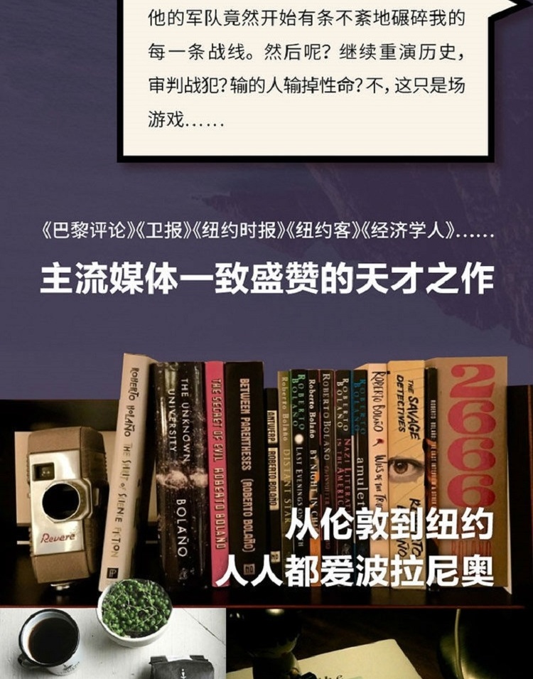 •虚构、记忆、现实、历史的界线在这个故事里变得模糊,波拉尼奥借一场桌面上的战争游戏确认并反思了真实存在的伤害。小说开篇选择迪伦马特的《抛锚》作为引言,一个同样从游戏开始但渐渐入侵了现实的诡异故事,由此形成了一种很精妙的呼应和阐释。游戏或许仅仅是游戏,但它却可以让欲望与恐惧变得清晰可触