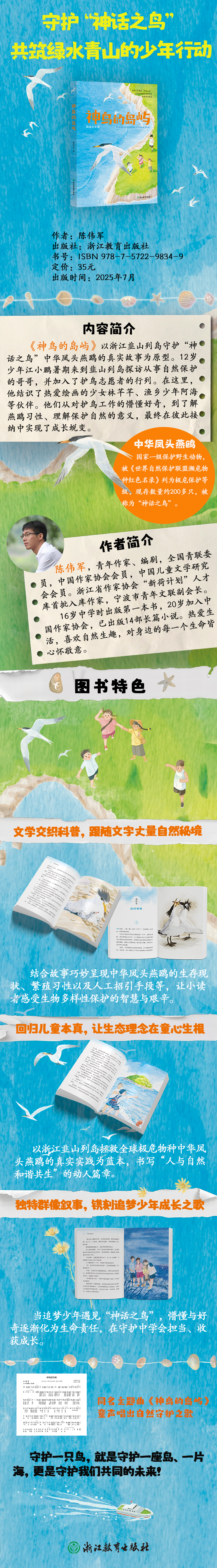 “神话之鸟”中华凤头燕鸥是国家一级保护野生动物,被《世界自然保护联盟濒危物种红色名录》列为极危保护等级,现存数量约为200只。本书以中华凤头燕鸥保护为切口,将濒危物种拯救、海岛生态系统等专业知识融入少年成长故事,通过“神话之鸟”从灭绝边缘重生的真实历程,让生态保护理念摆脱说教,转化为可感知的生命叙事,为青少年提供兼具文学性与科普性的自然教育范本。