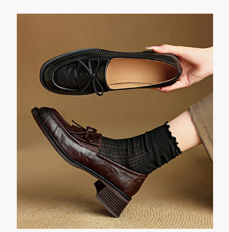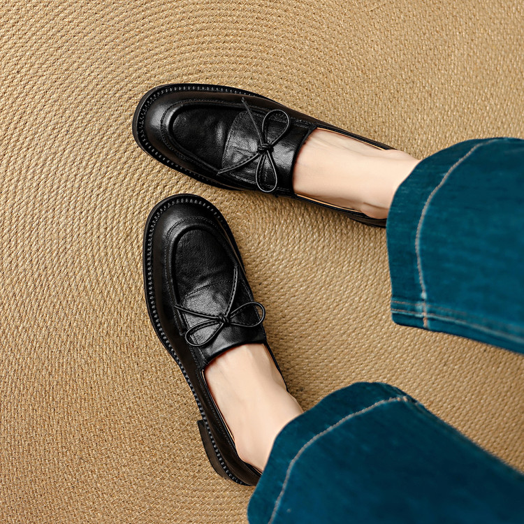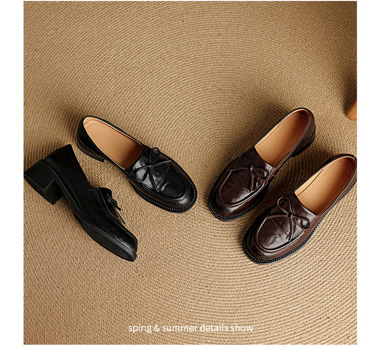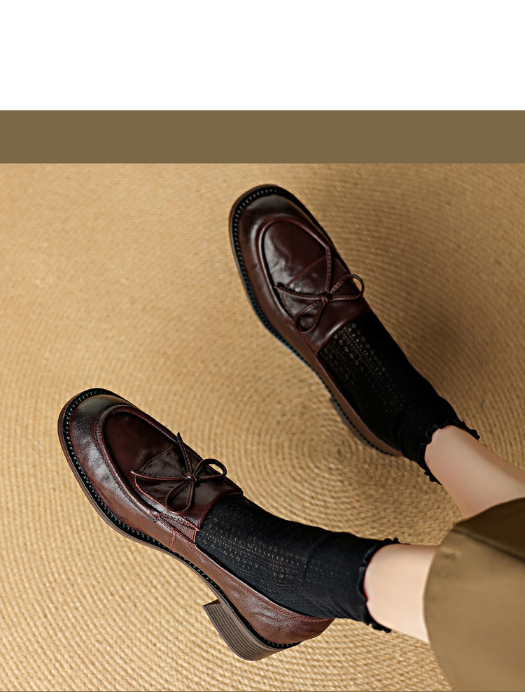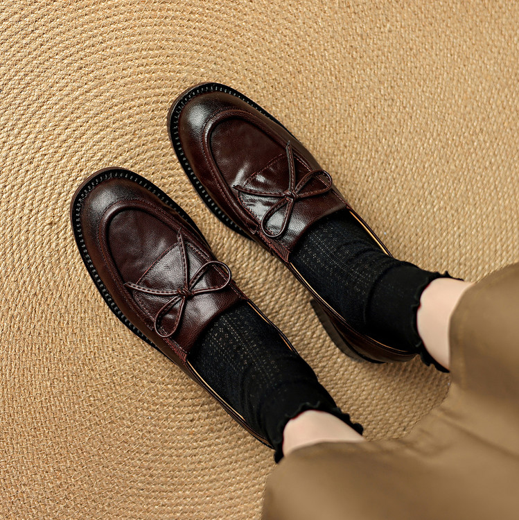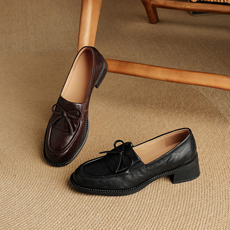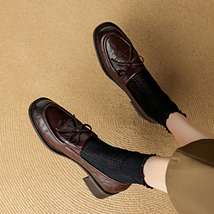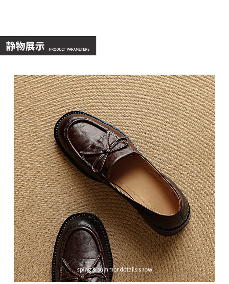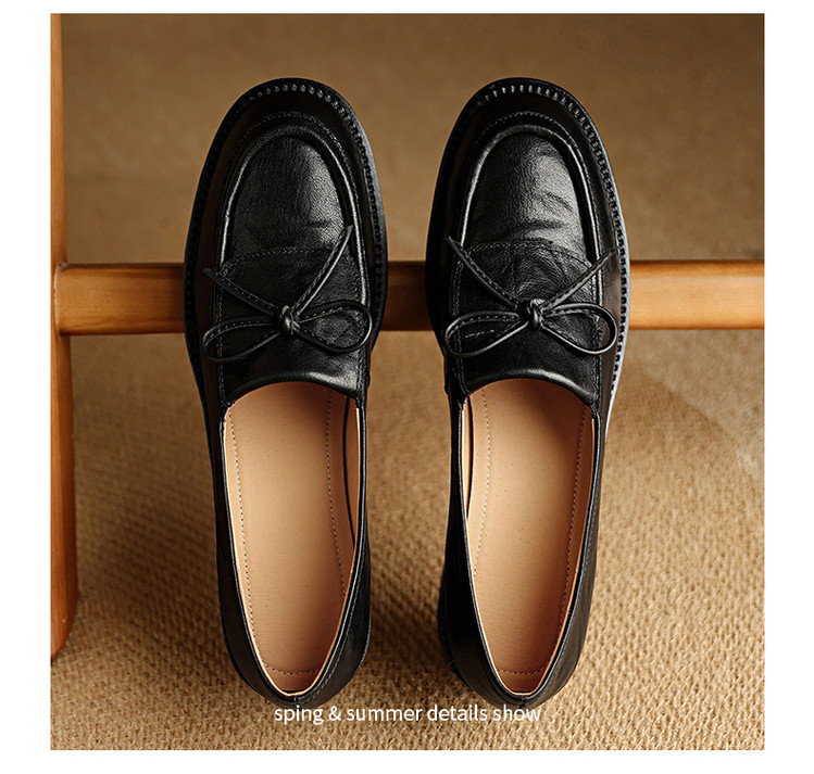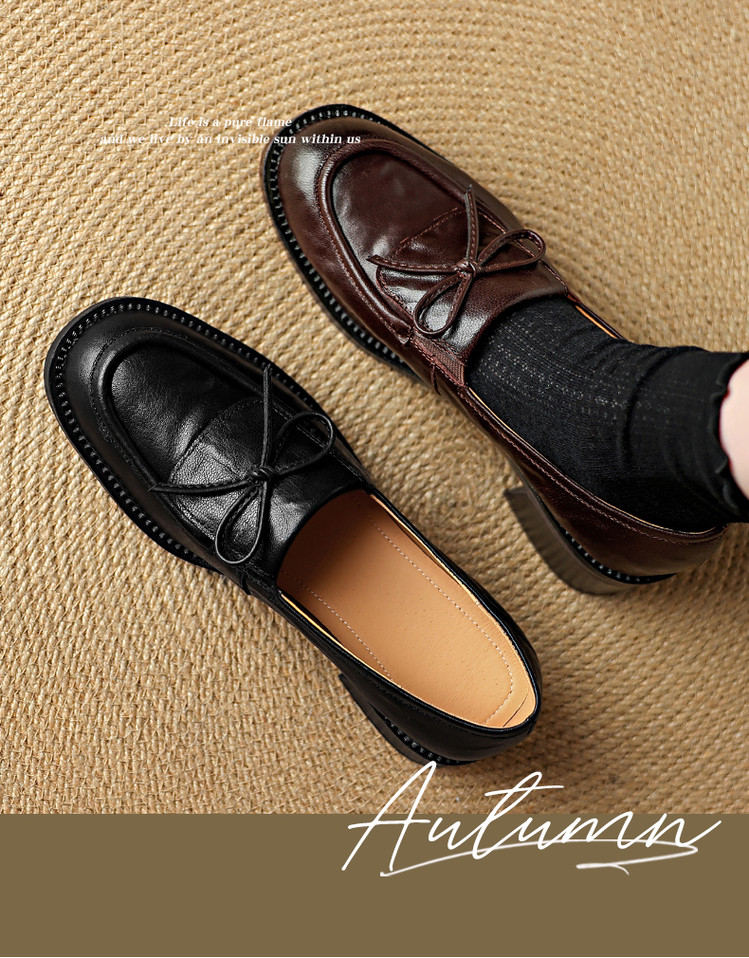 【预售5天】秋季新款羊皮英伦风小皮鞋圆头粗跟单鞋蝴蝶结中粗跟乐福鞋女NJMK&K1722