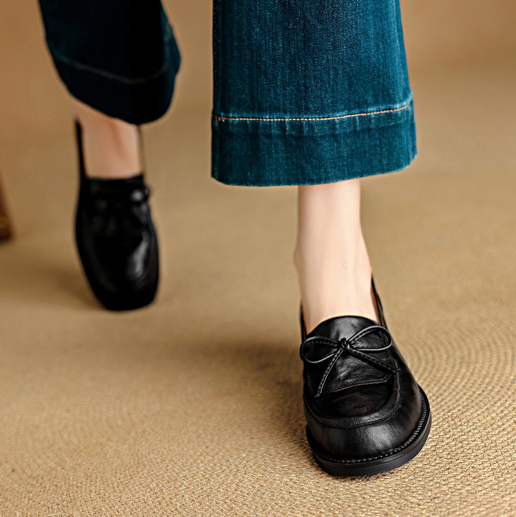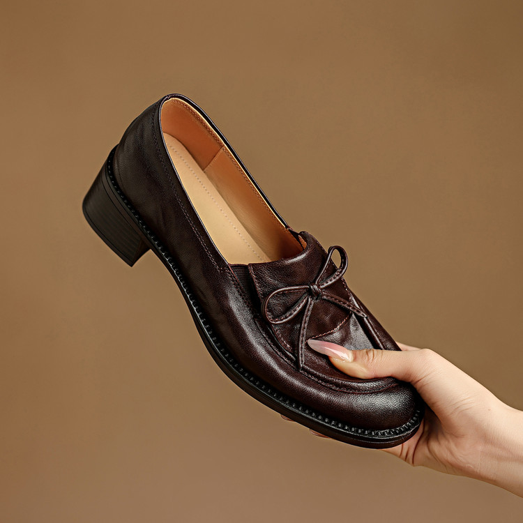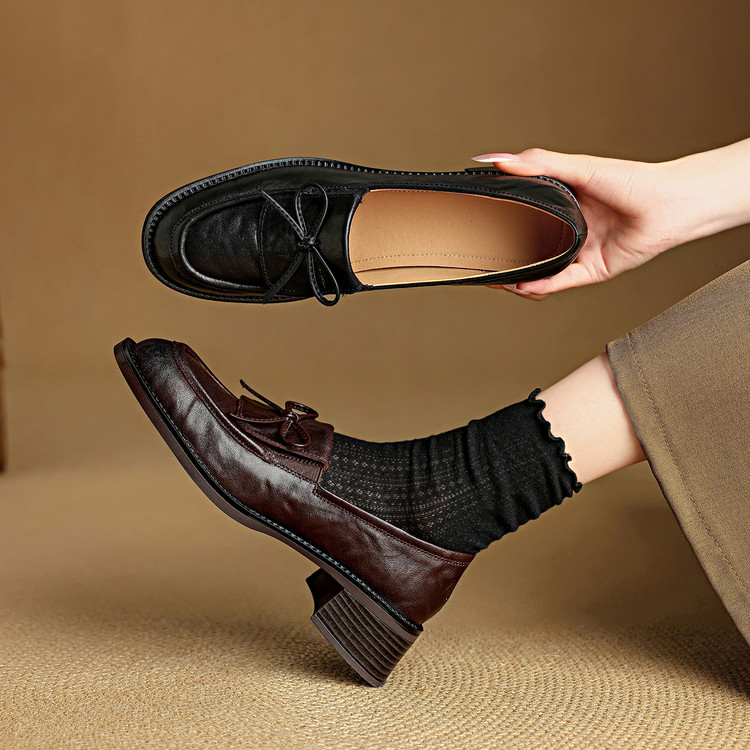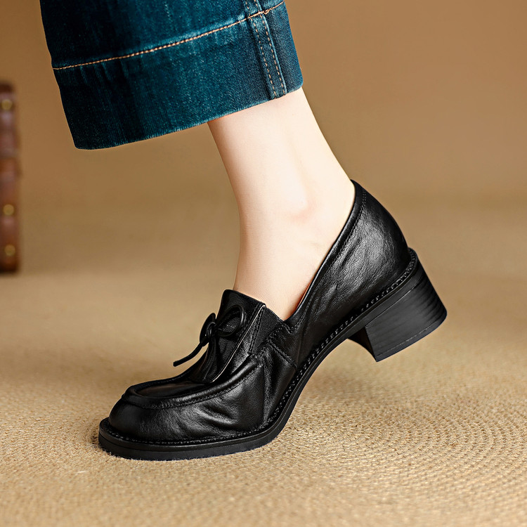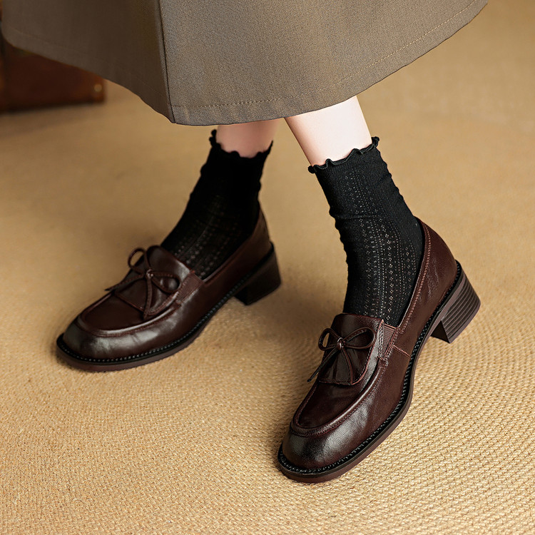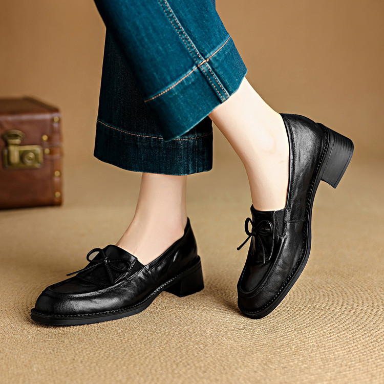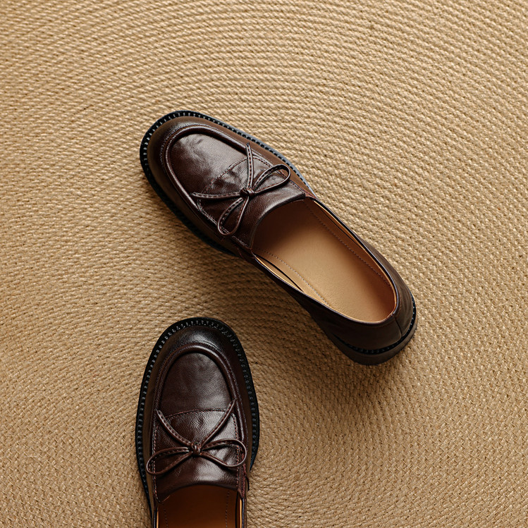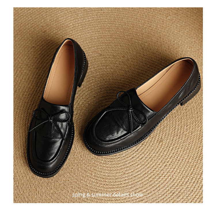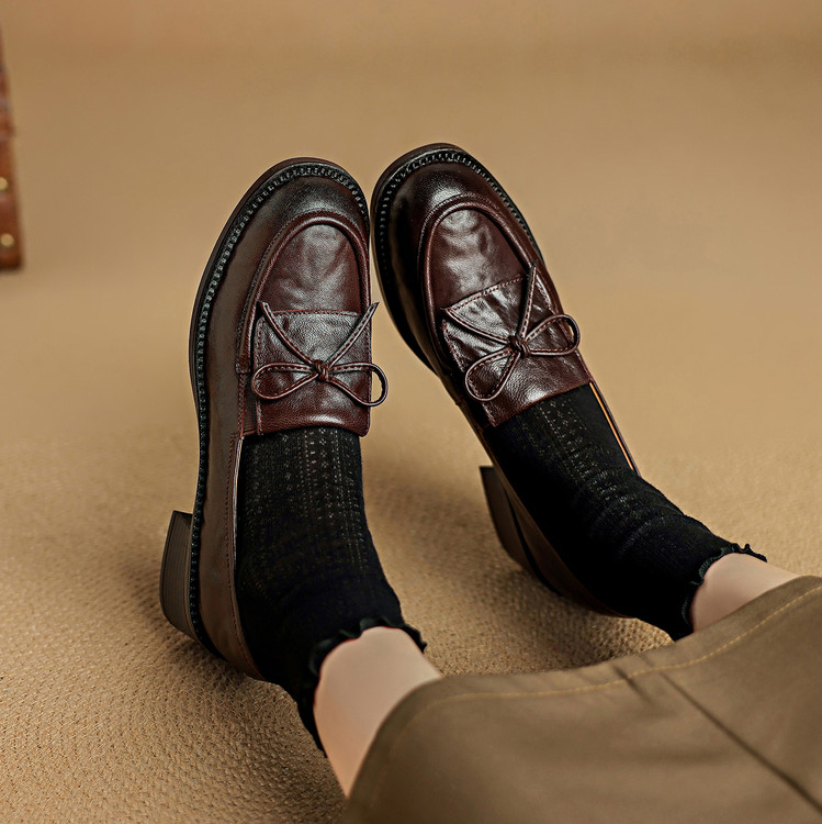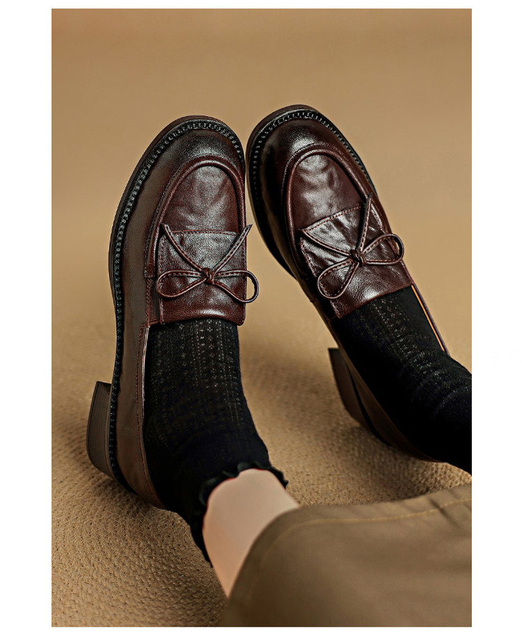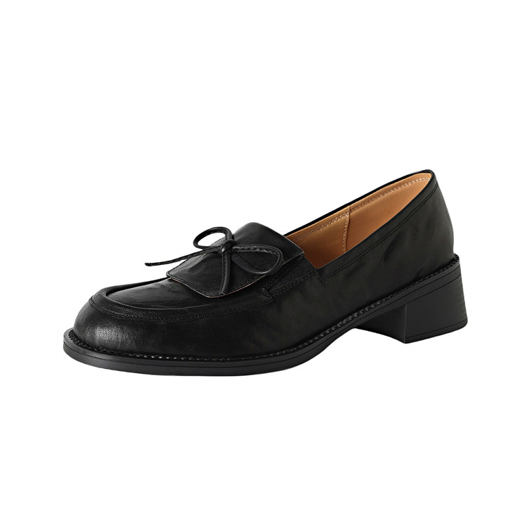 【预售5天】秋季新款羊皮英伦风小皮鞋圆头粗跟单鞋蝴蝶结中粗跟乐福鞋女NJMK&K1722