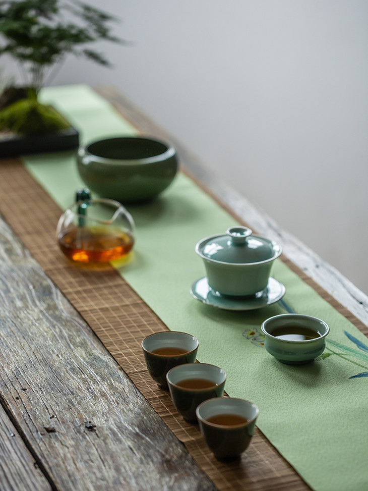 就说该系列茶席,布料上采用聚酯纤维材质,