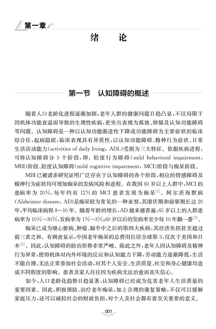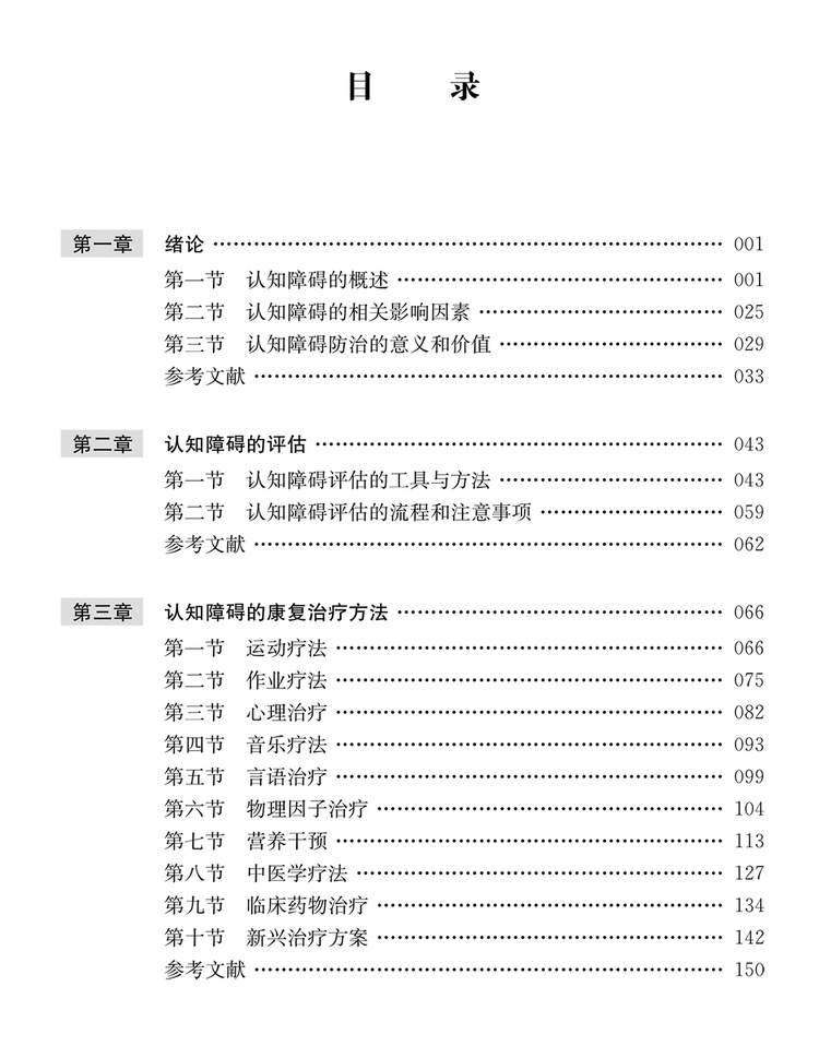 本书参考大量国内外最新的研究成果,在其工作基础上,结合编者团队的科研成果和临床工作经验,采用图文并茂的方式,较为系统化、专业化地介绍了老年人认知障碍的预防与康复。主要从认知障碍的定义、诊断标准、发病机制、影响因素、预防与康复等方面进行阐述,详细讲述了认知障碍的评估指标,并分别从运动疗法、作业疗法、心理治疗、音乐疗法、言语治疗、物理因子治疗、营养干预、中医学疗法、临床药物治疗及新兴治疗方案等方面具体讲解了认知障碍的康复治疗方法,注重实用性内容和进展内容的有机结合。