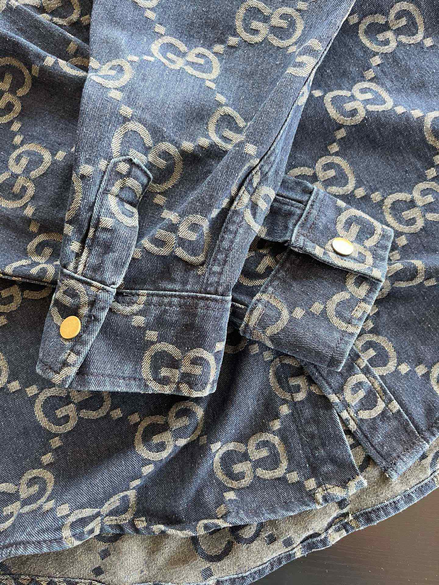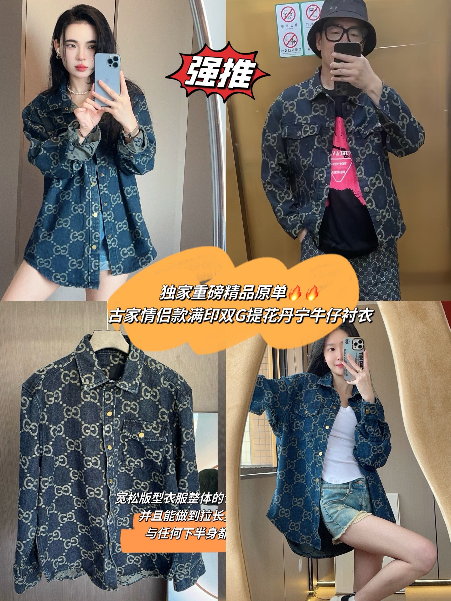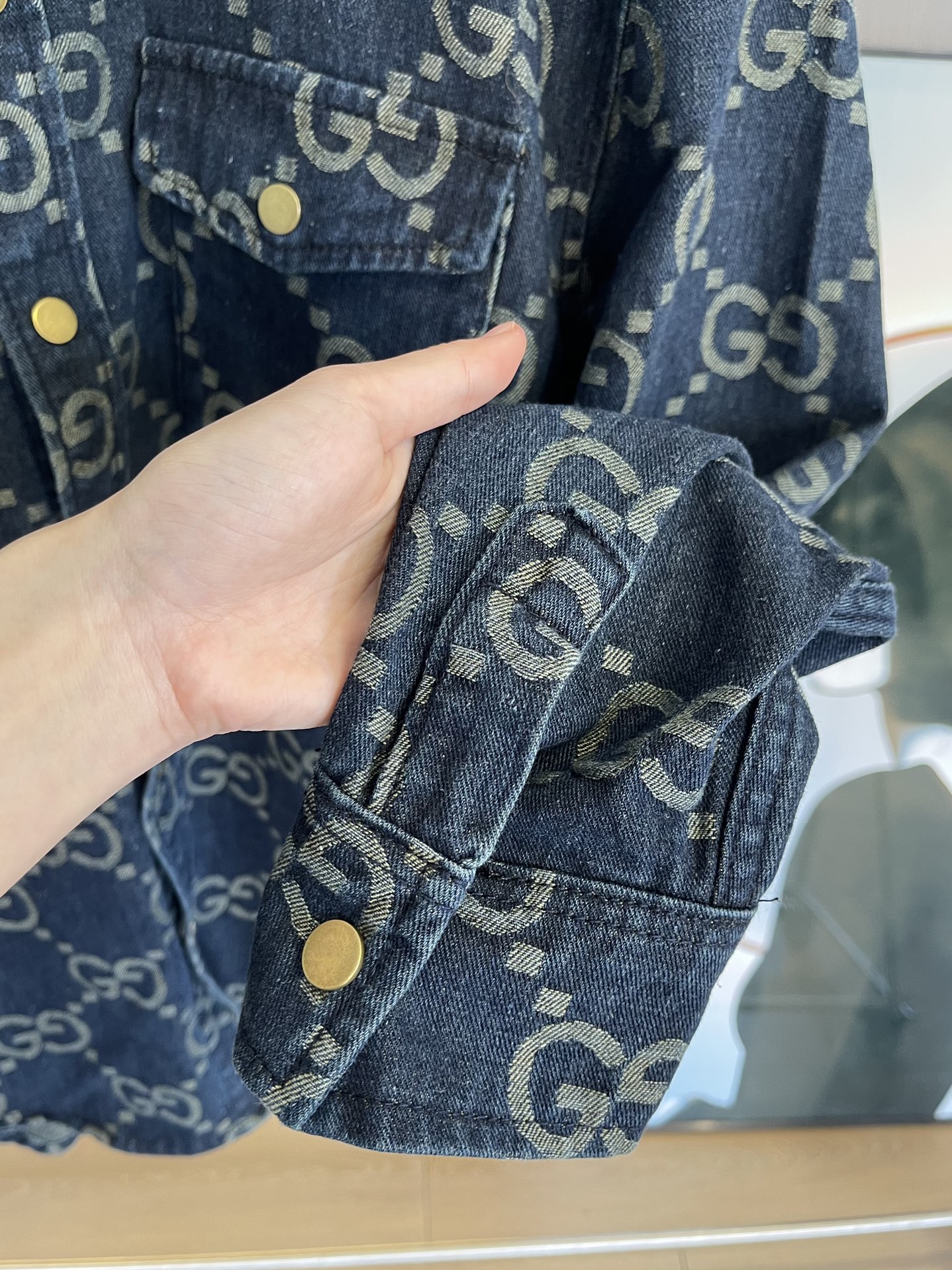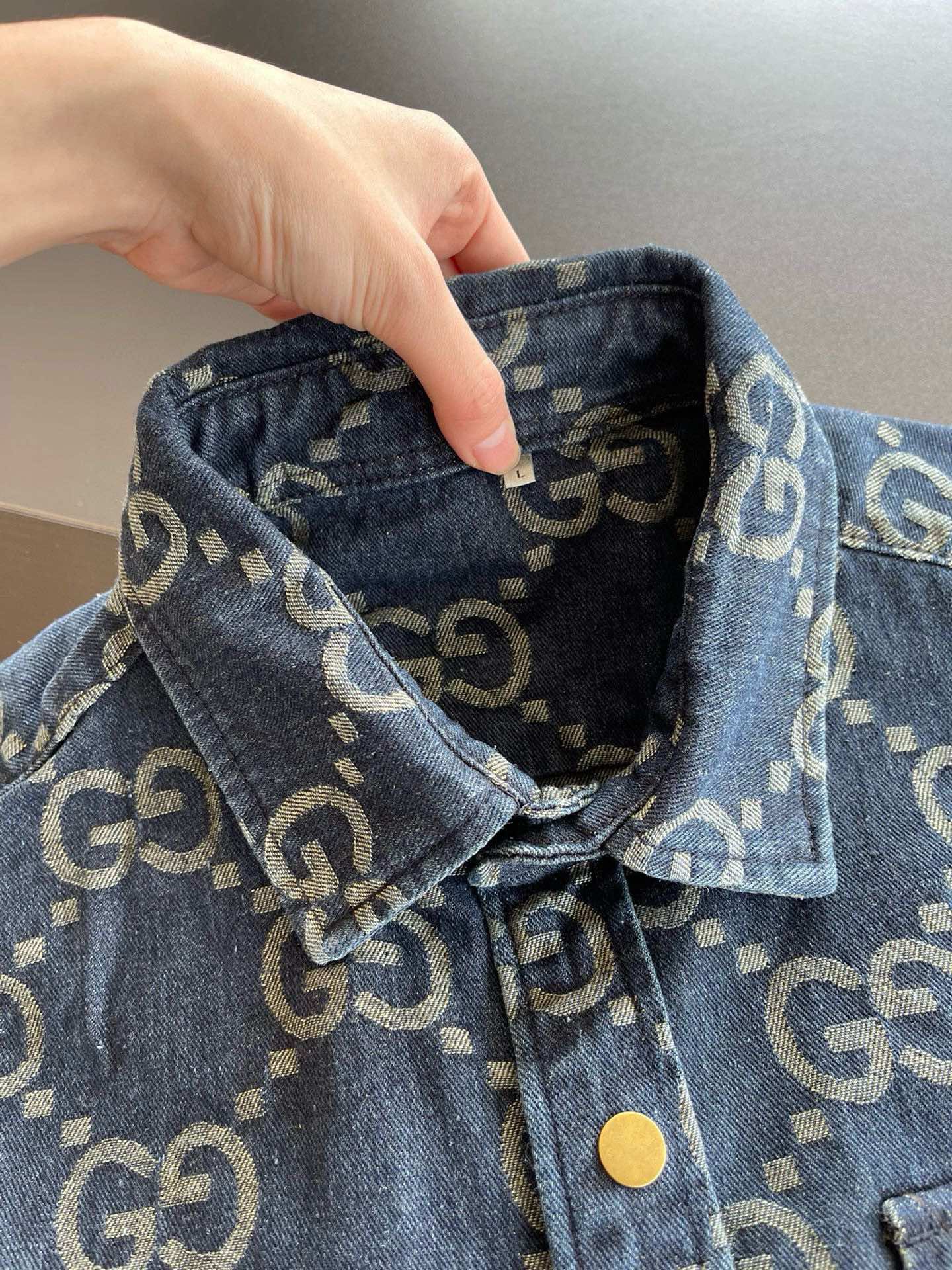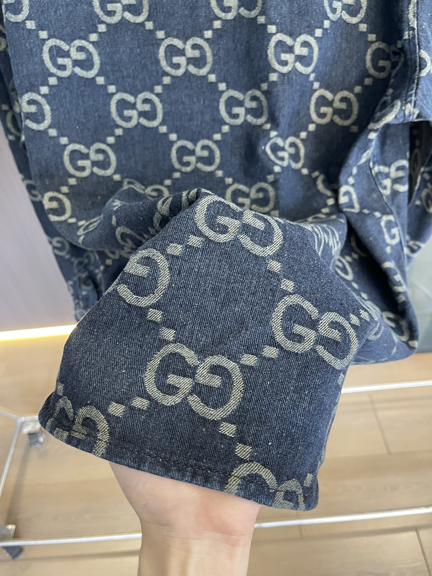 独家重磅精品原单 古家情侣款满印双G提花丹宁牛仔衬衣夹克外套,满印果然经典多久都不会过时的男女同款很好穿,满身老花水洗工艺经典时尚,里面搭个T恤或者短裤都好看,这种穿搭风格 回头率满满 感觉直接拿捏住!,扣子无LOGO(正码正拍)