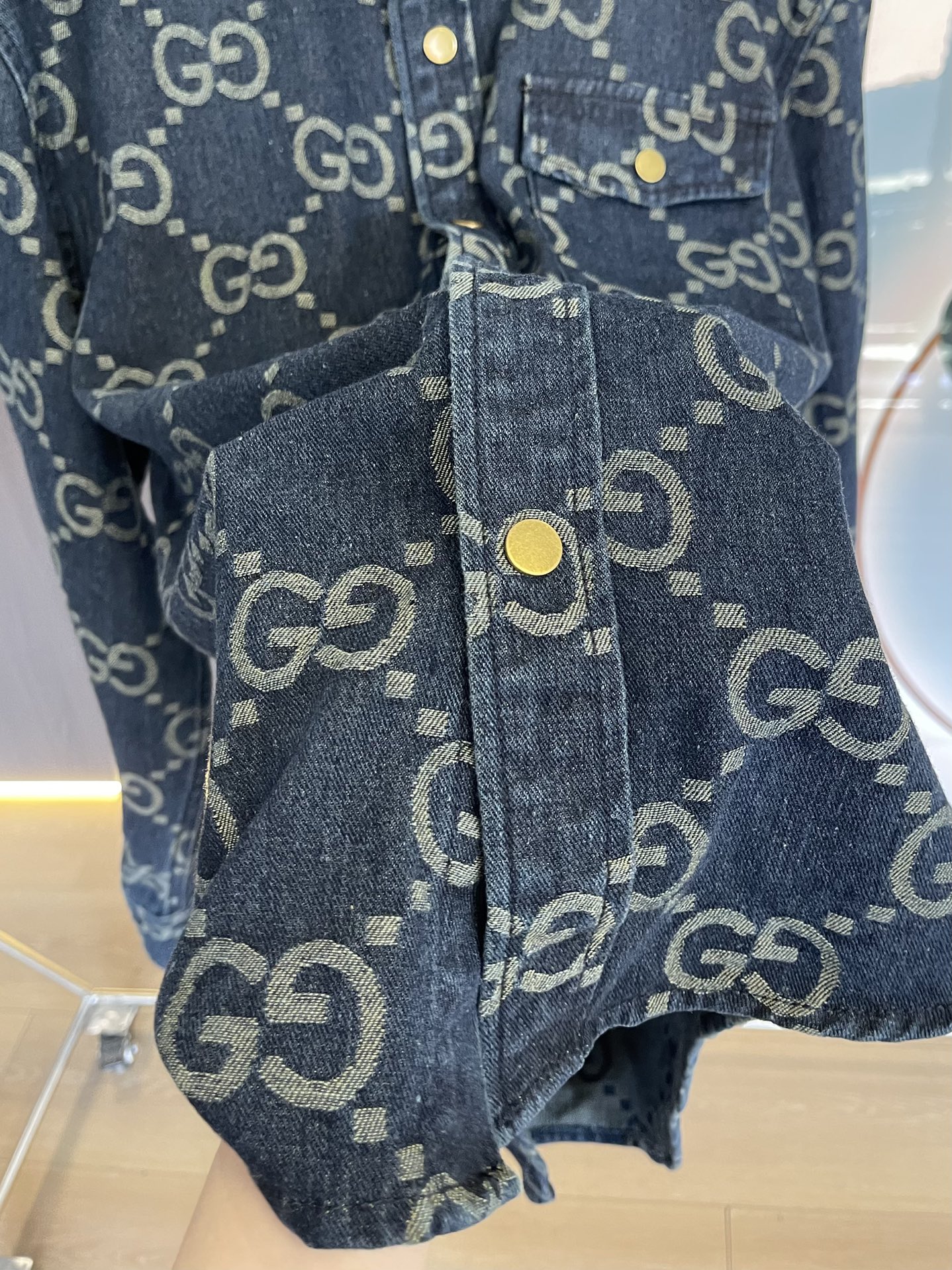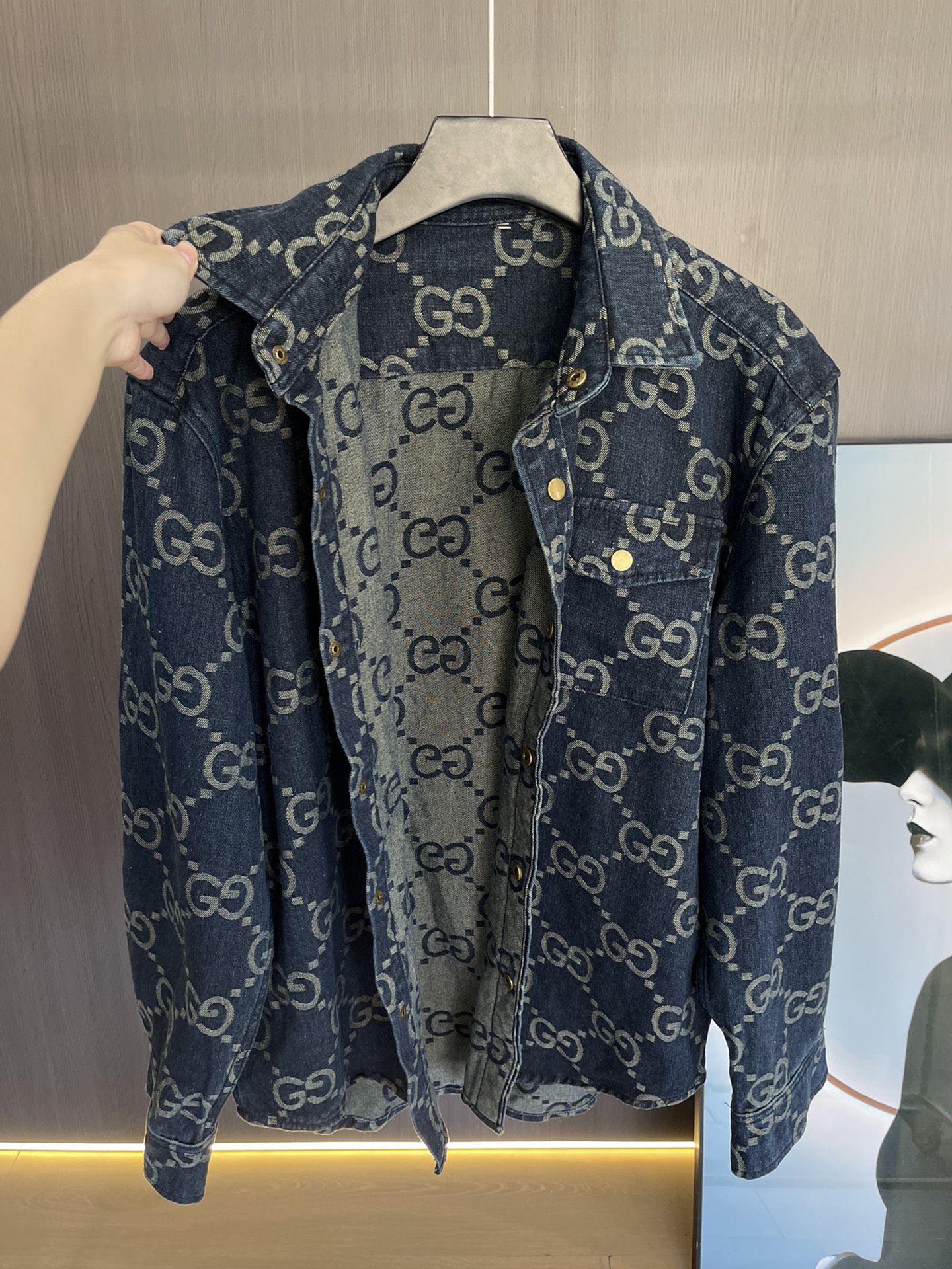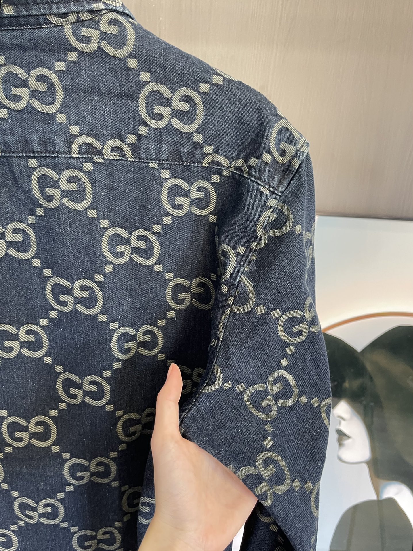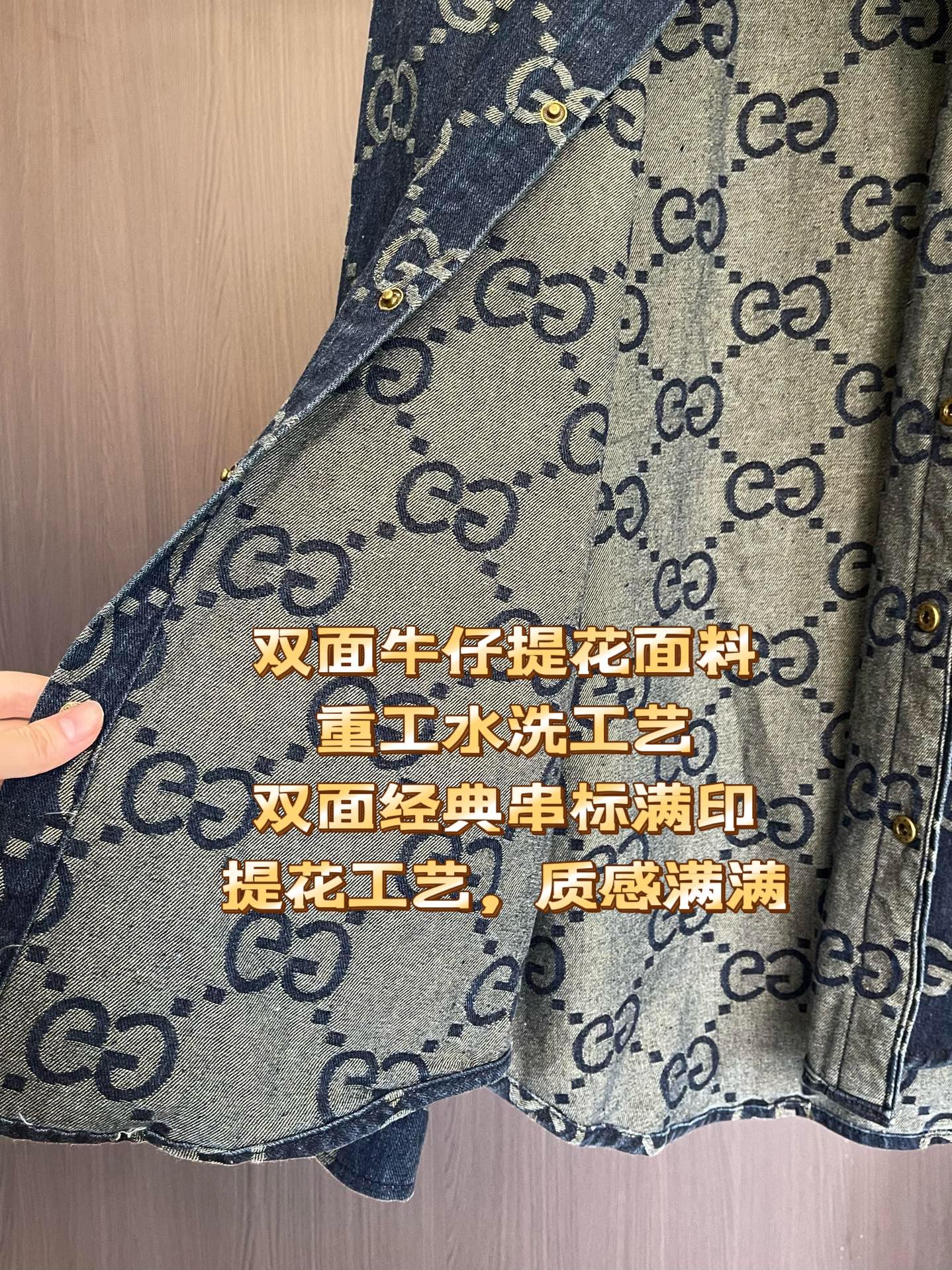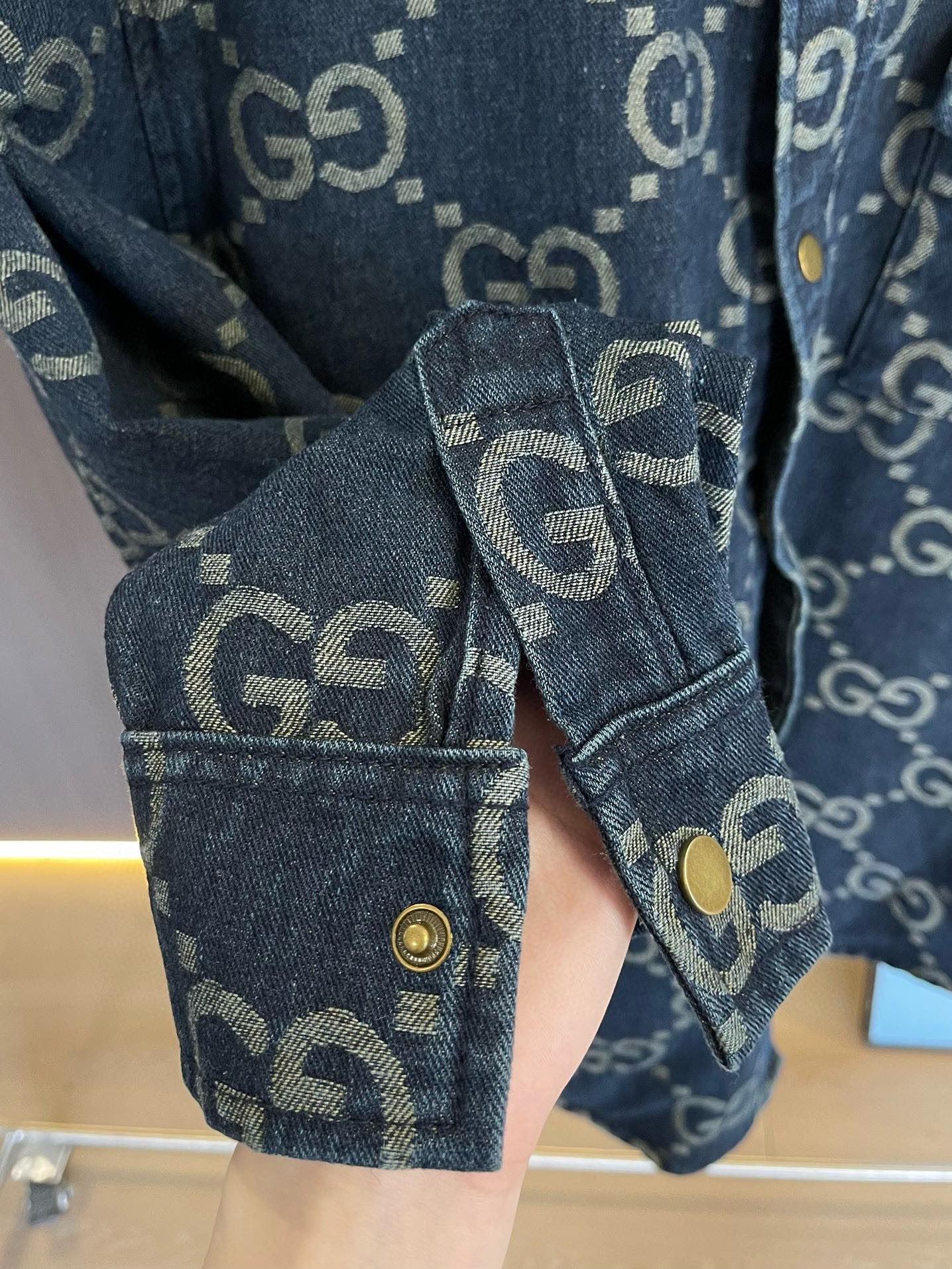 独家重磅精品原单 古家情侣款满印双G提花丹宁牛仔衬衣夹克外套,满印果然经典多久都不会过时的男女同款很好穿,满身老花水洗工艺经典时尚,里面搭个T恤或者短裤都好看,这种穿搭风格 回头率满满 感觉直接拿捏住!,扣子无LOGO(正码正拍)