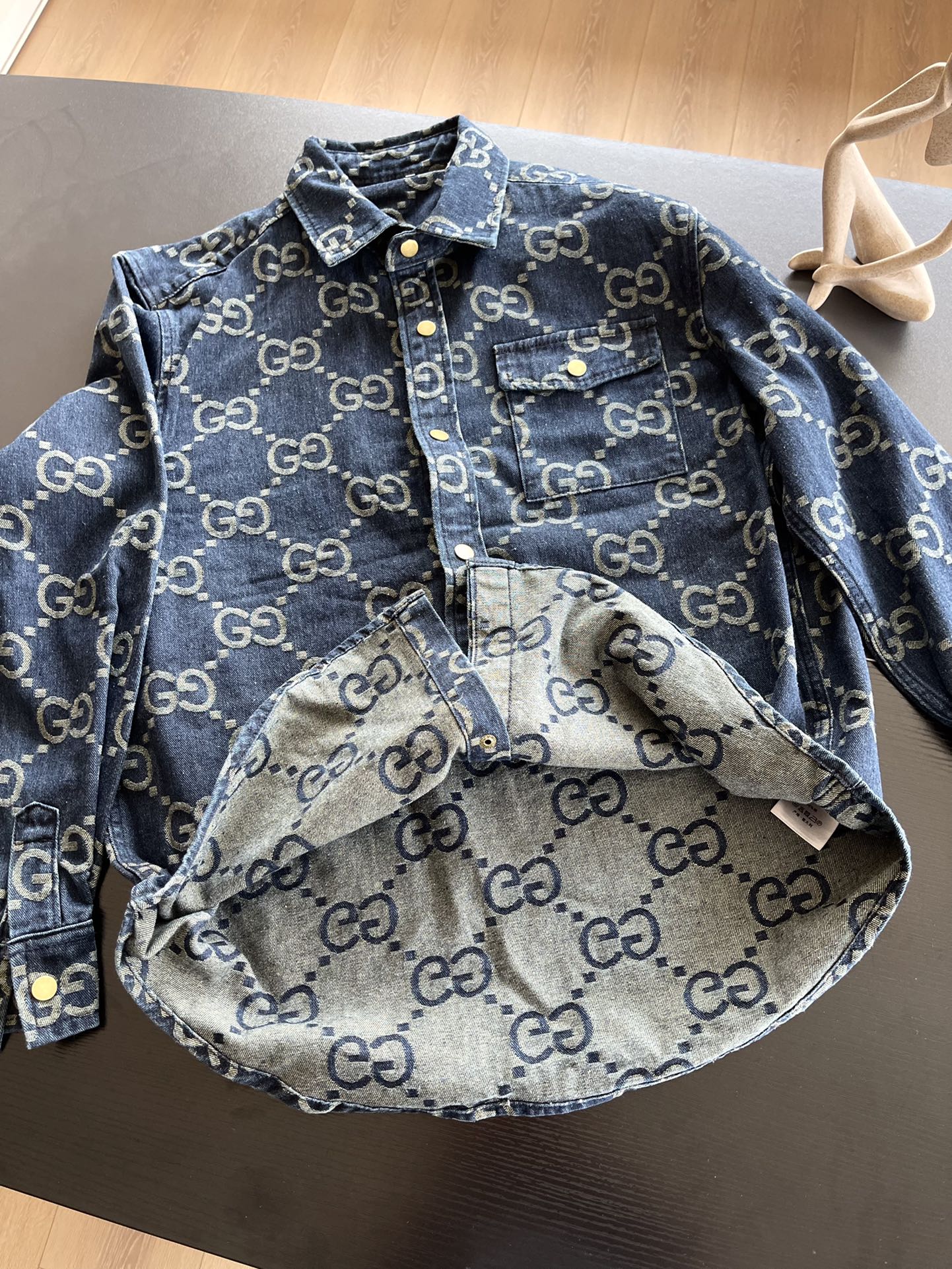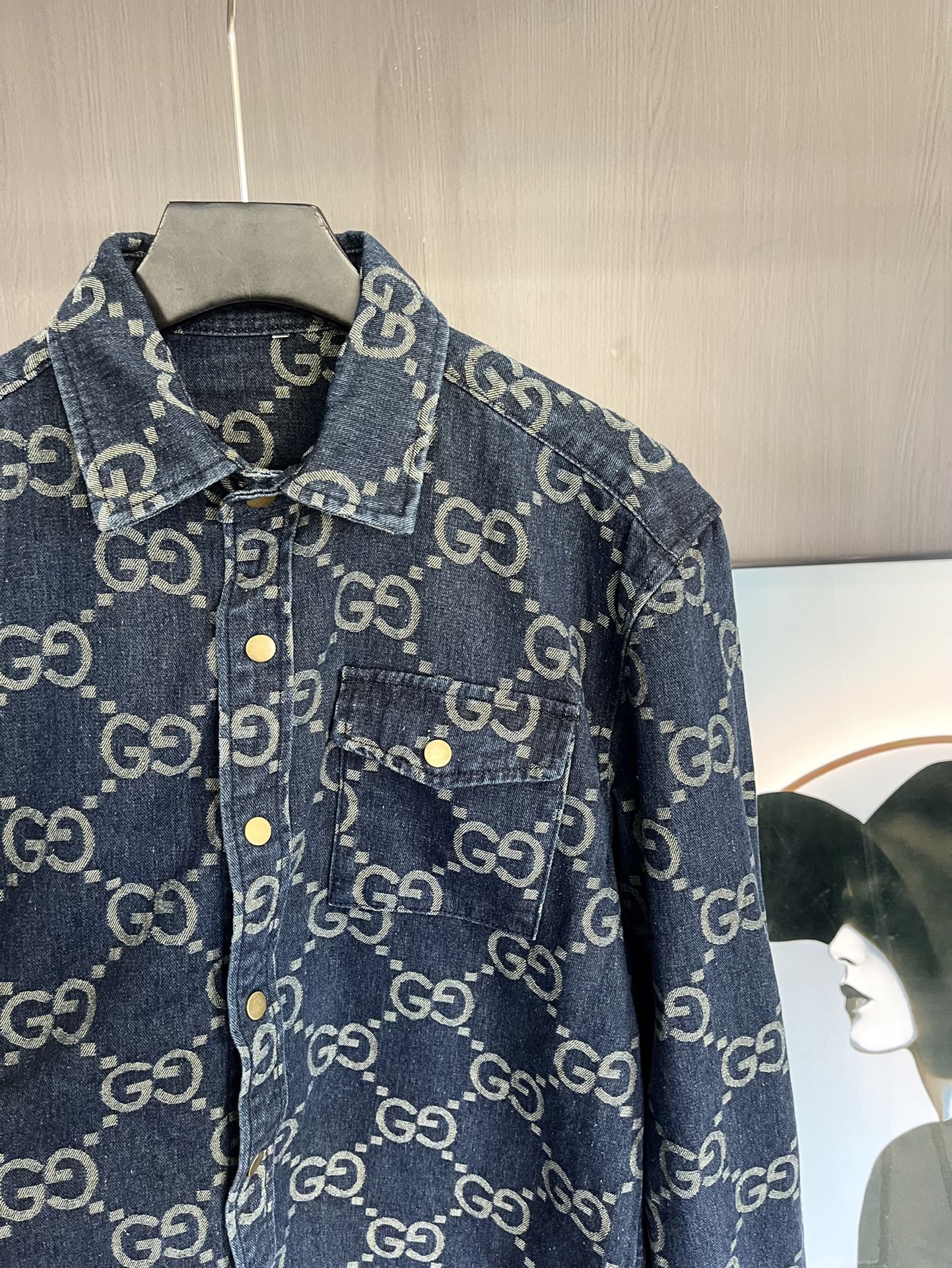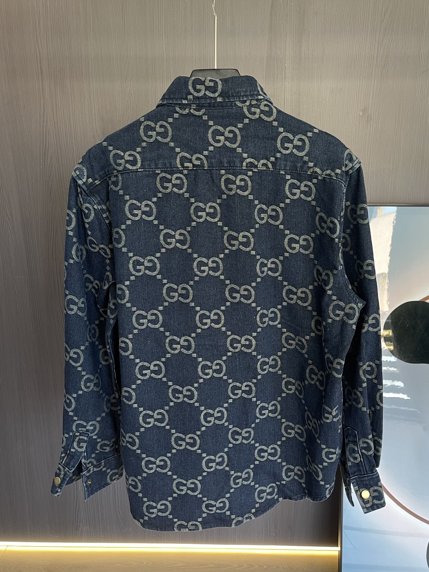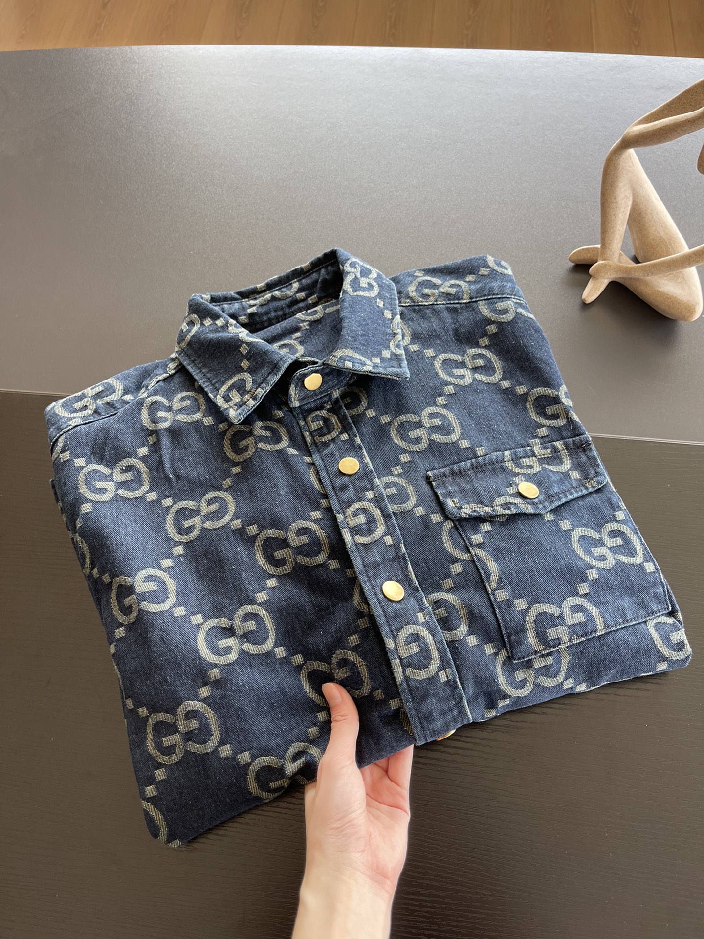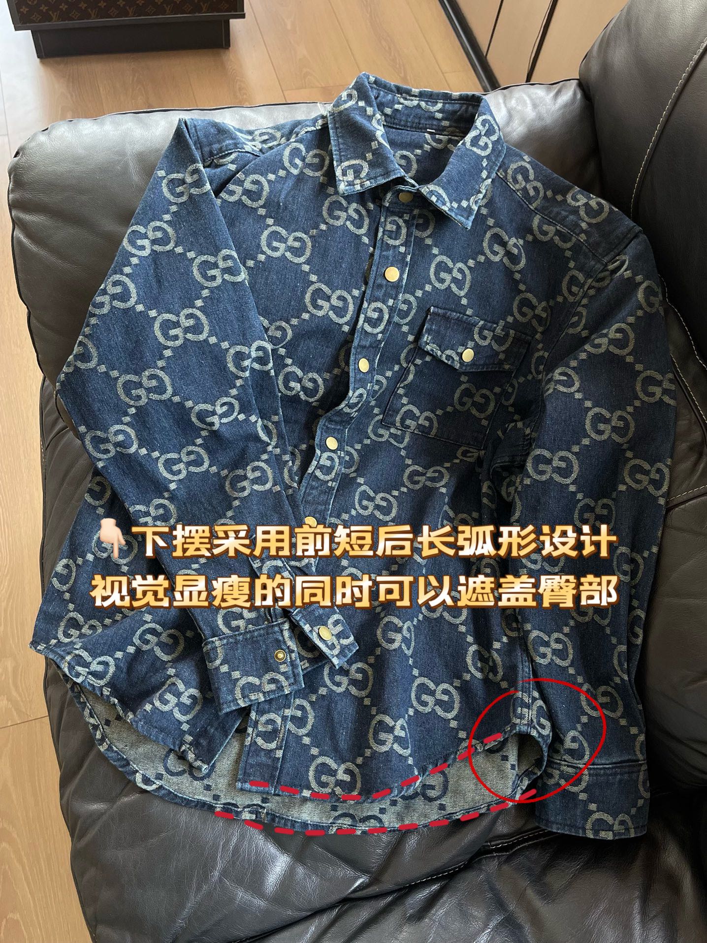独家重磅精品原单 古家情侣款满印双G提花丹宁牛仔衬衣夹克外套,满印果然经典多久都不会过时的男女同款很好穿,满身老花水洗工艺经典时尚,里面搭个T恤或者短裤都好看,这种穿搭风格 回头率满满 感觉直接拿捏住!,扣子无LOGO(正码正拍)