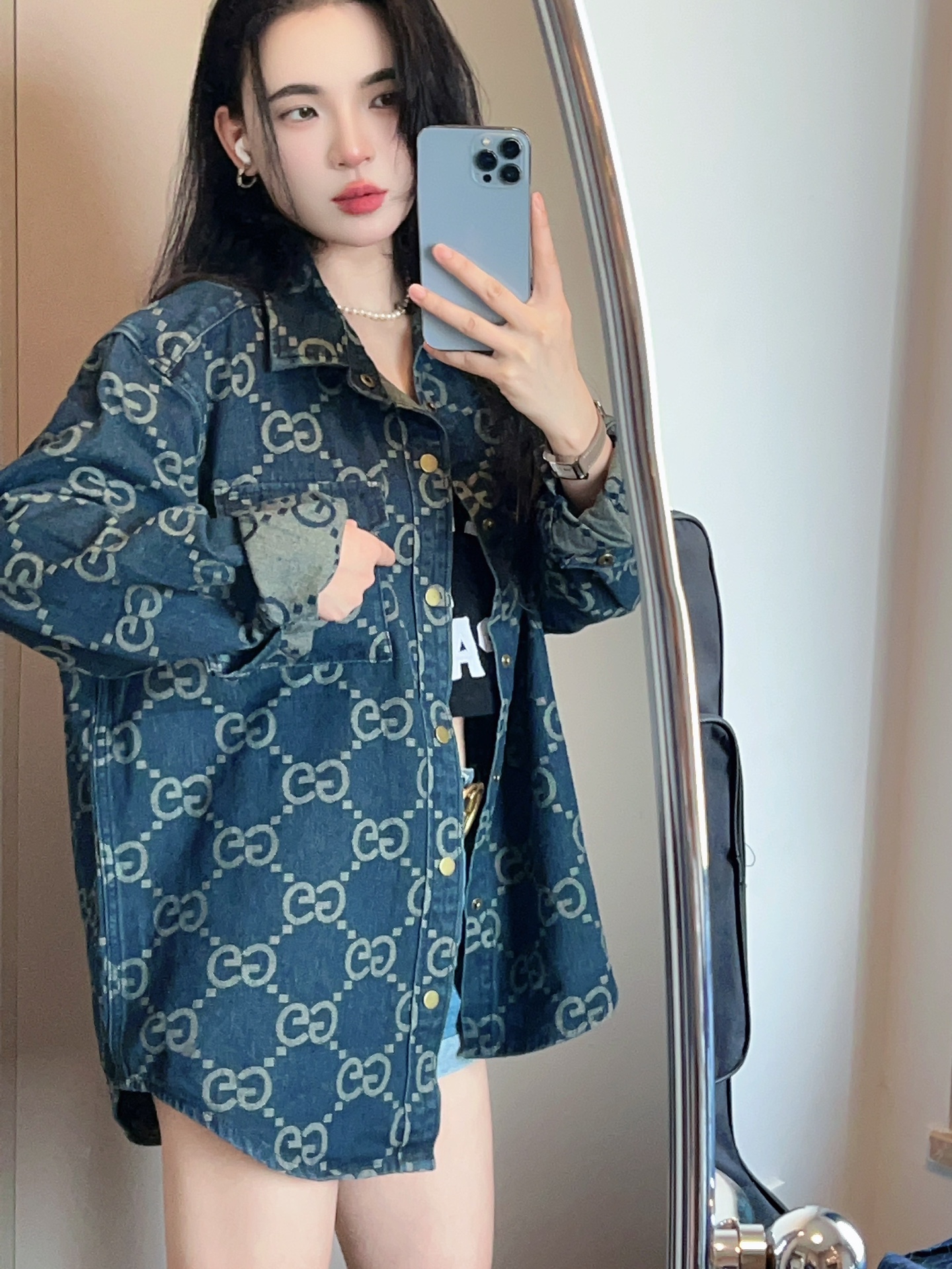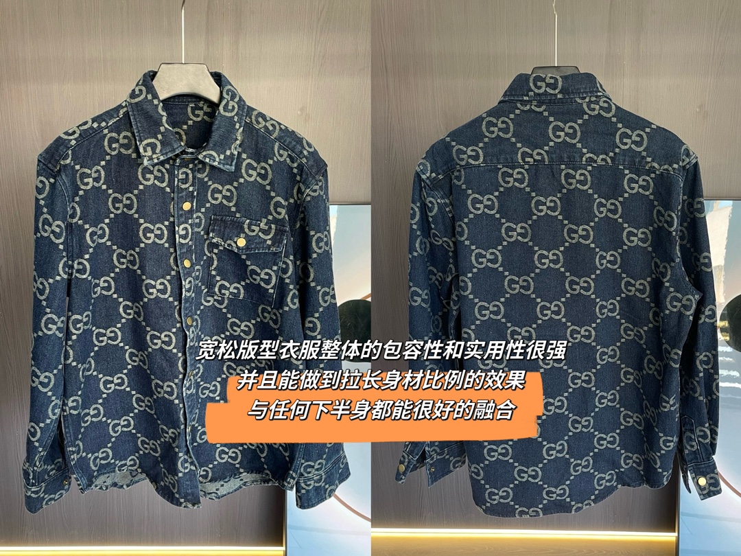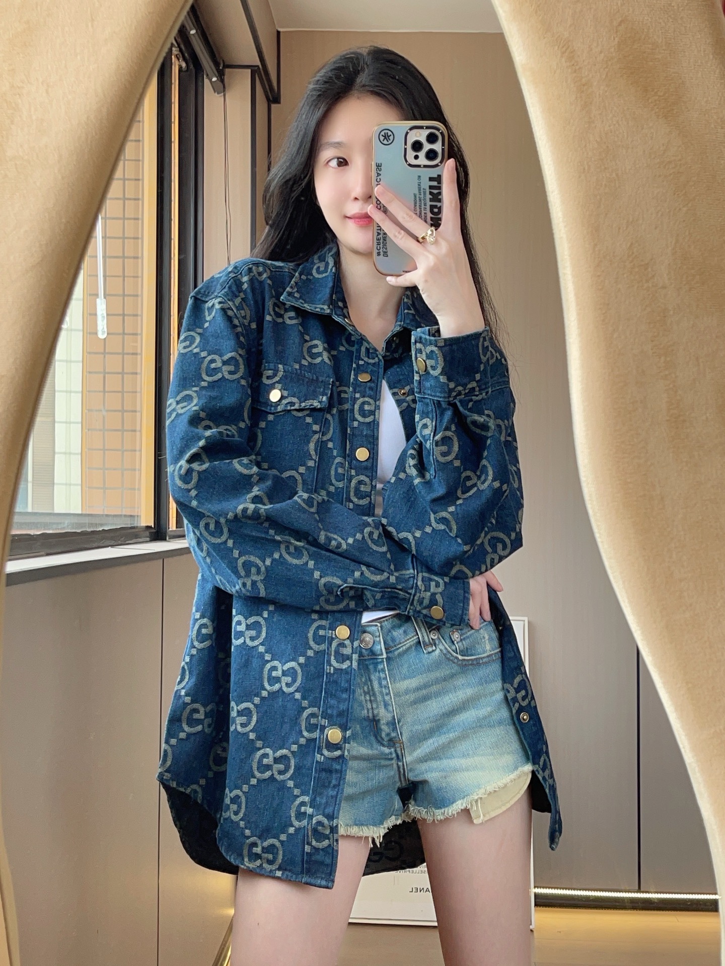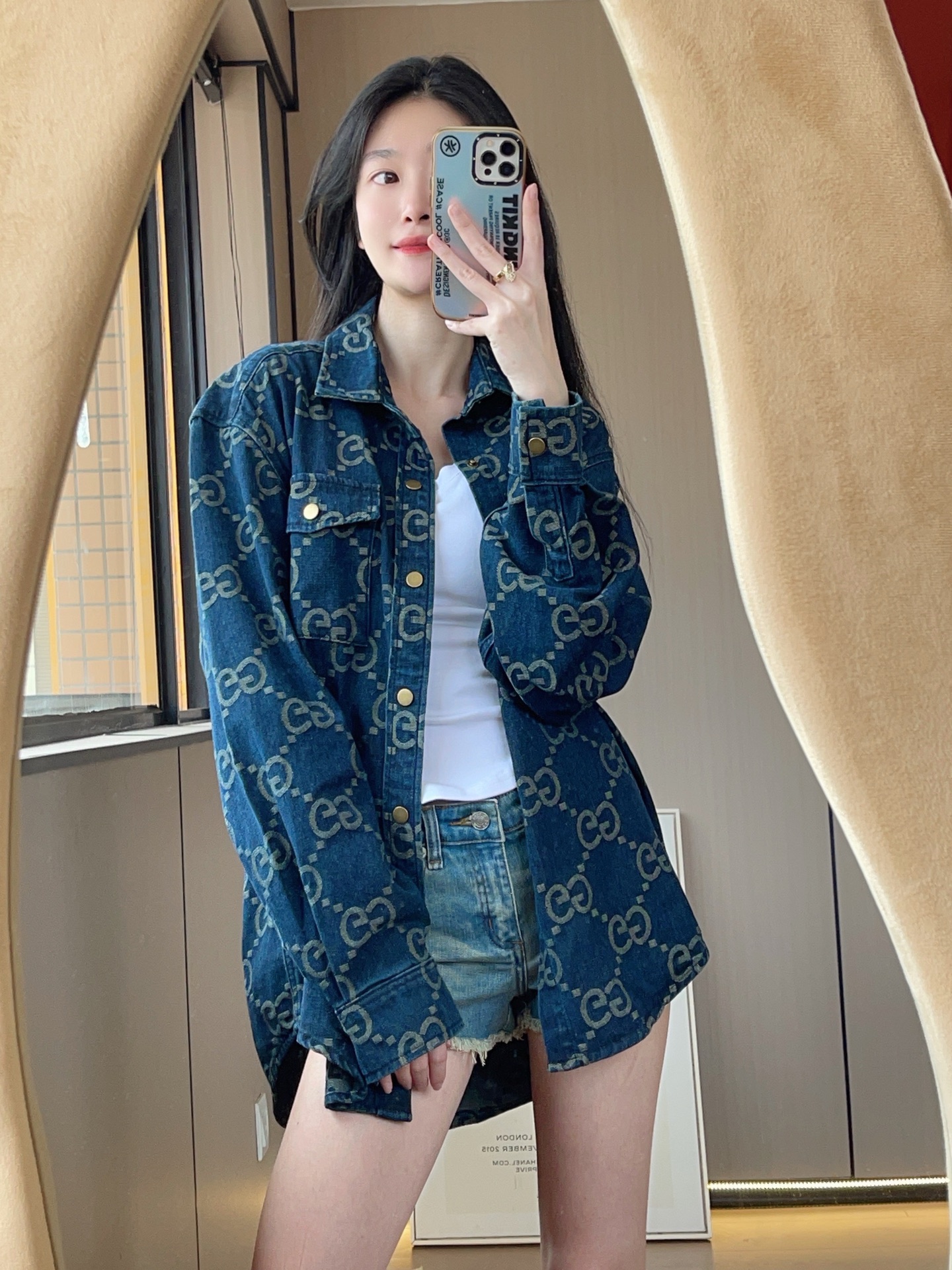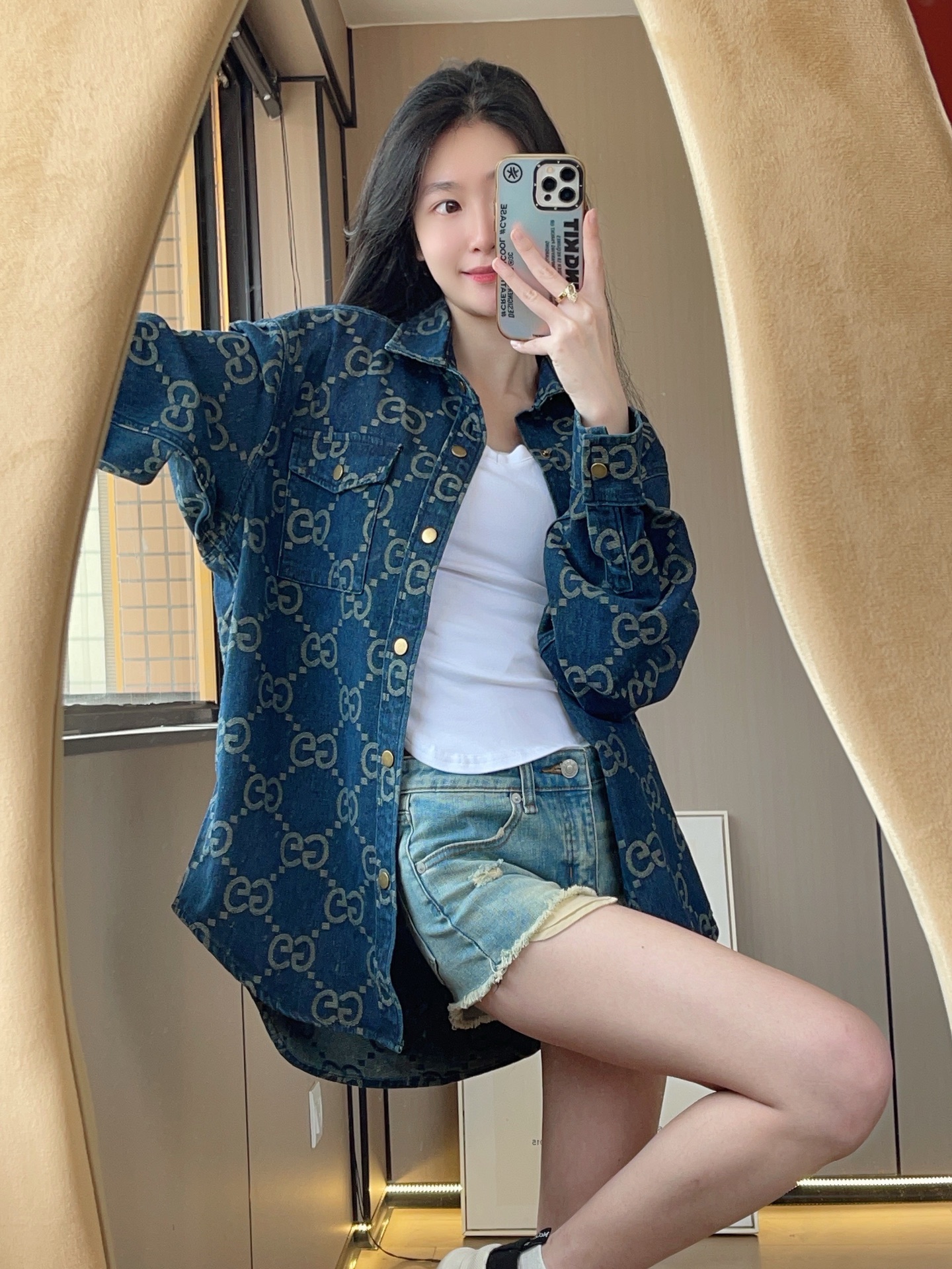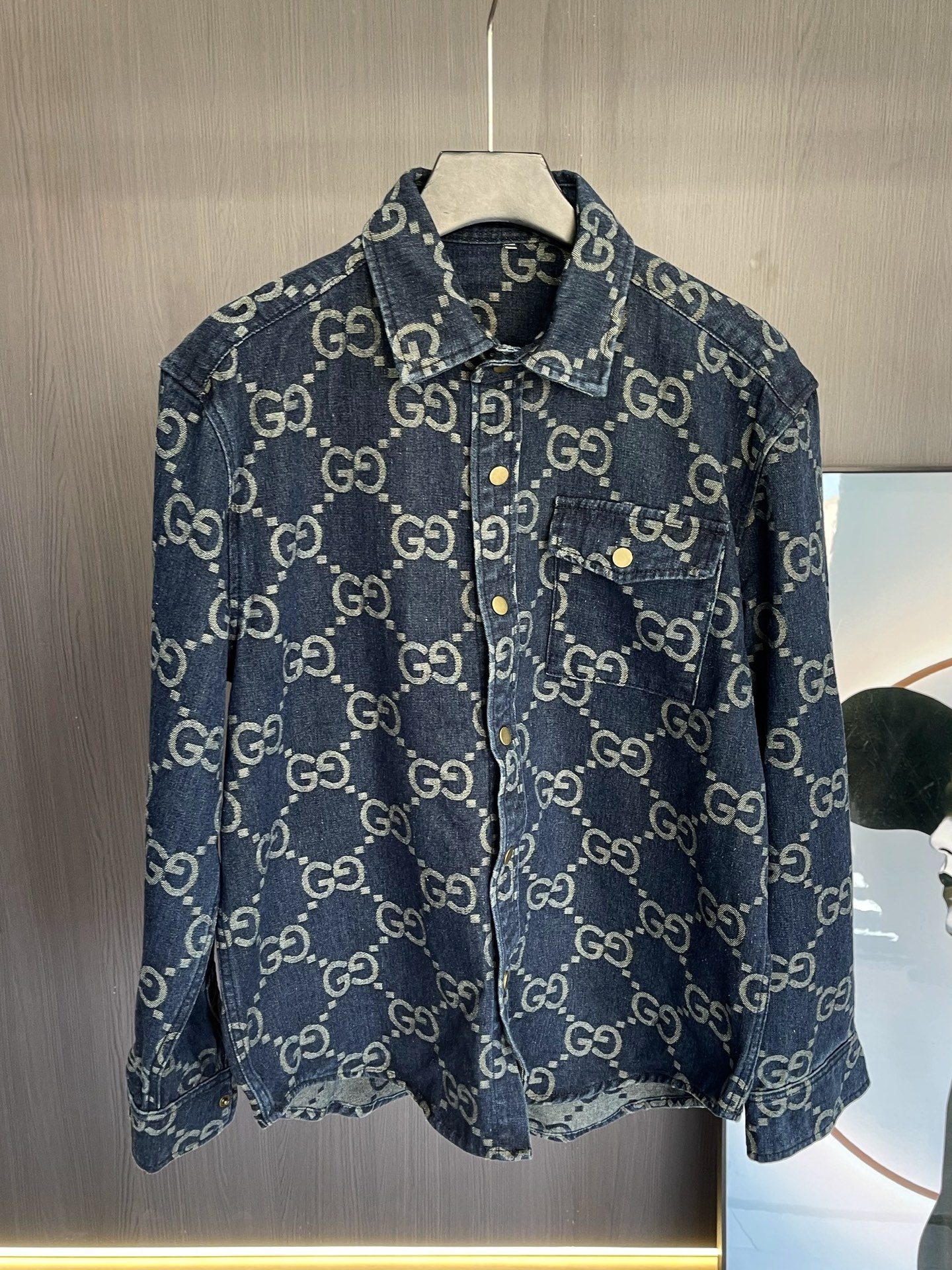 独家重磅精品原单 古家情侣款满印双G提花丹宁牛仔衬衣夹克外套,满印果然经典多久都不会过时的男女同款很好穿,满身老花水洗工艺经典时尚,里面搭个T恤或者短裤都好看,这种穿搭风格 回头率满满 感觉直接拿捏住!,扣子无LOGO(正码正拍)