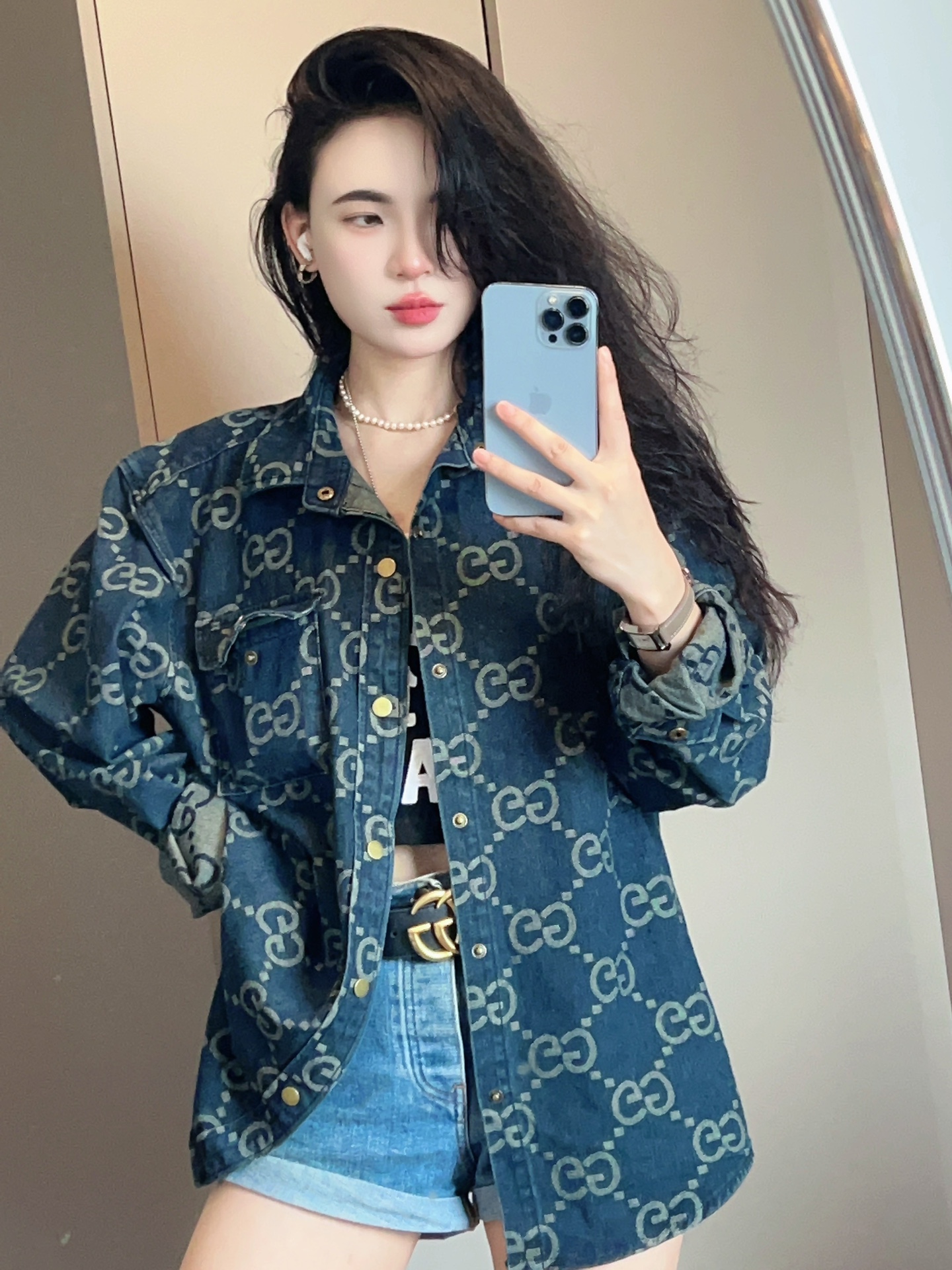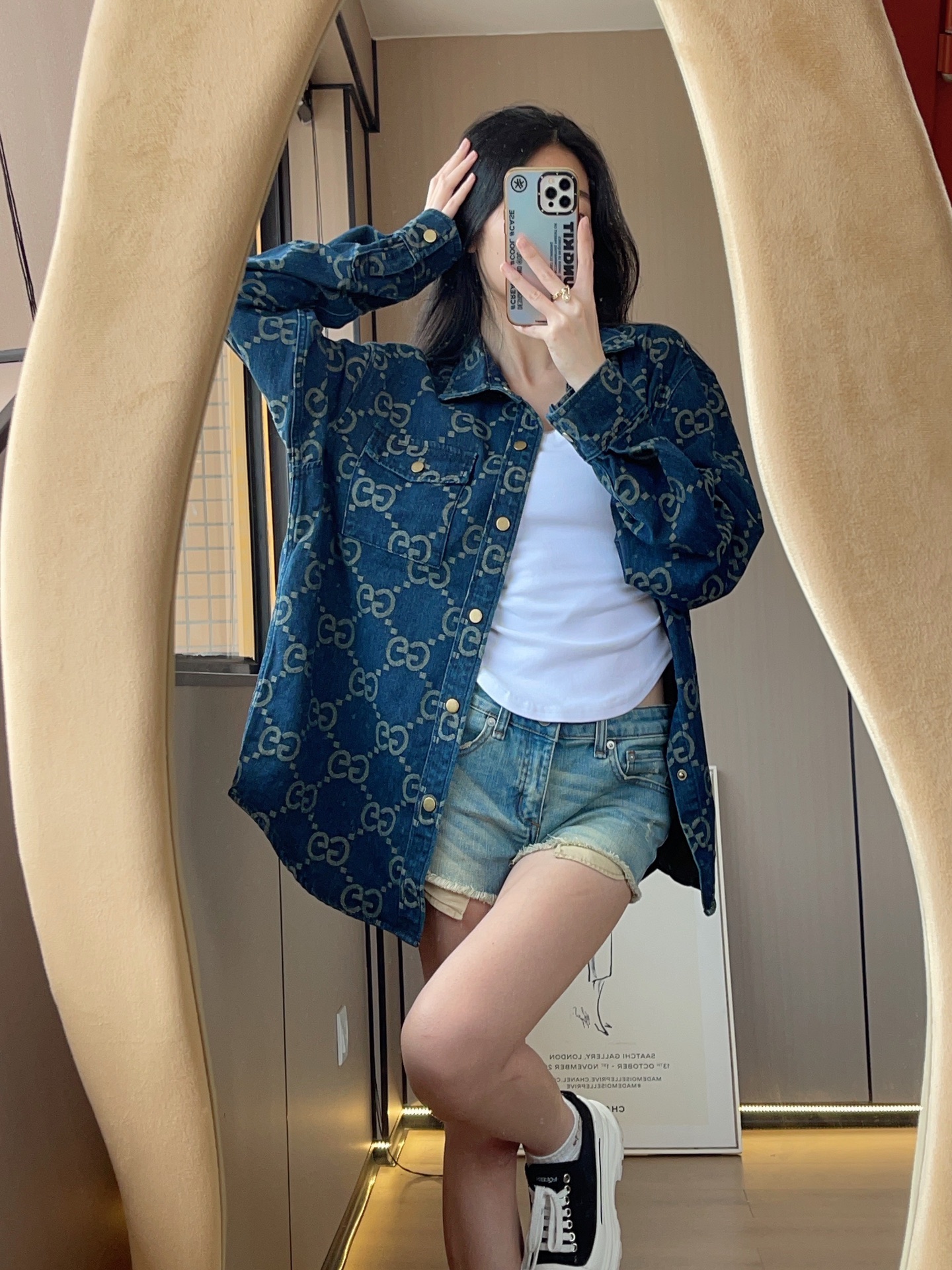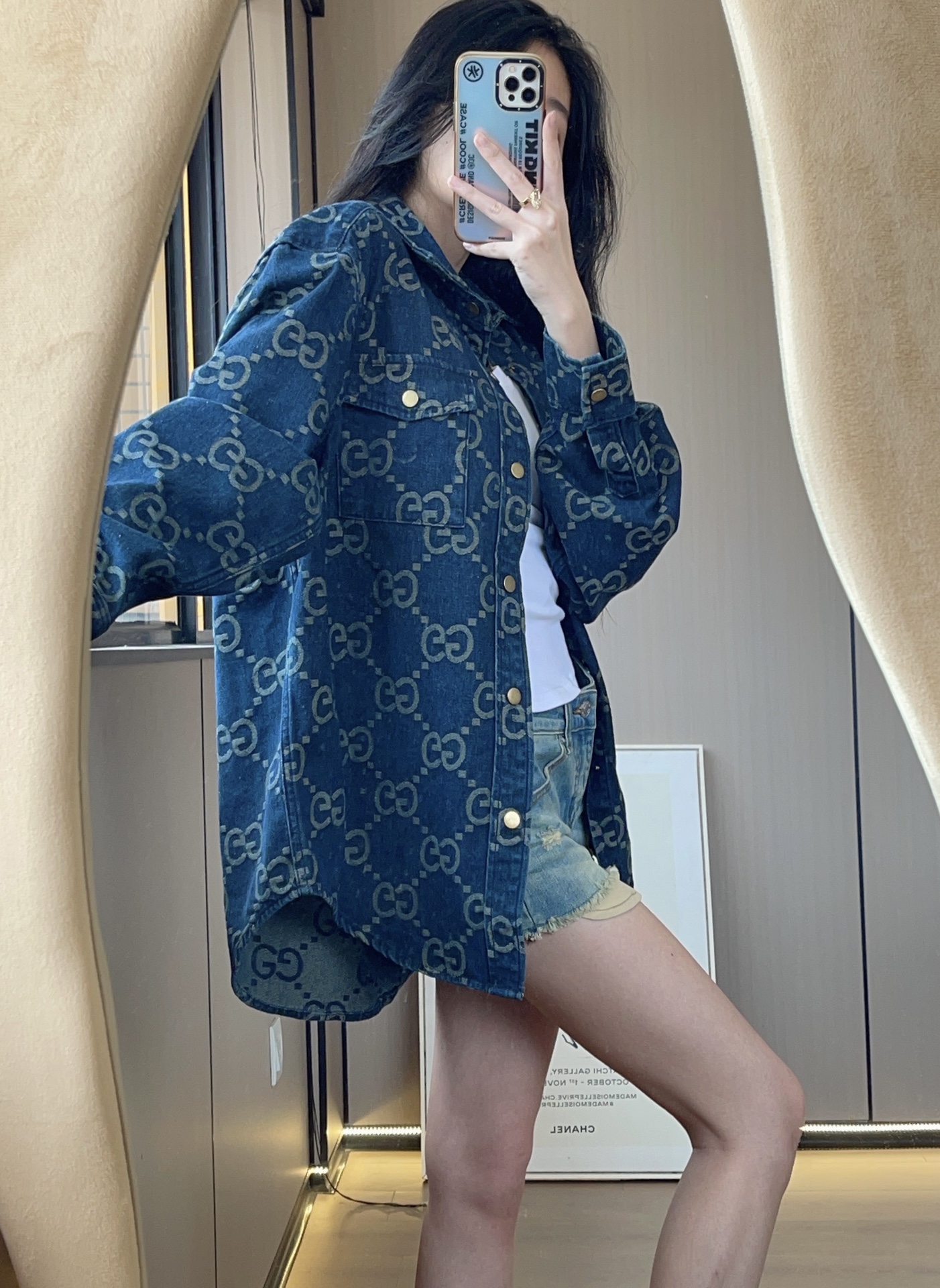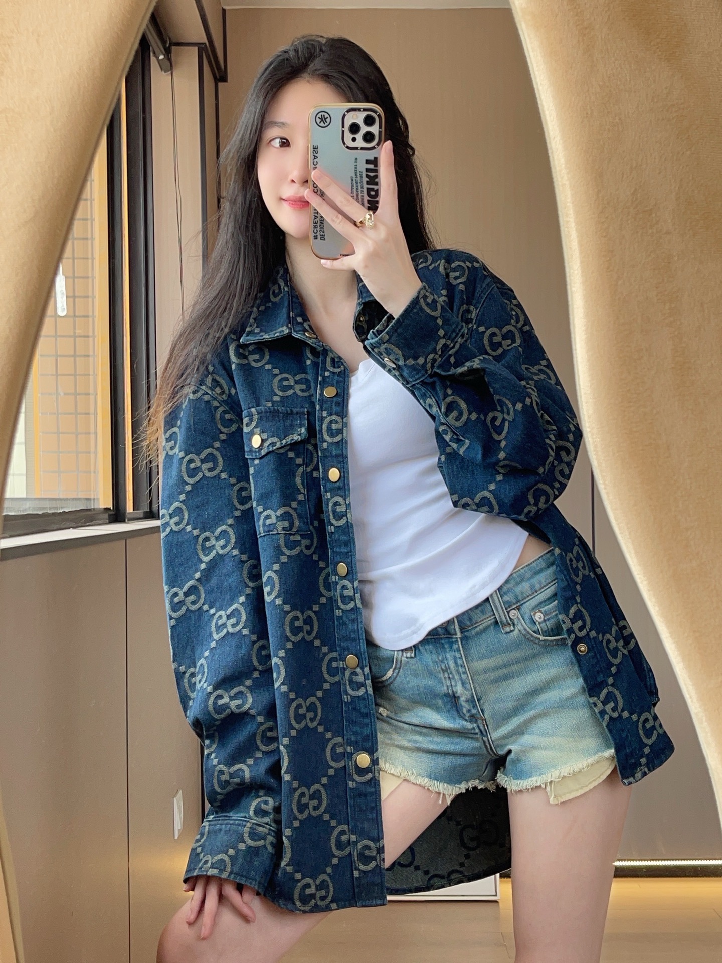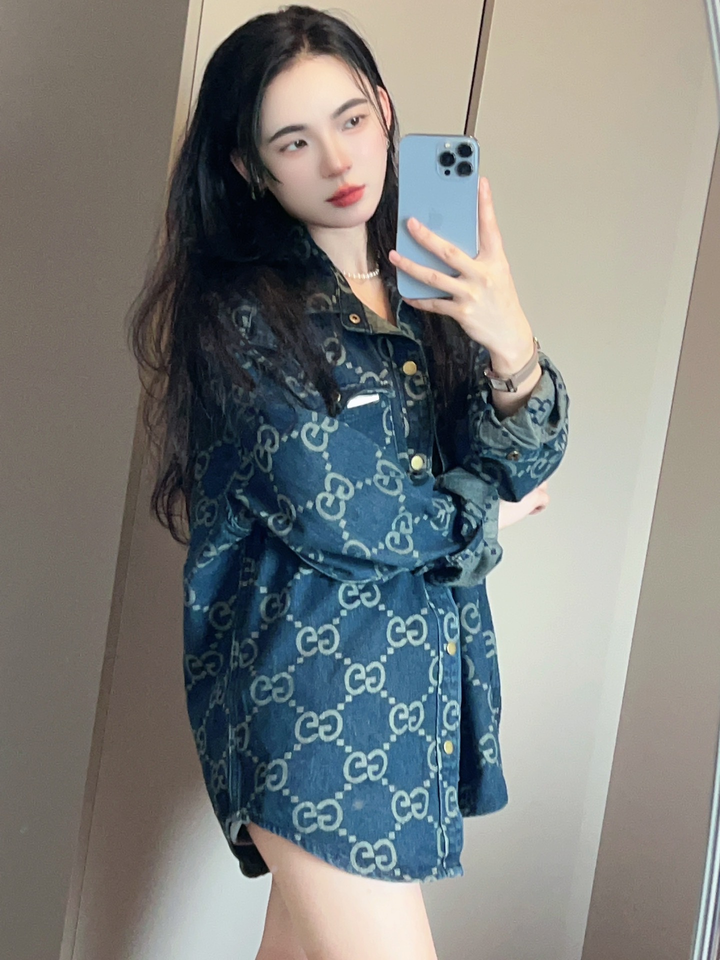 独家重磅精品原单 古家情侣款满印双G提花丹宁牛仔衬衣夹克外套,满印果然经典多久都不会过时的男女同款很好穿,满身老花水洗工艺经典时尚,里面搭个T恤或者短裤都好看,这种穿搭风格 回头率满满 感觉直接拿捏住!,扣子无LOGO(正码正拍)