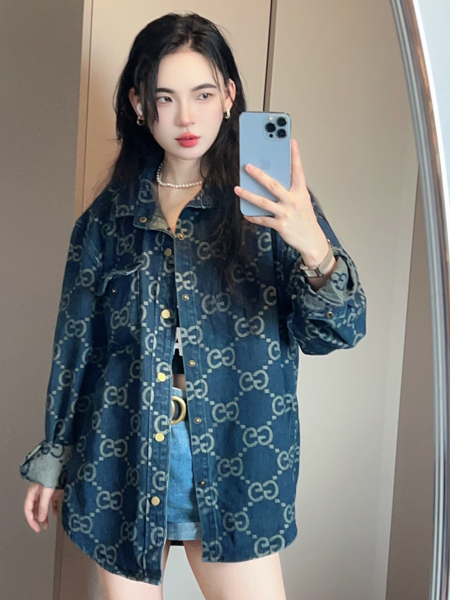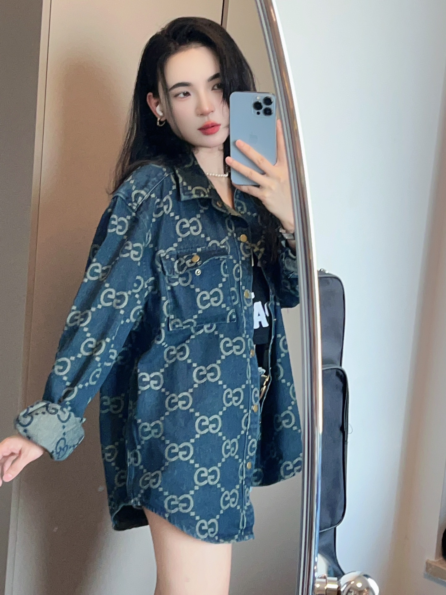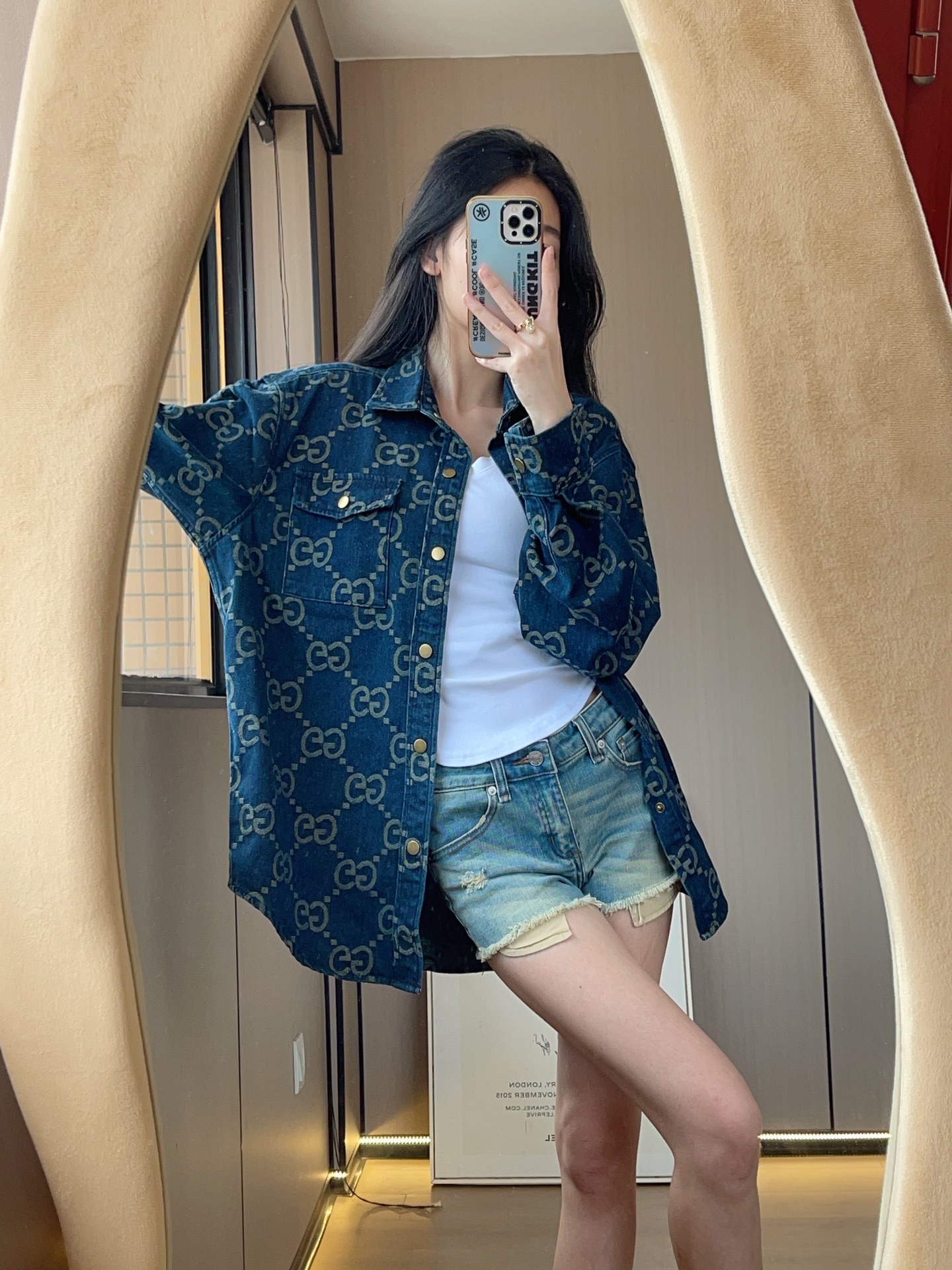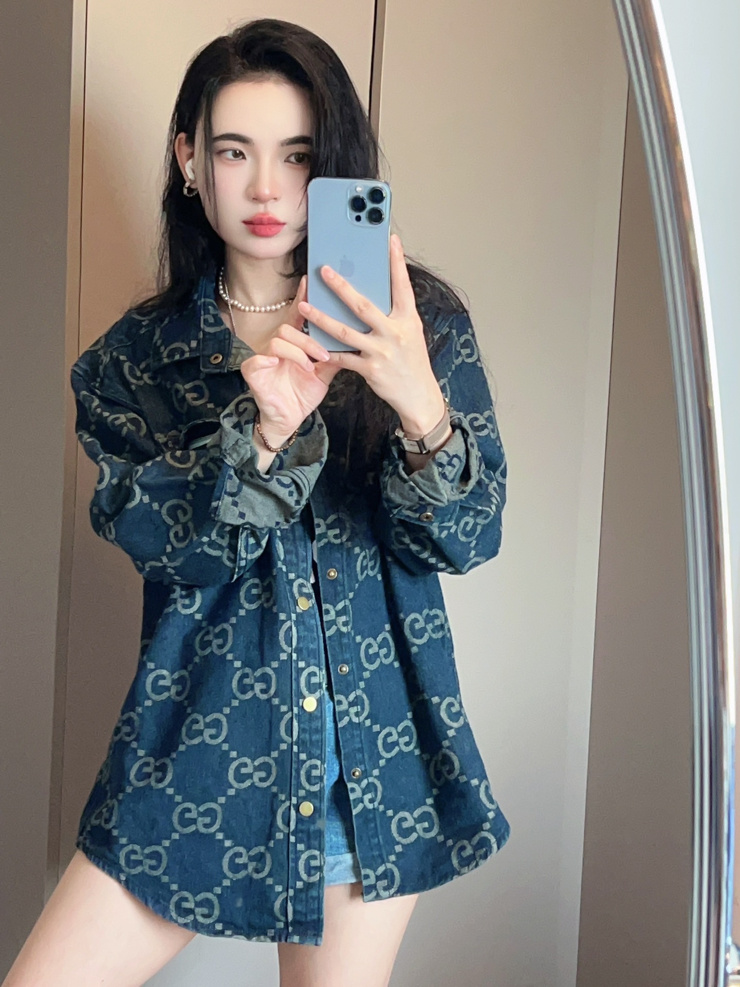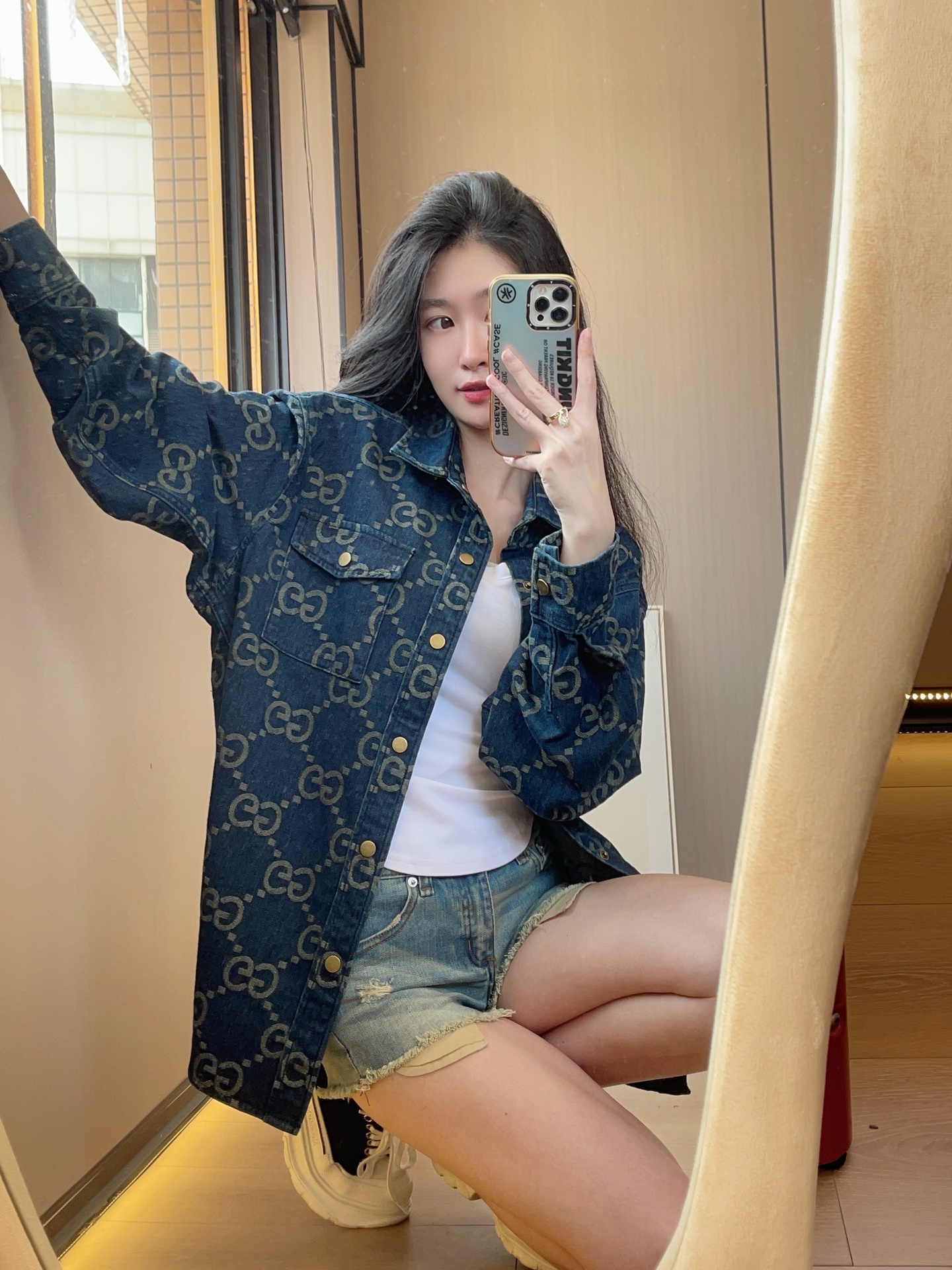 独家重磅精品原单 古家情侣款满印双G提花丹宁牛仔衬衣夹克外套,满印果然经典多久都不会过时的男女同款很好穿,满身老花水洗工艺经典时尚,里面搭个T恤或者短裤都好看,这种穿搭风格 回头率满满 感觉直接拿捏住!,扣子无LOGO(正码正拍)