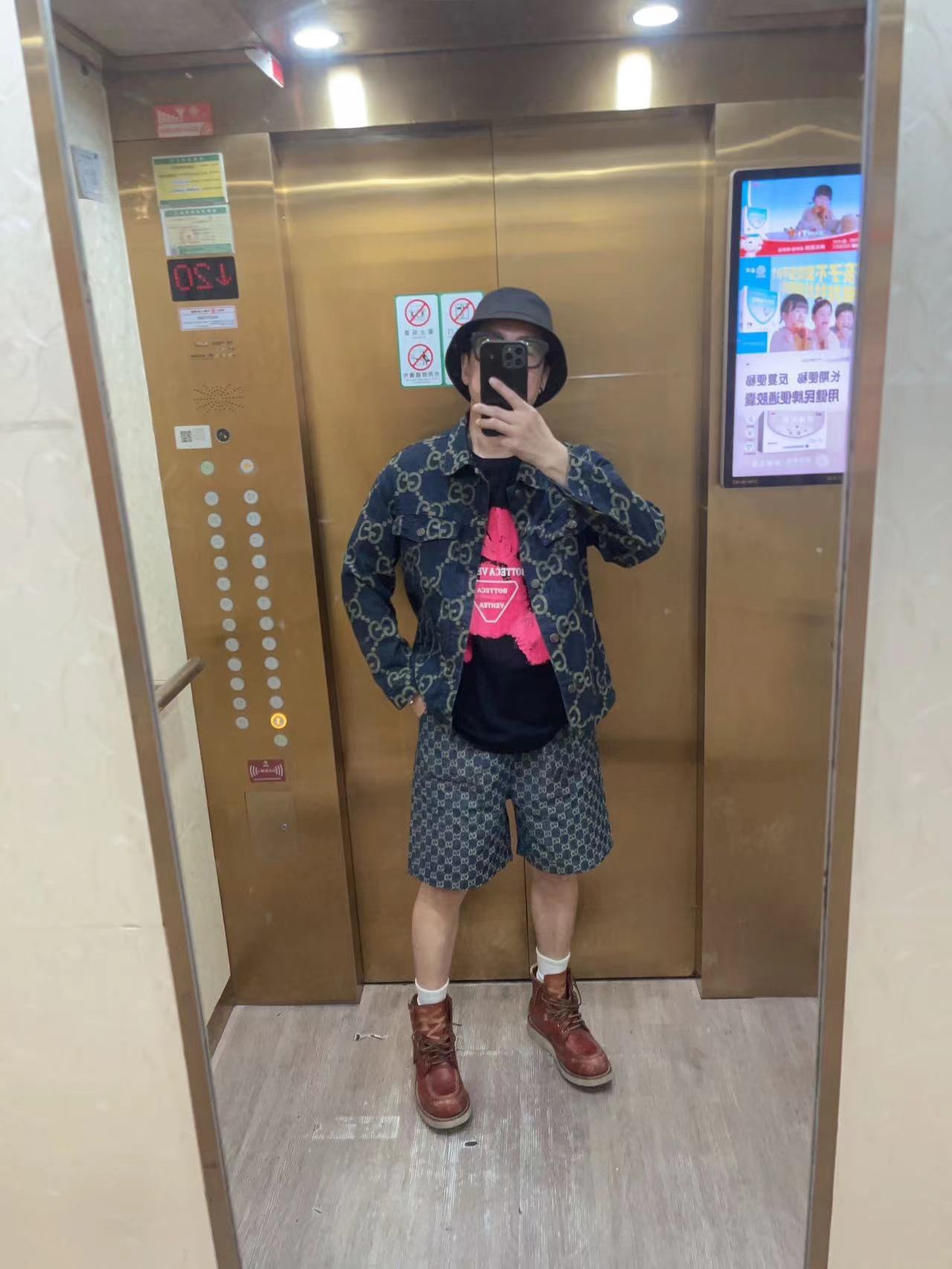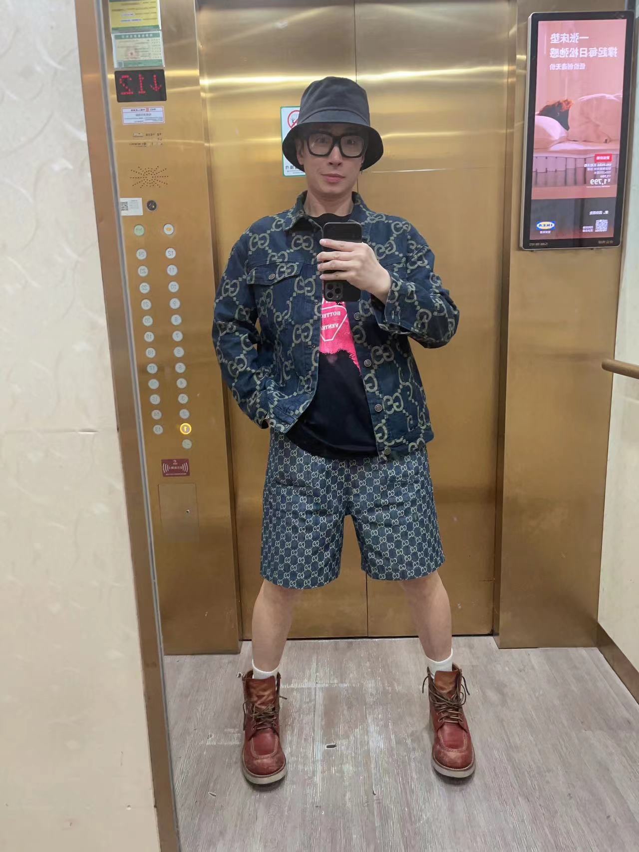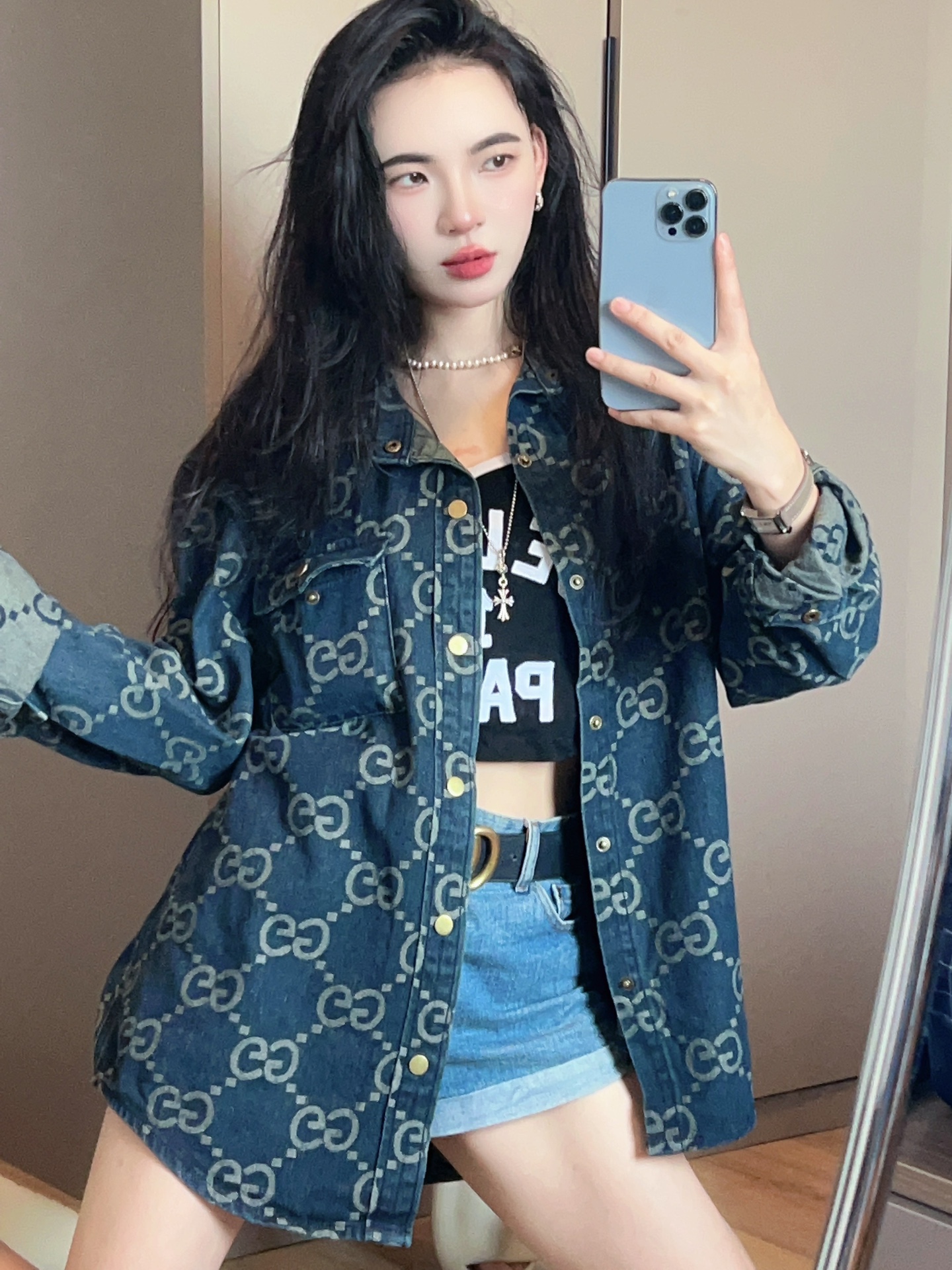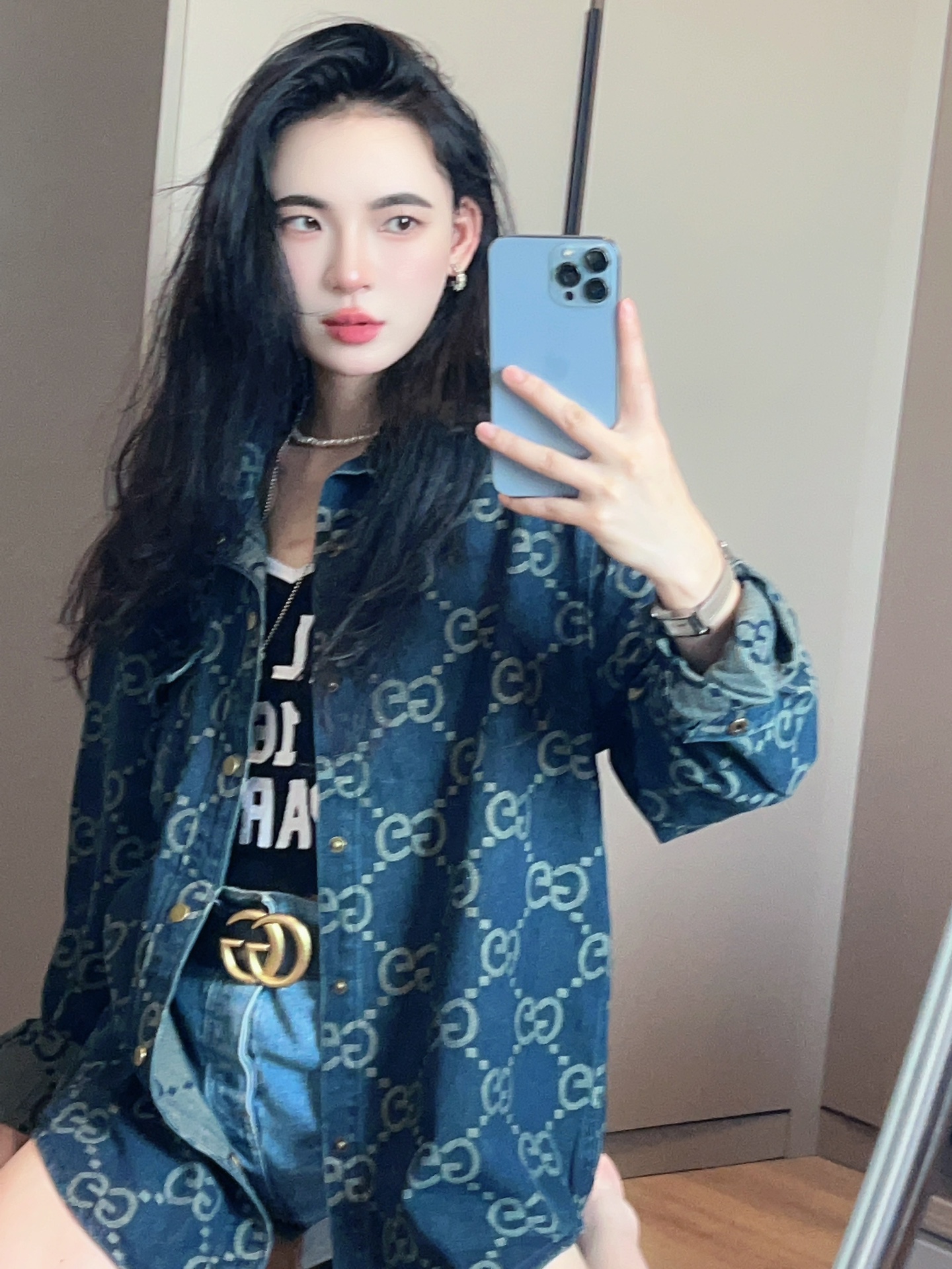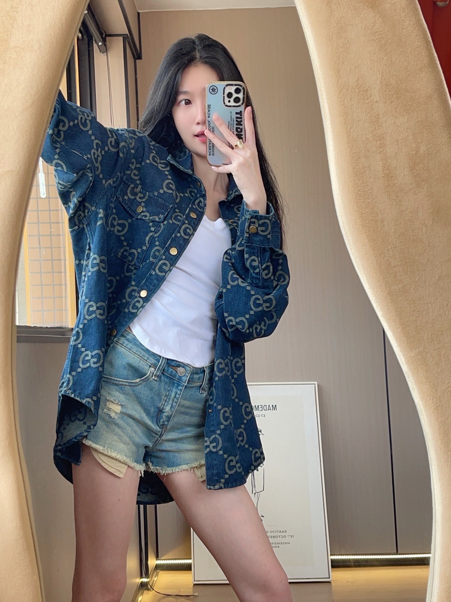 独家重磅精品原单 古家情侣款满印双G提花丹宁牛仔衬衣夹克外套,满印果然经典多久都不会过时的男女同款很好穿,满身老花水洗工艺经典时尚,里面搭个T恤或者短裤都好看,这种穿搭风格 回头率满满 感觉直接拿捏住!,扣子无LOGO(正码正拍)
