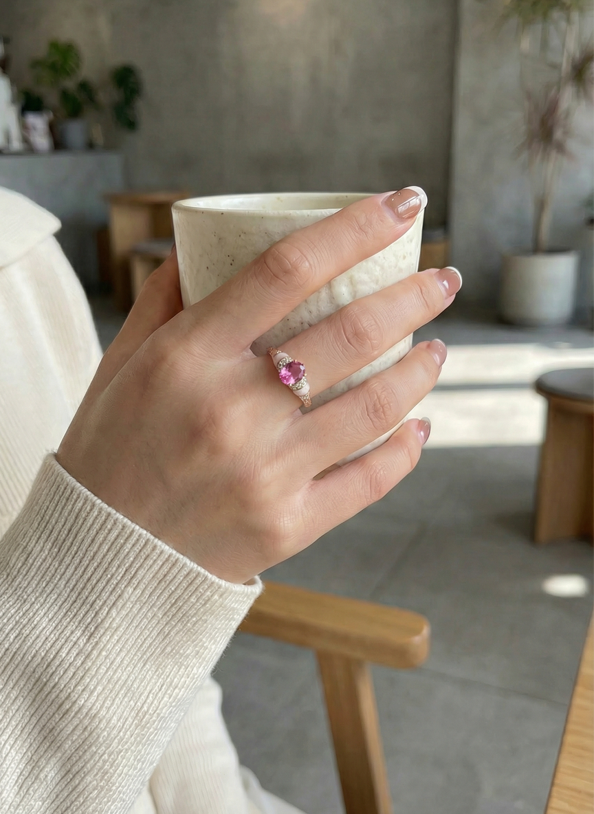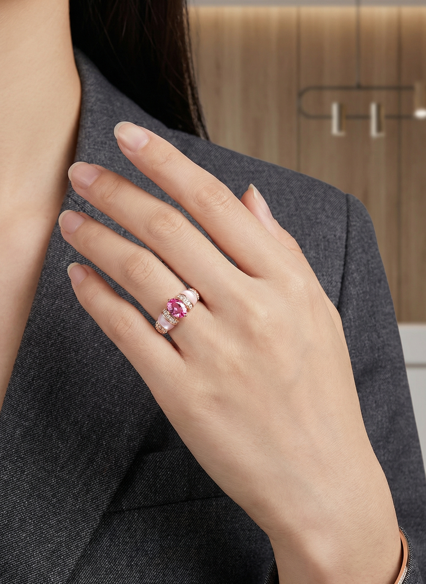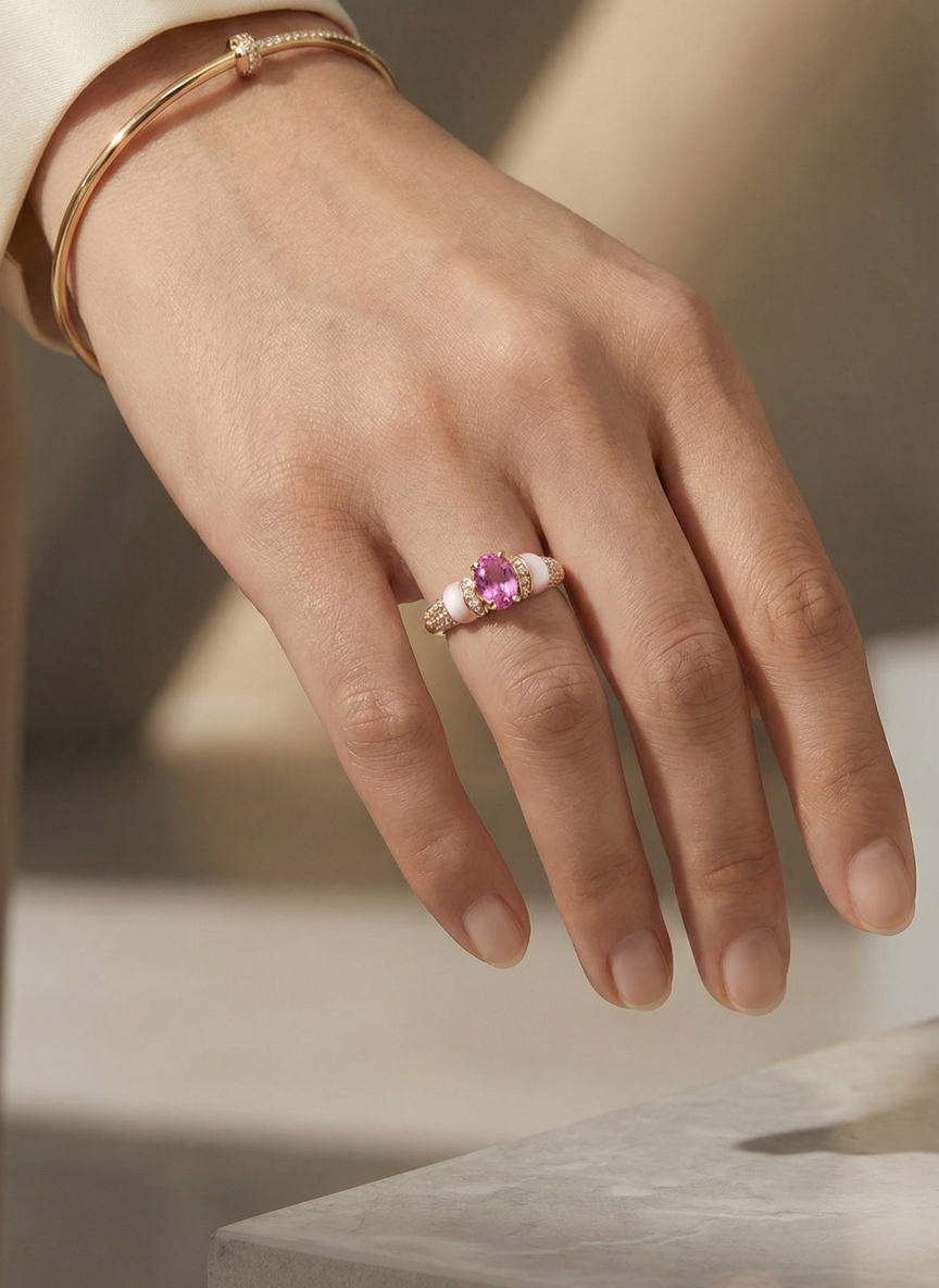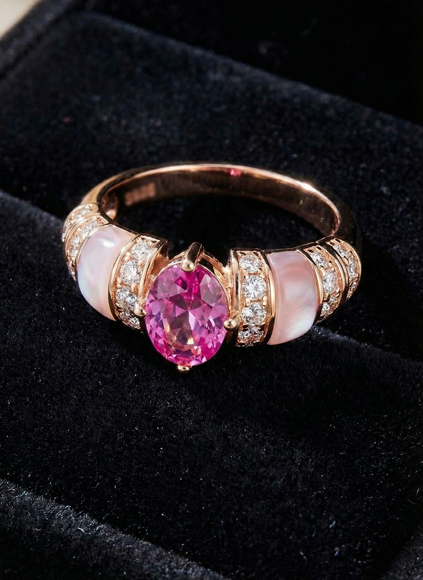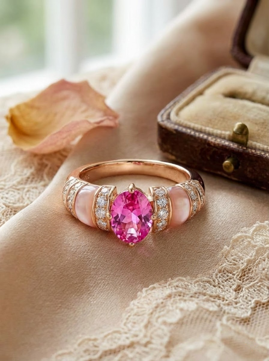 【锦上添花戒指】锦上添花 天然贝母 培育粉色蓝宝石戒指 非质量问题不退不换