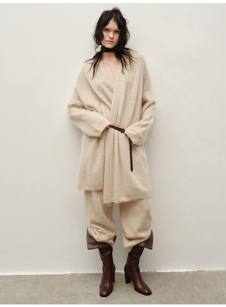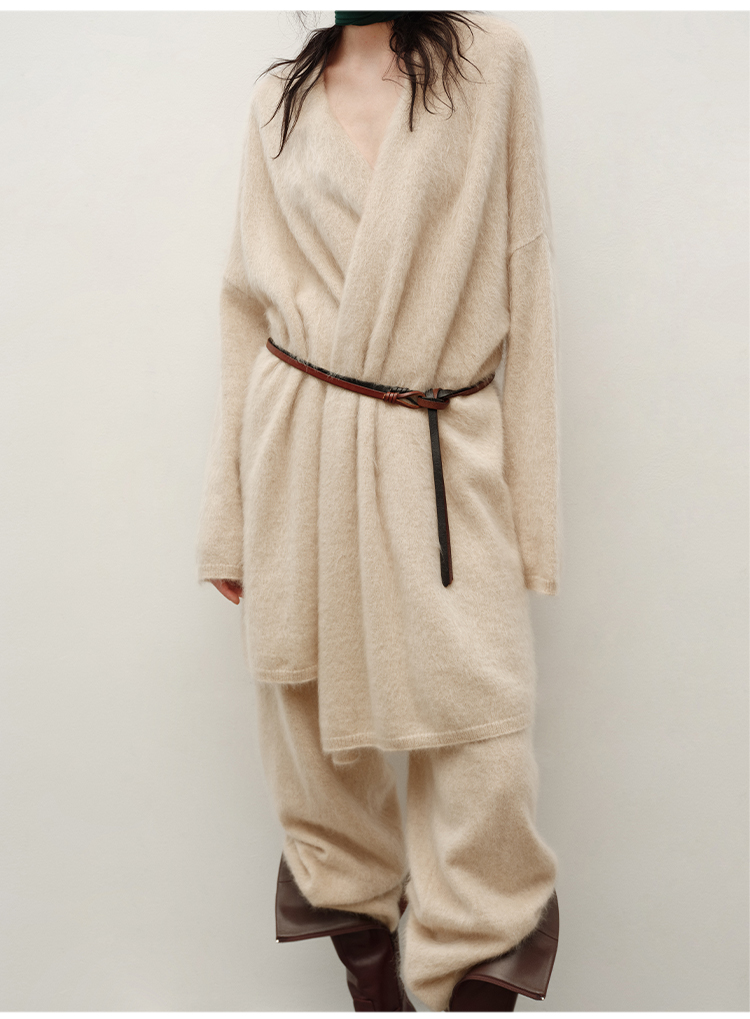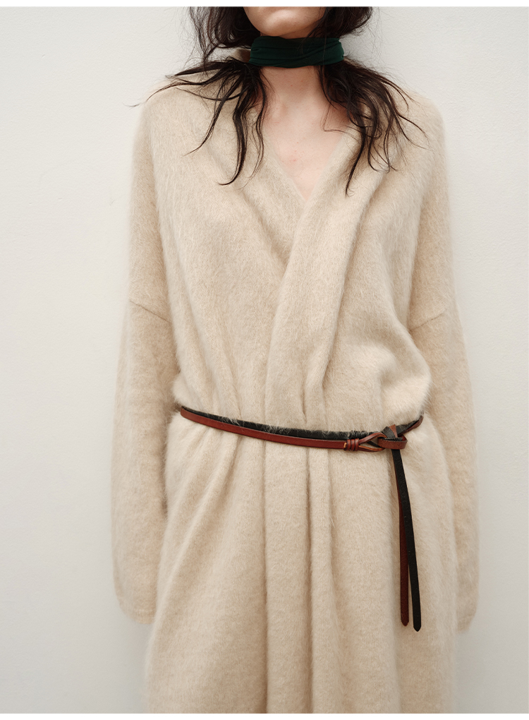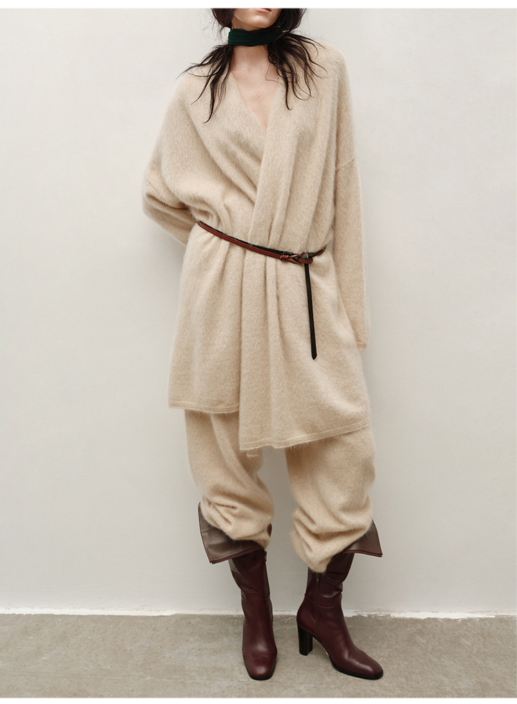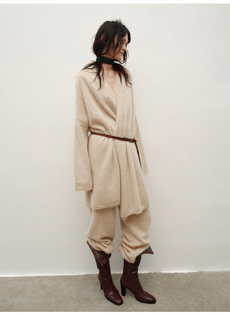 HIDEMI 美利奴超细羊毛立体交叉打结款V领修身毛衣 原白色/深摩卡/黑色
