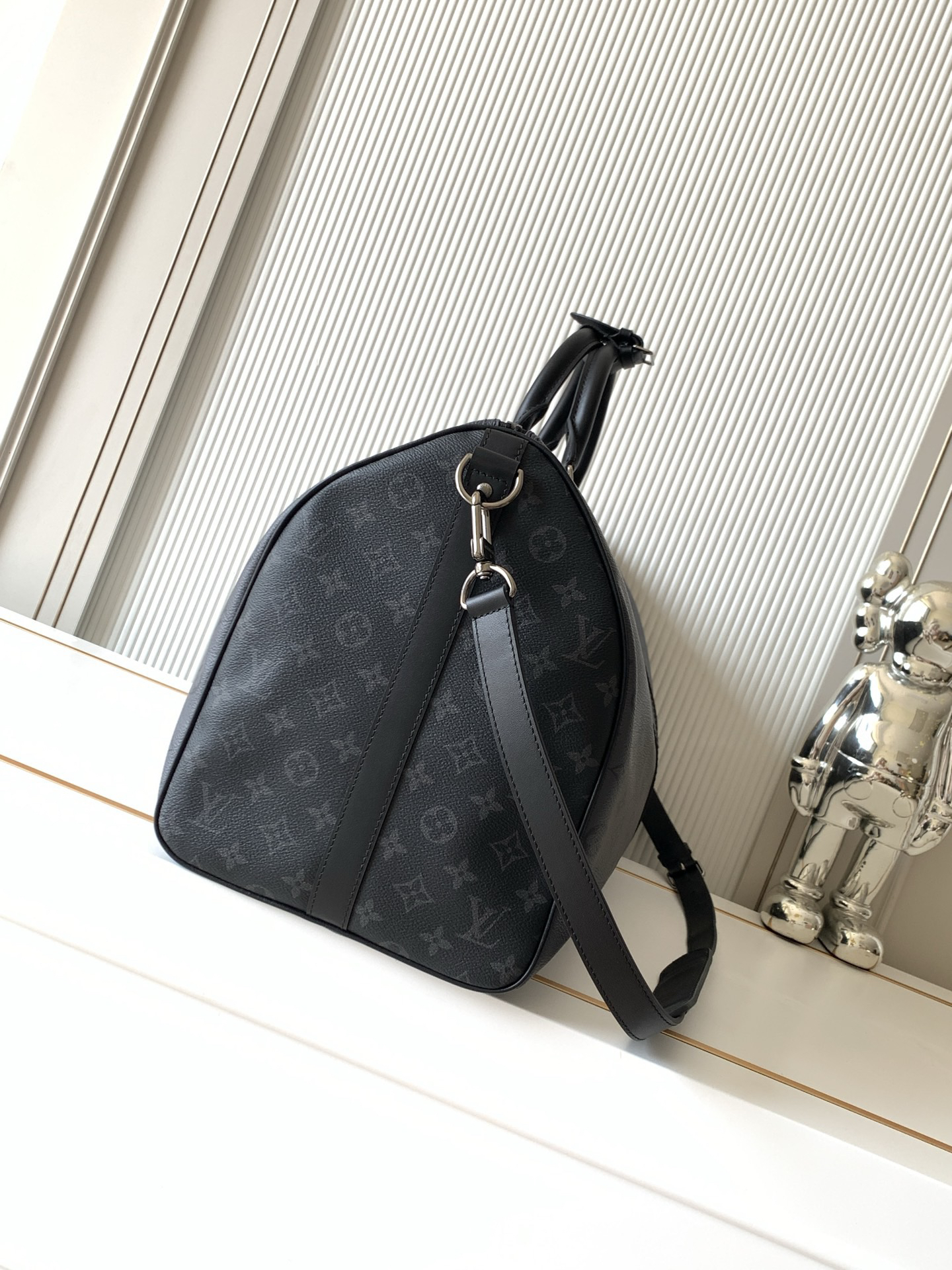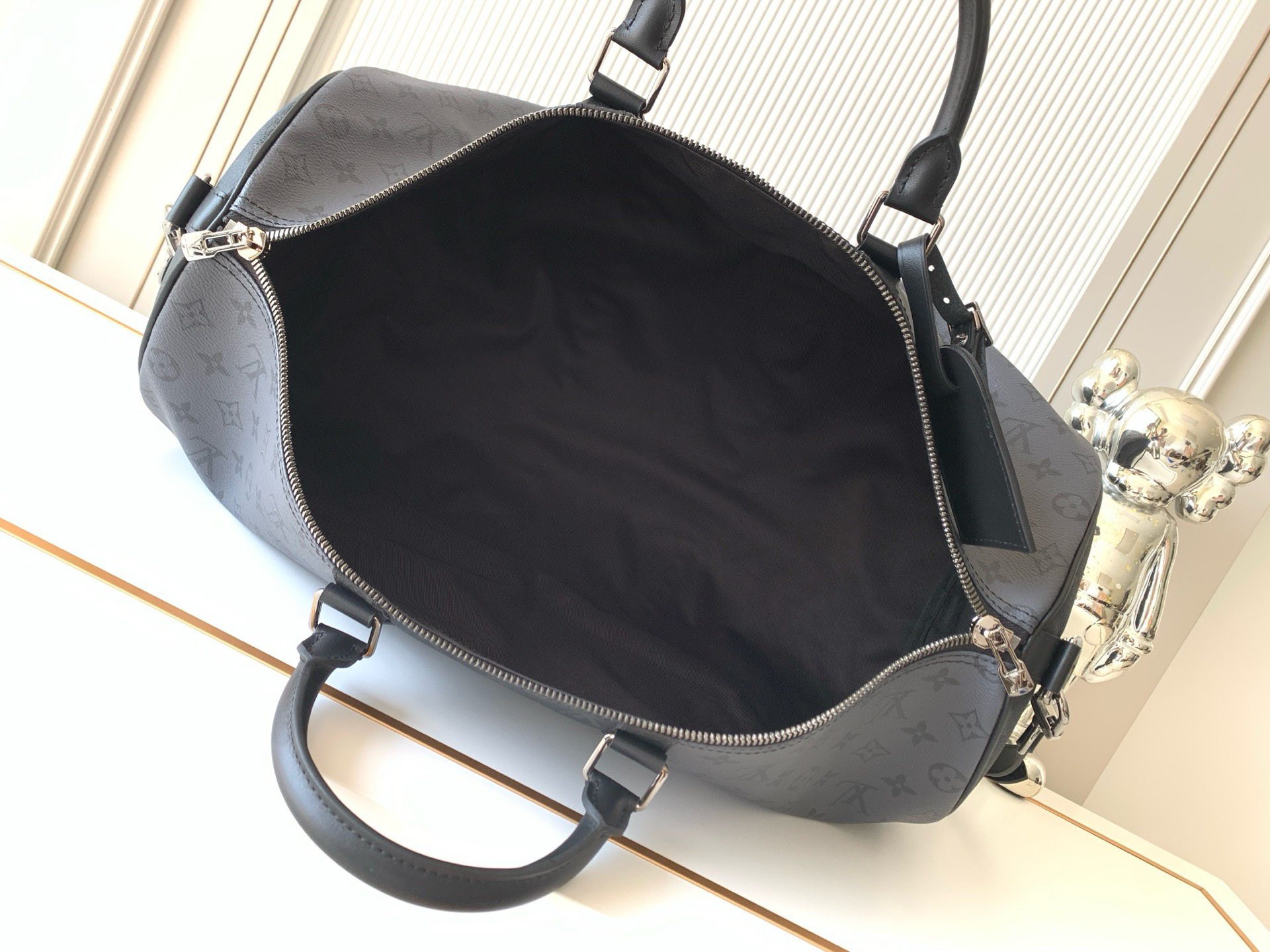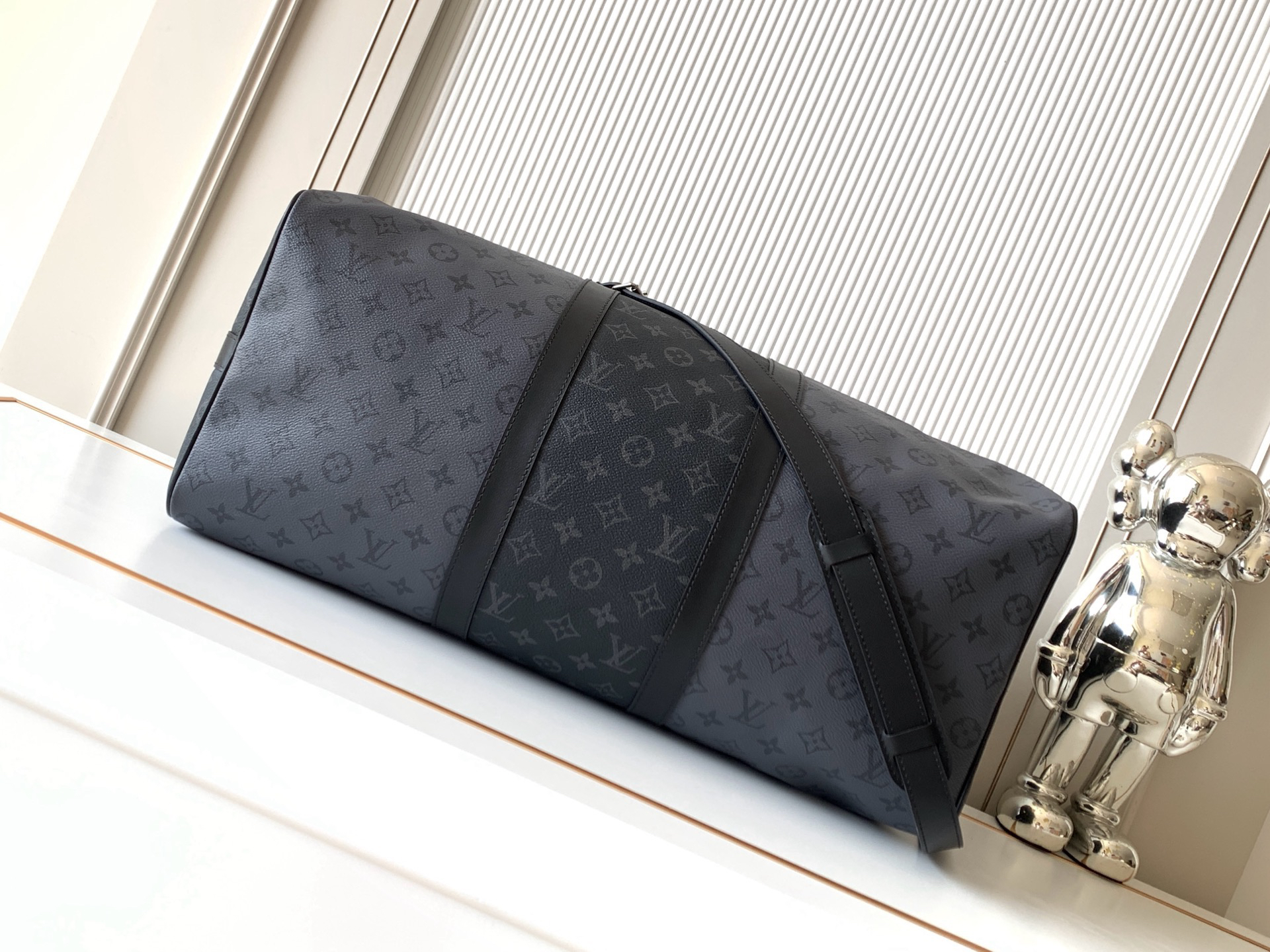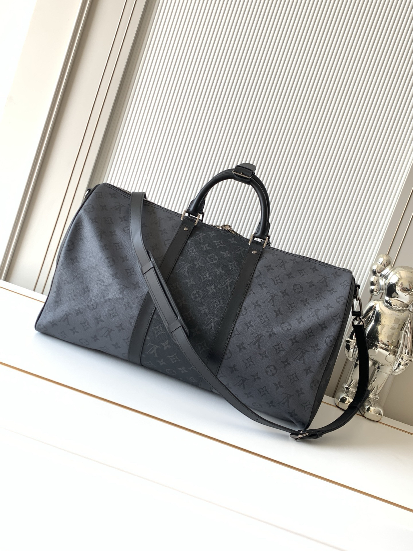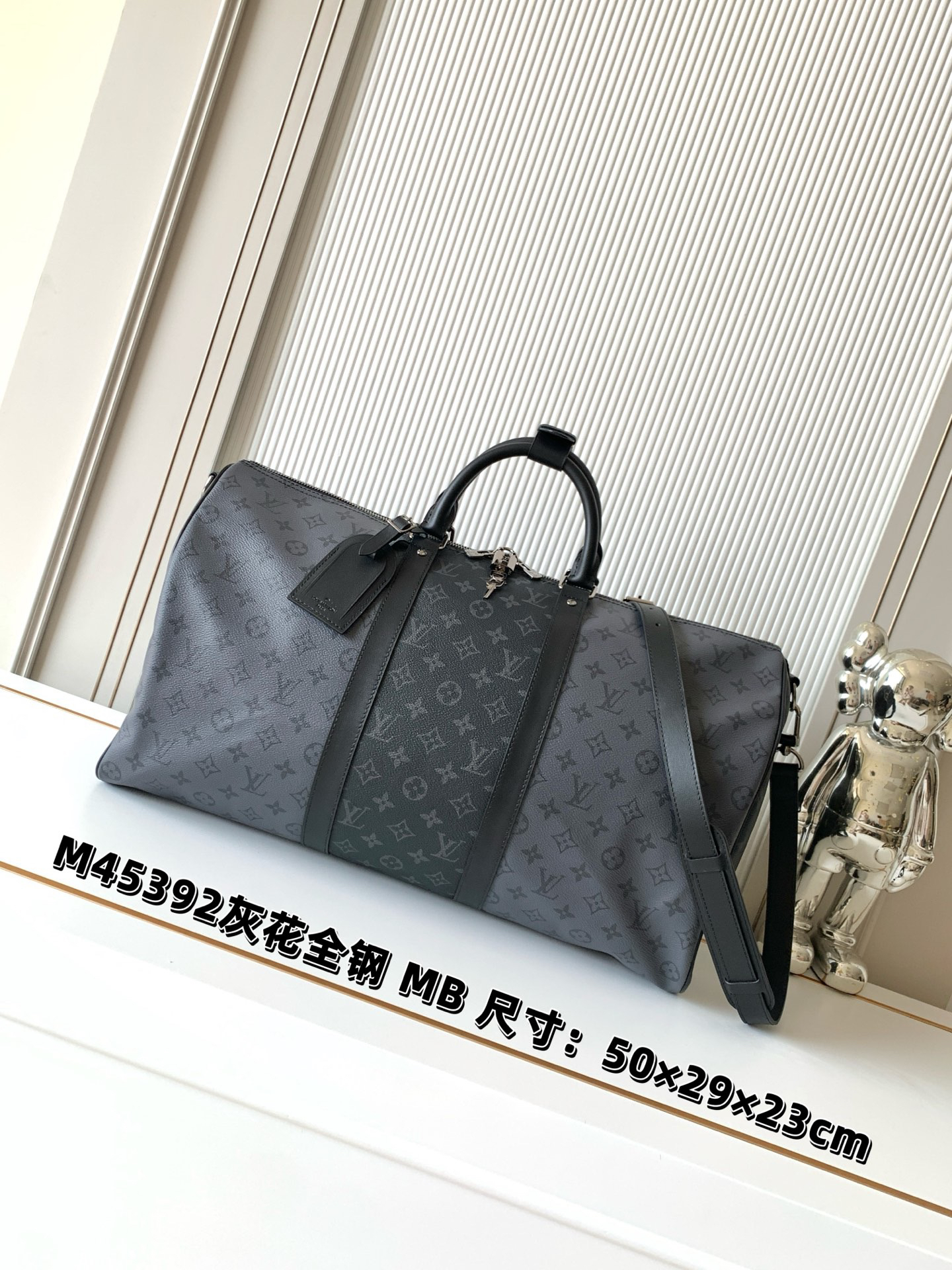 秋冬特惠💰1500 渠道级LV【全钢 MB163c01变码芯片】te级LV 全套包装 M45392黑灰花 Keepall Bandoulière 50 旅行袋以浅色 Monogram Eclipse Reverse 帆布替代深色 Monogram Eclipse 帆布,营造英气大胆的气质。此款经典柔软旅行袋配有皮革顶部手柄与侧边的两个皮带,悉为黑色,令其清晰可认。随身上机行李尺寸,内部空间充裕。织物内衬— 牛皮饰边— 银色金属饰件— 可拆卸皮革肩带— 拉链内袋— 大容量!!尺寸:50x29x23CM