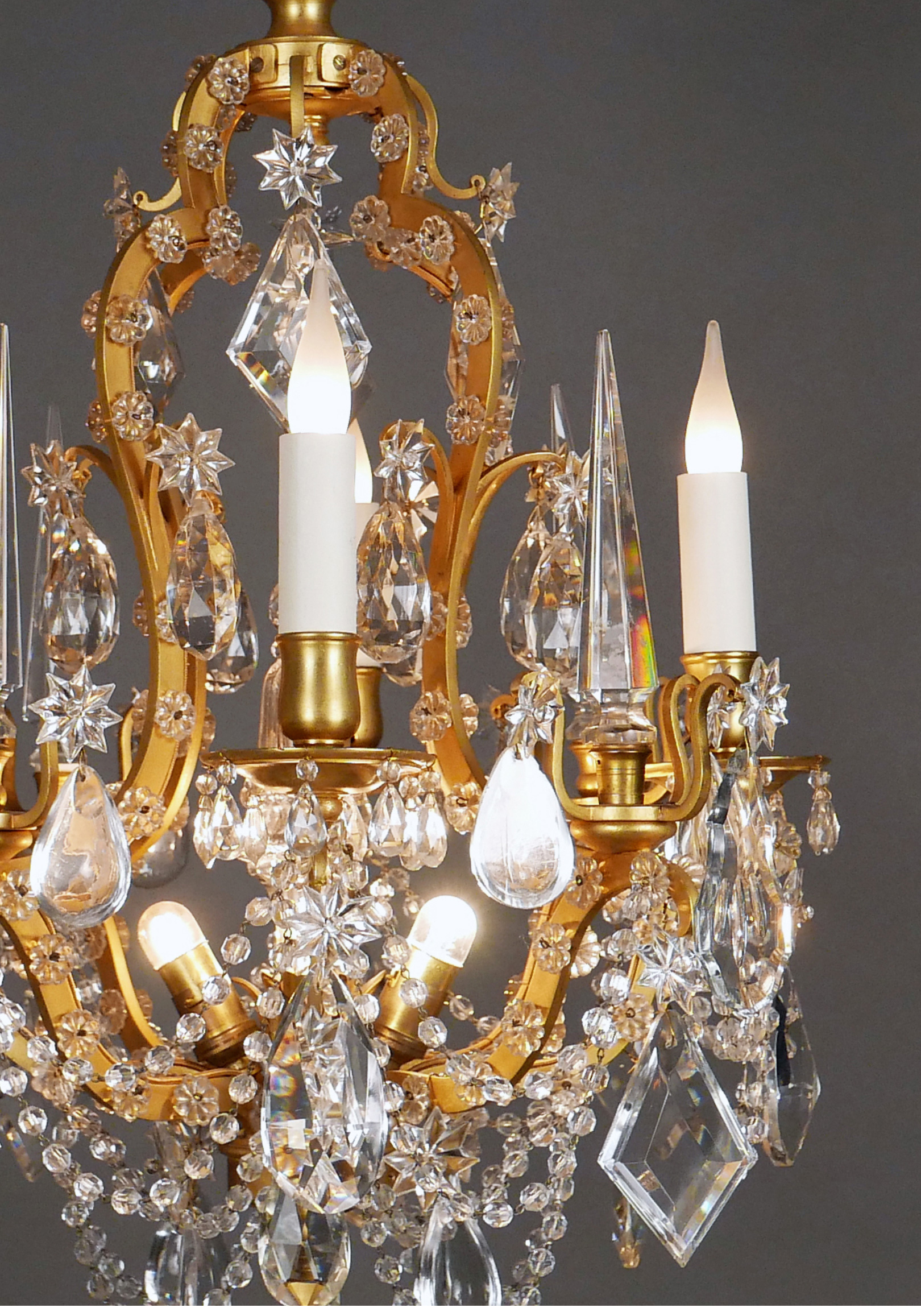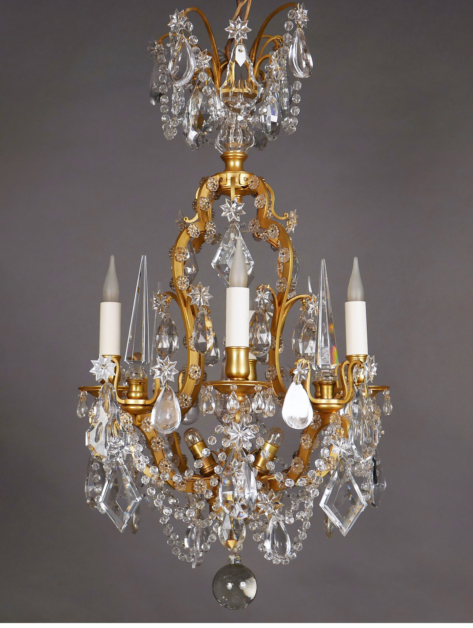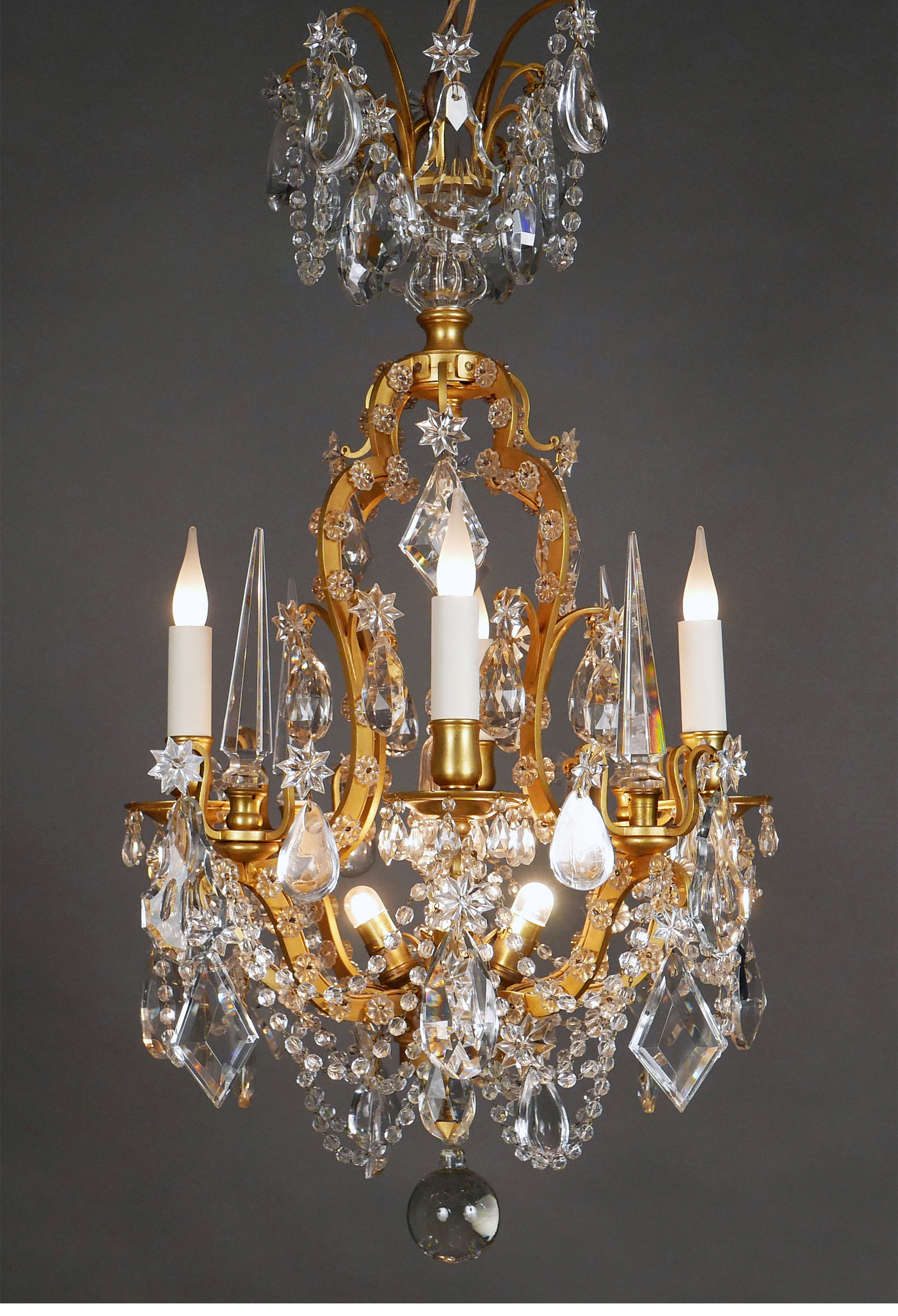 1880年代法国出品路易十五风格「鸟笼」主题铜鎏金四枝头烛台式水晶吊灯
