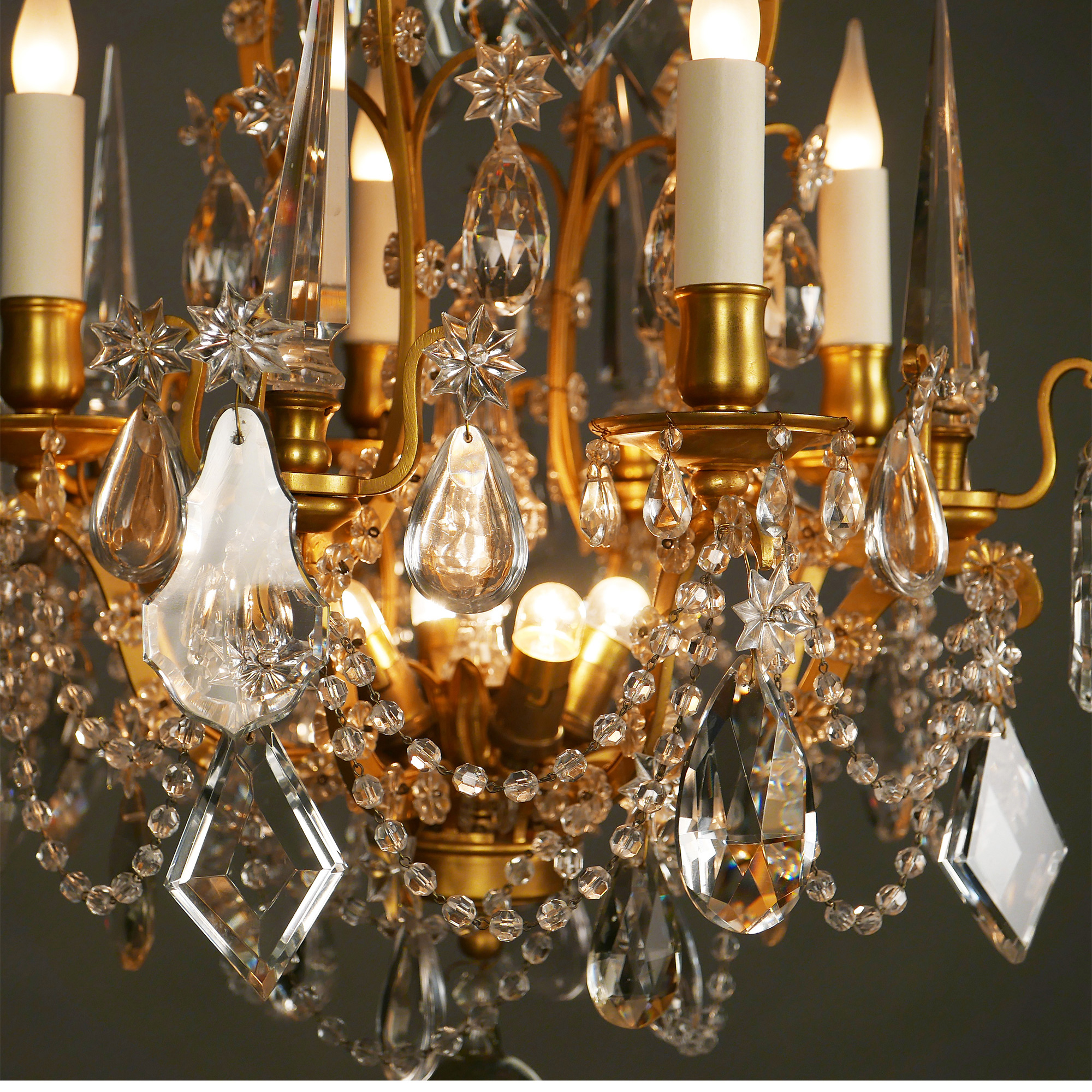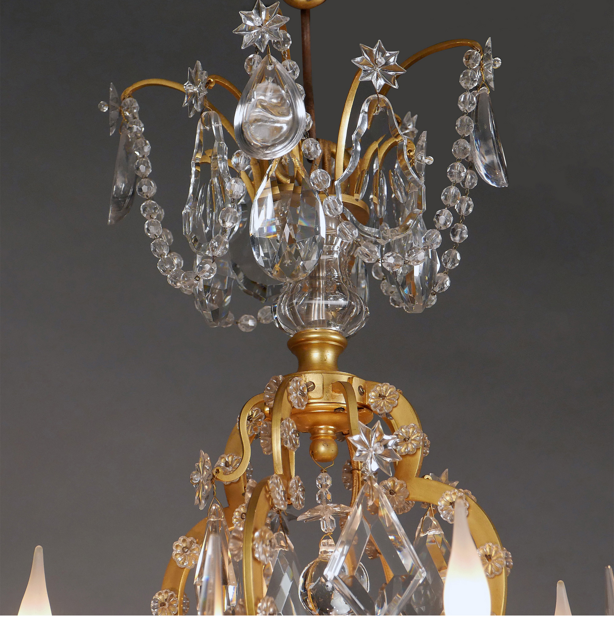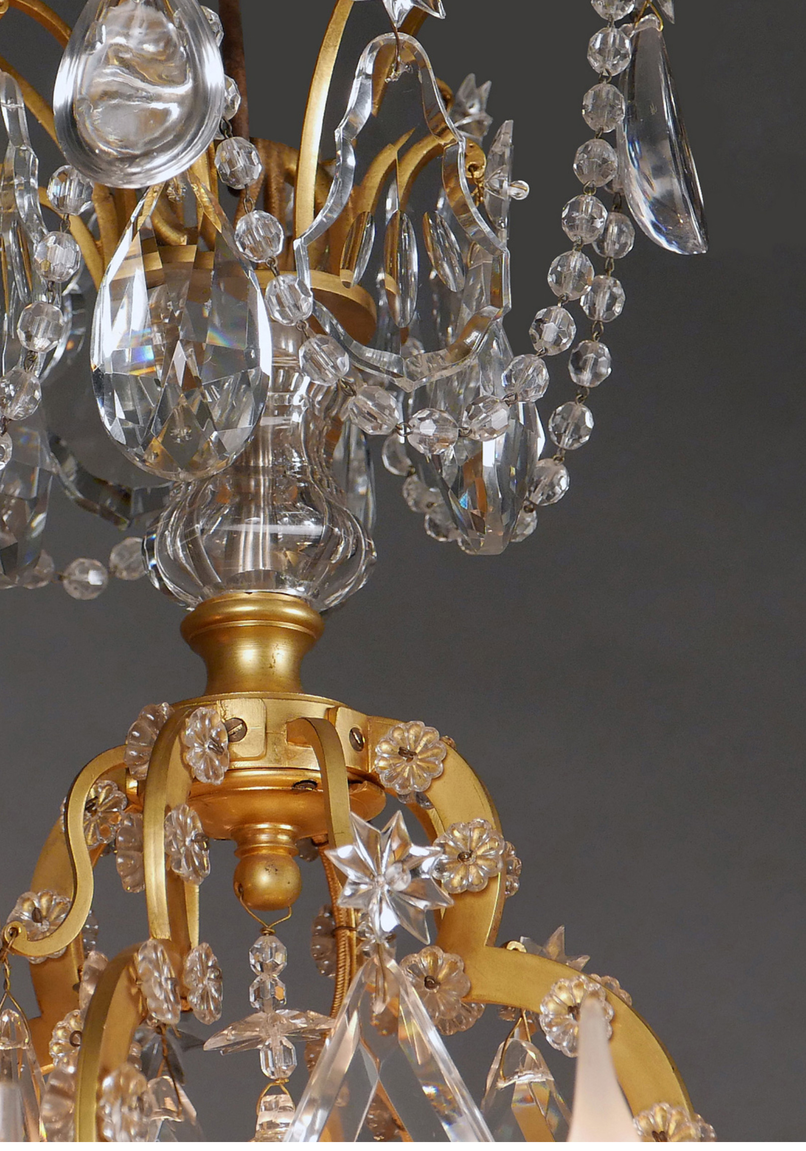 1880年代法国出品路易十五风格「鸟笼」主题铜鎏金四枝头烛台式水晶吊灯