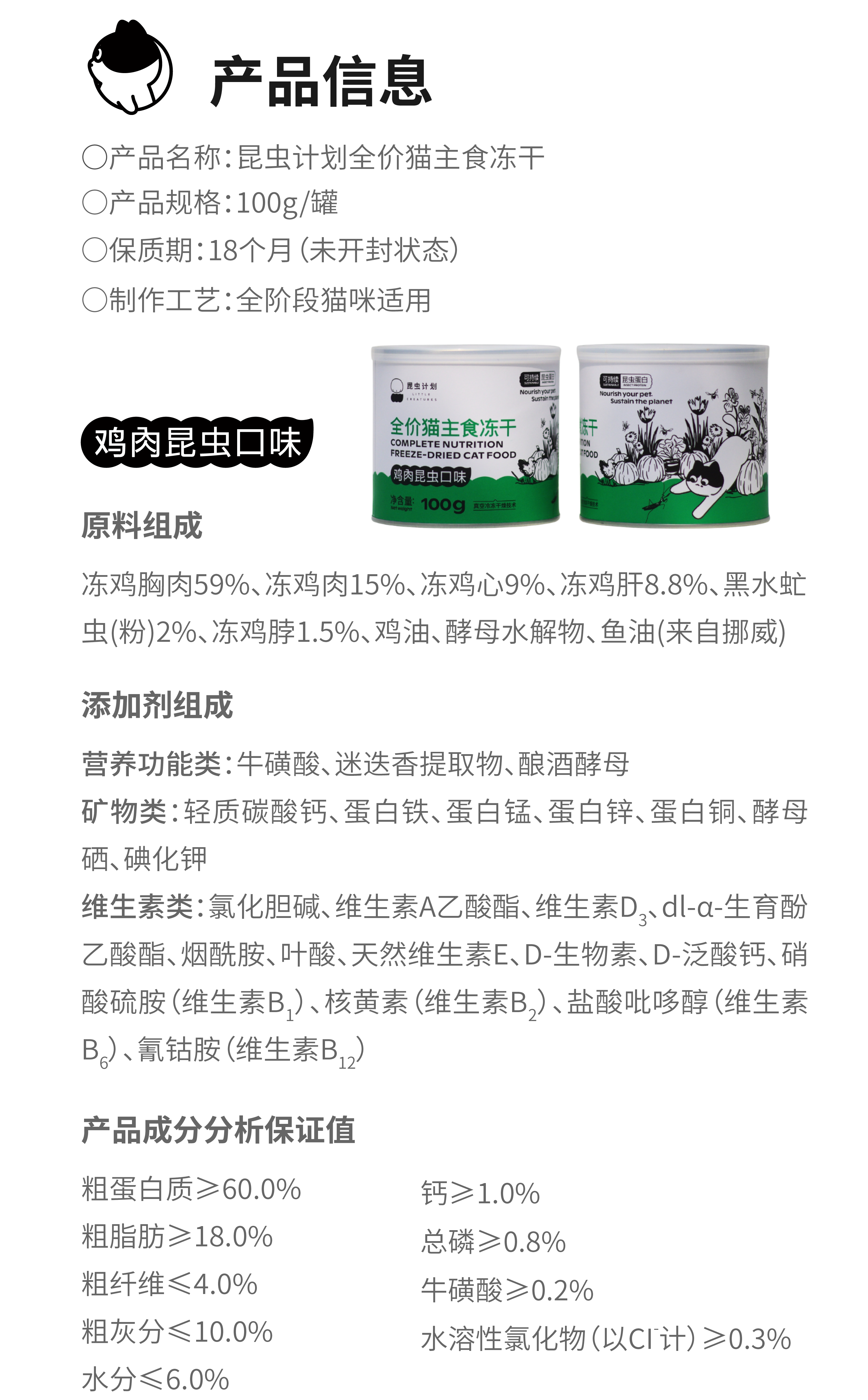 【配方】: 猫粮:80%动物原料,40%蛋白含量;22%黑水虻昆虫蛋白 猫冻干(昆虫+鸡肉配方):96%动物原料,60%蛋白含量 猫冻干(昆虫+兔鸡配方):96%动物原料,60%蛋白含量 猫罐(鸡肉+昆虫配方):90%动物原料,60%蛋白含量 猫条:冻鸡胸肉65%,水,黑水虻10%,鸡蛋5%,冻鸡肝3%,冻鸡心2%,鱼油1%