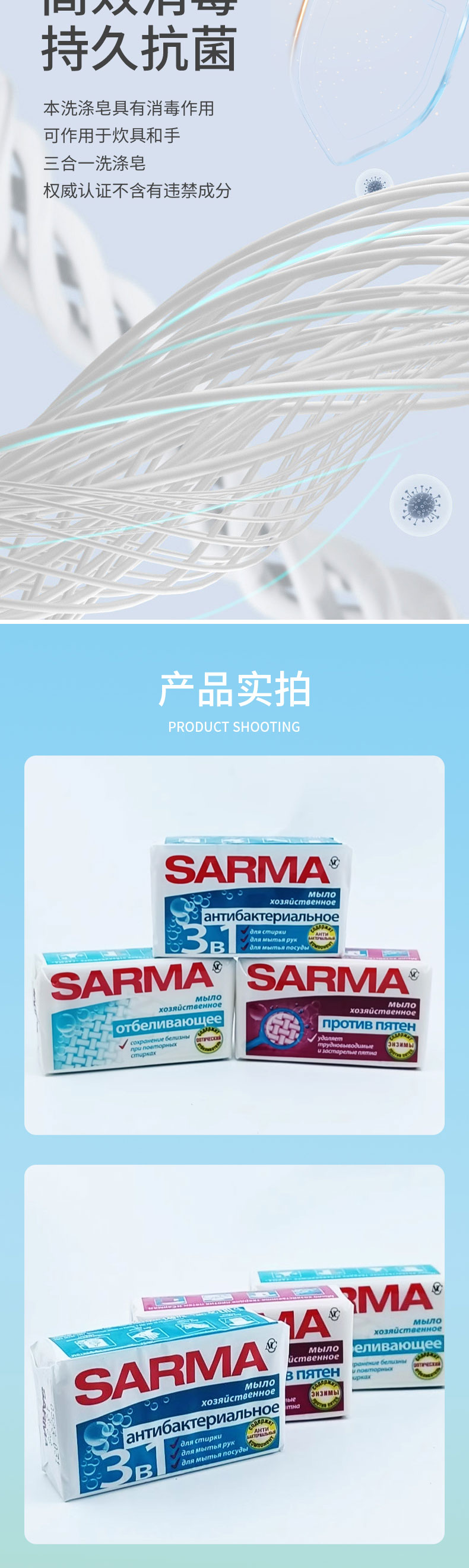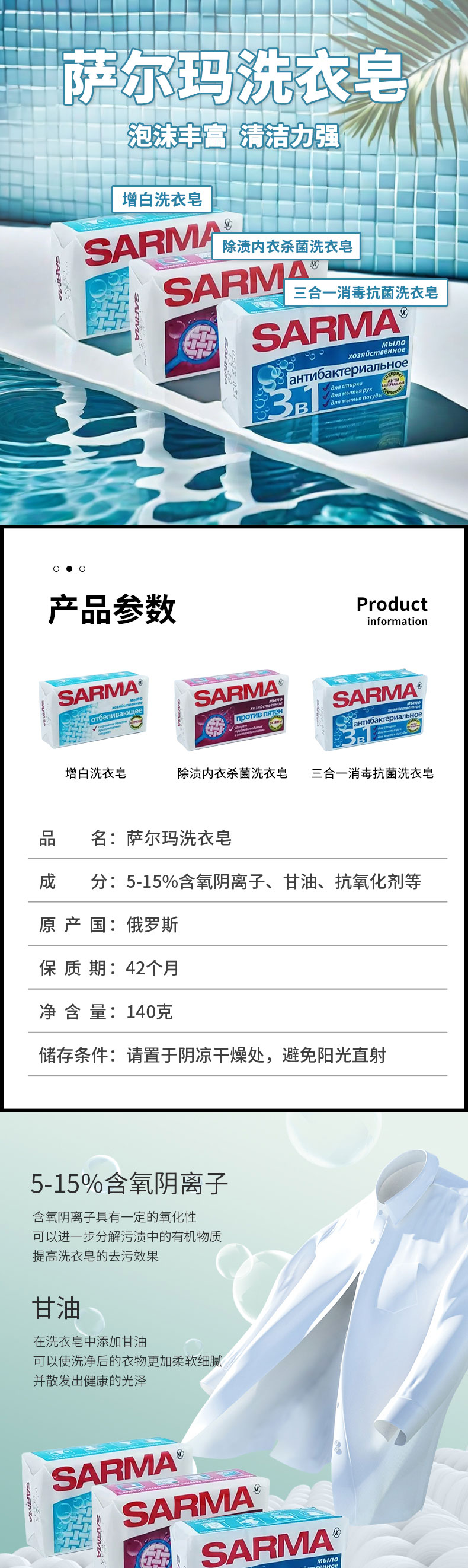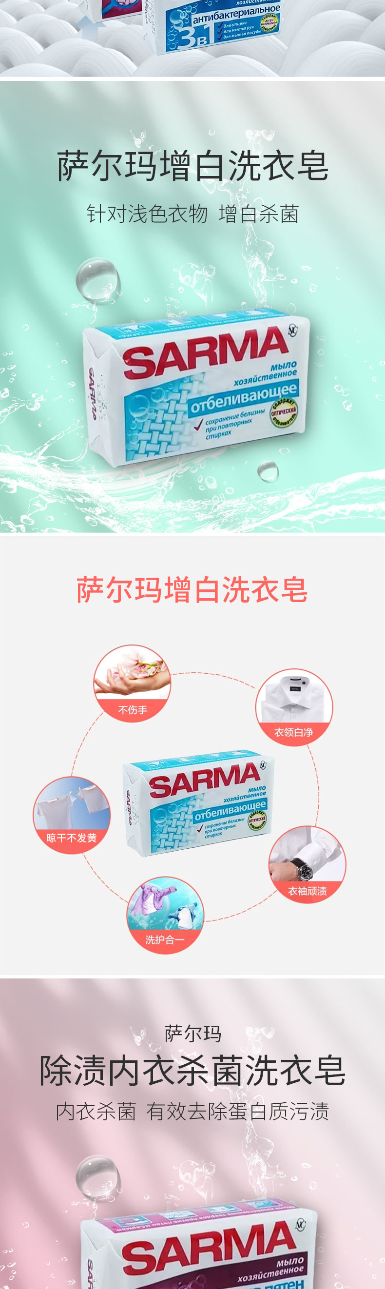 俄罗斯进口萨尔玛增白I 三合一消毒抗菌I 除渍杀菌内衣洗衣皂140g
