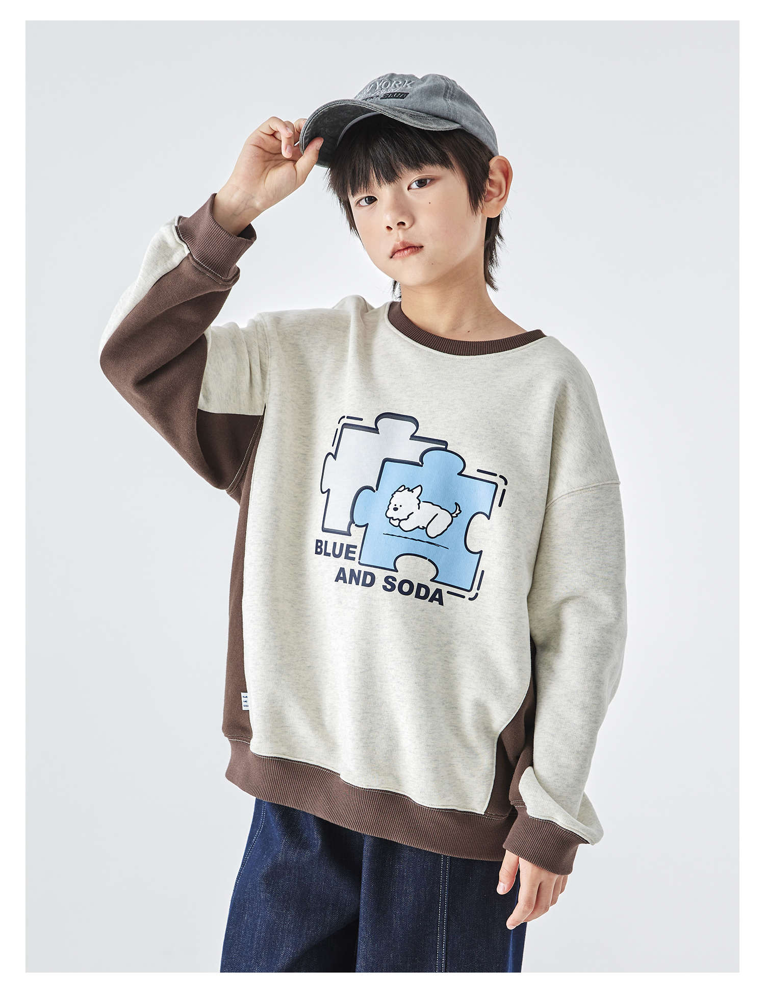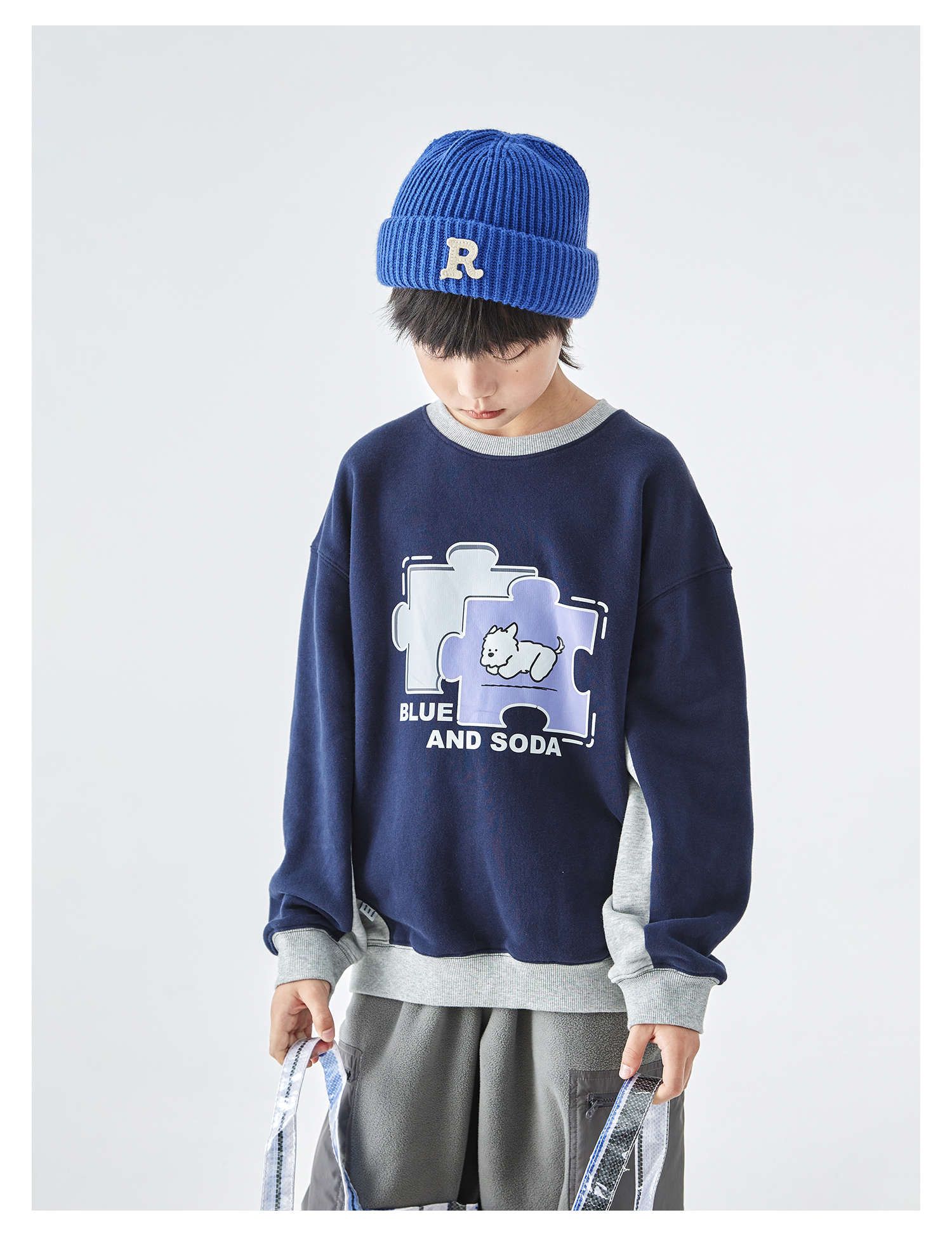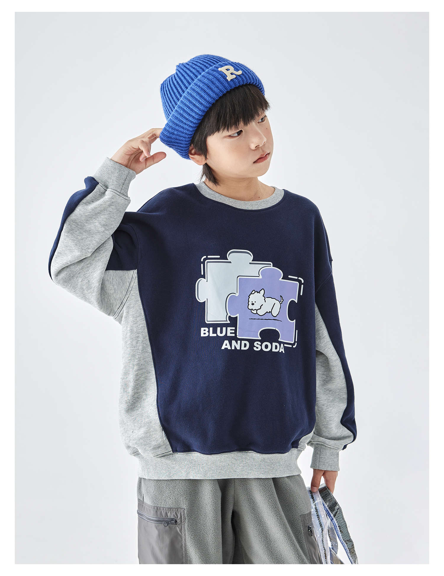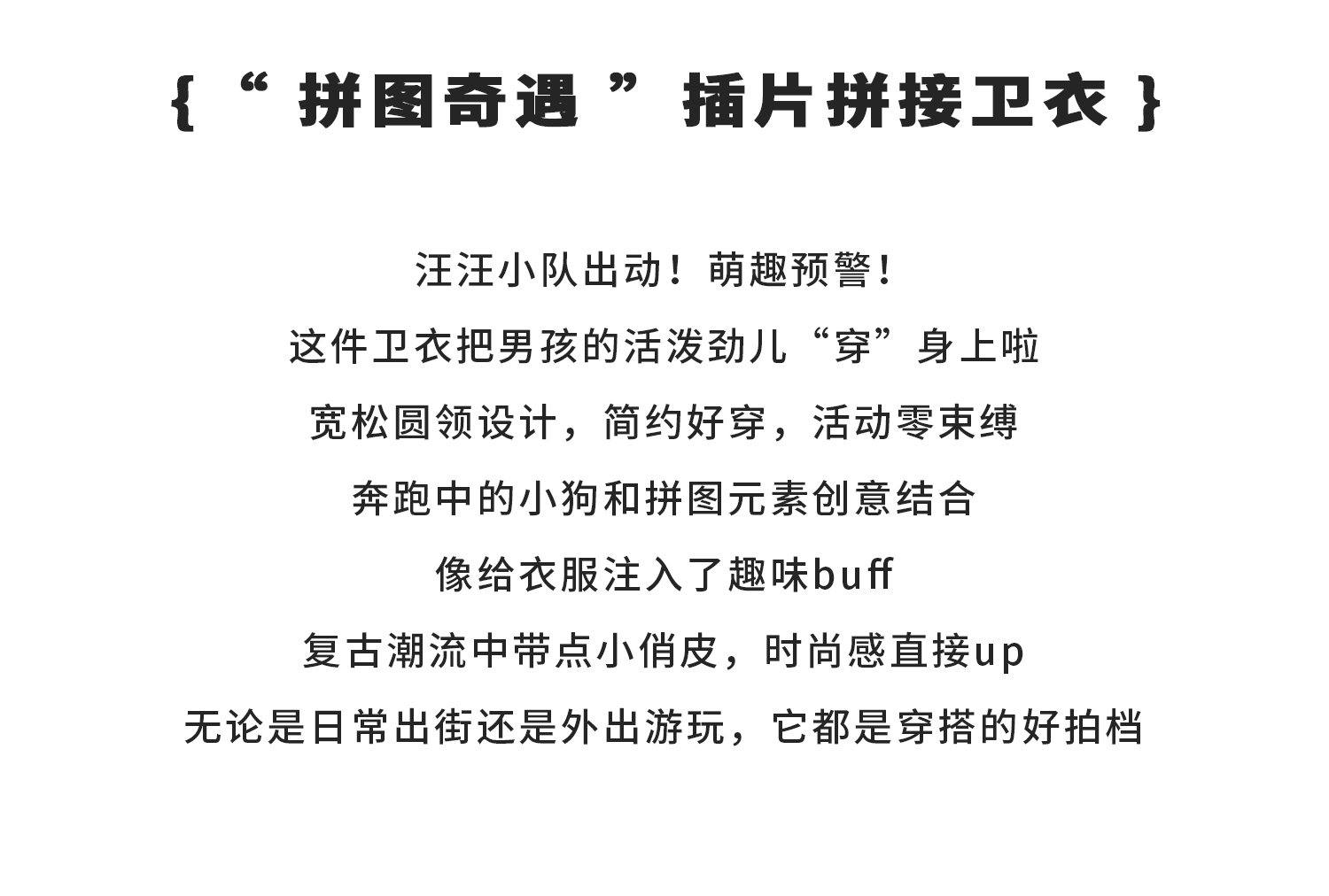 蓝汽水2025年冬季新款亲子中大男童插片拼接卫衣小狗趣味印花上衣