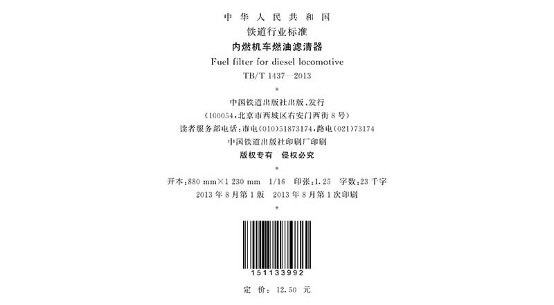 15114.3992内燃机车燃油滤清器 TB/T 1437—2013
