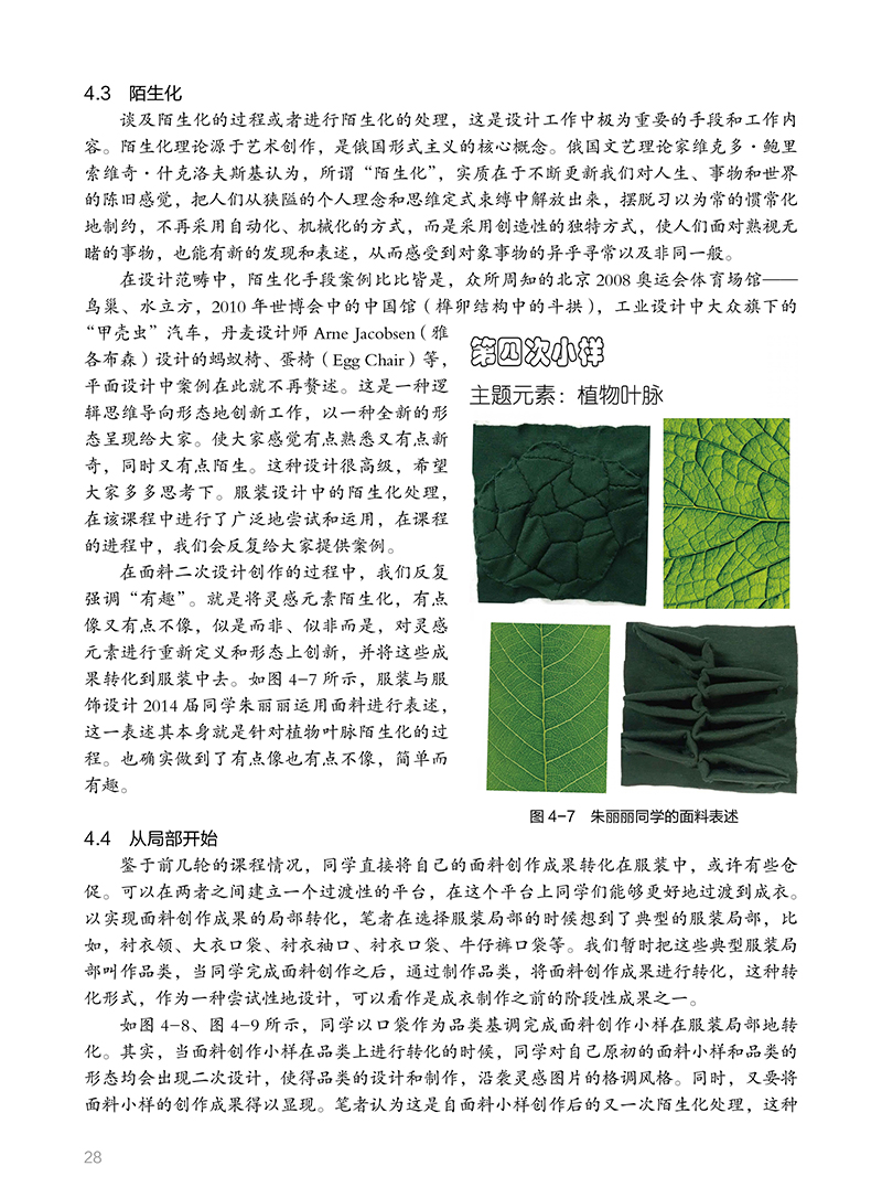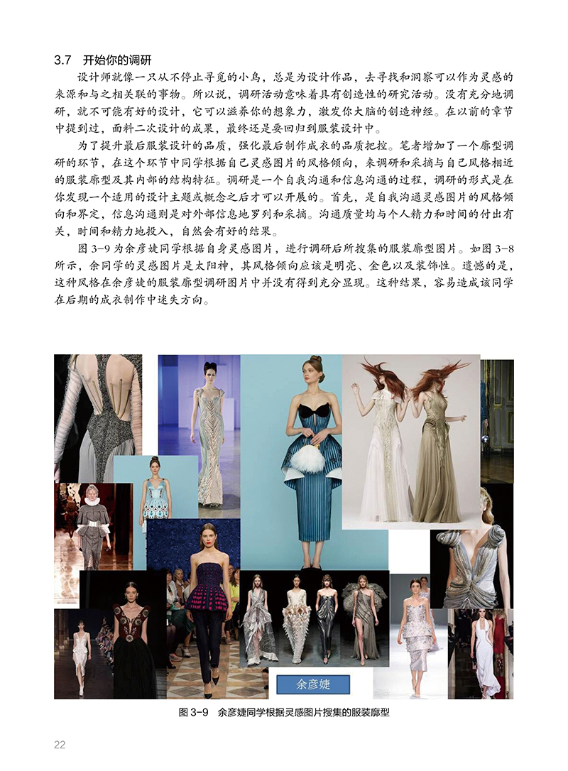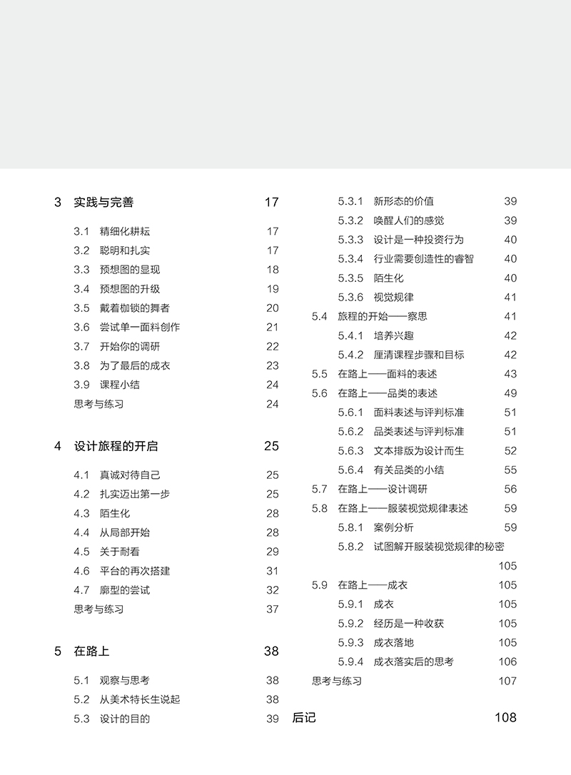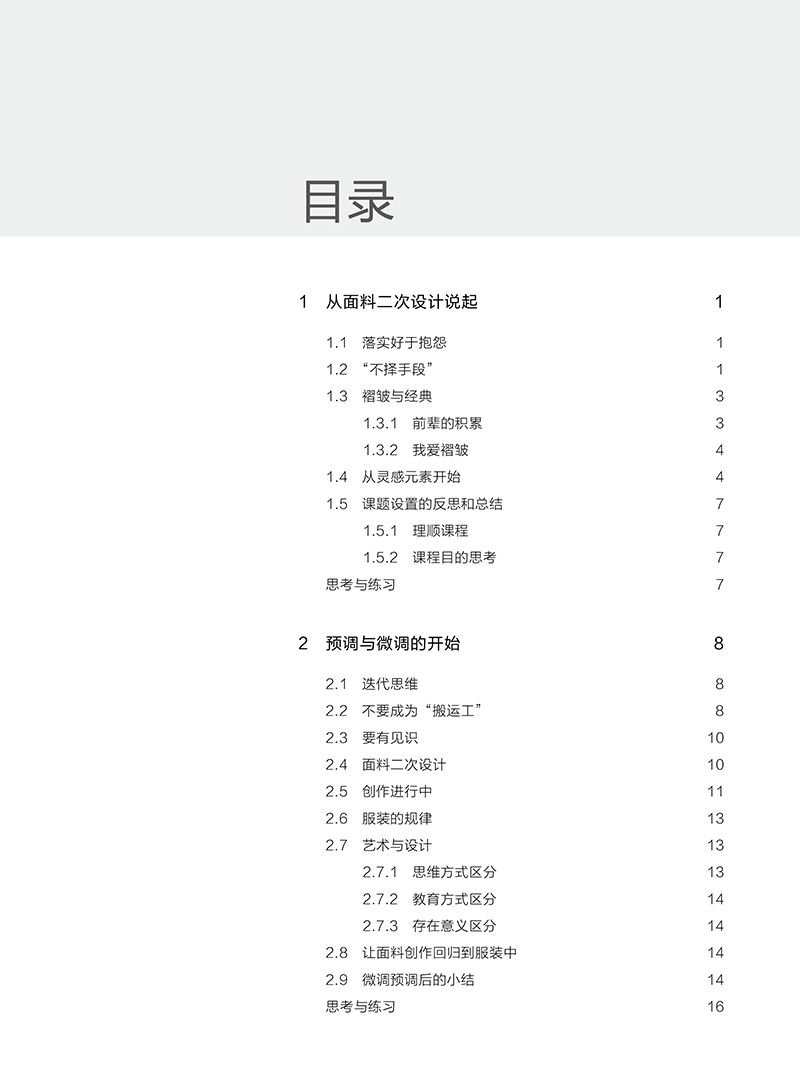 1 从面料二次设计说起 11.2 “不择手段” 11.3.1 前辈的积累 31.4 从灵感元素开始 41.5.1 理顺课程 7思考与练习 72.1 迭代思维 82.3 要有见识 2.5 创作进行中 112.7 艺术与设计 132.7.2 教育方式区分 142.8 让面料创作回归到服装中 14思考与练习 163.1 精细化耕耘 173.3 预想图的显现 183.5 戴着枷锁的舞者 203.7 开始你的调研 223.9 课程小结 244 设计旅程的开启 254.2 扎实迈出步 254.4 从局部开始 284.6 平台的再次搭建 31思考与练习 375.1 观察与思考 385.3 设计的目的 395.3.2 唤醒人们的感觉 395.3.4 行业需要创造性的睿智 405.3.6 视觉规律 415.4.1 培养兴趣 425.5 在路上——面料的表述 435.6.1 面料表述与评判标准 515.6.3 文本排版为设计而生 525.7 在路上——设计调研 565.8.1 案例分析 595br5.9 在路上——成衣 55.9.2 经历是一种收获 55.9.4 成衣落实后的思考 6后记 8
