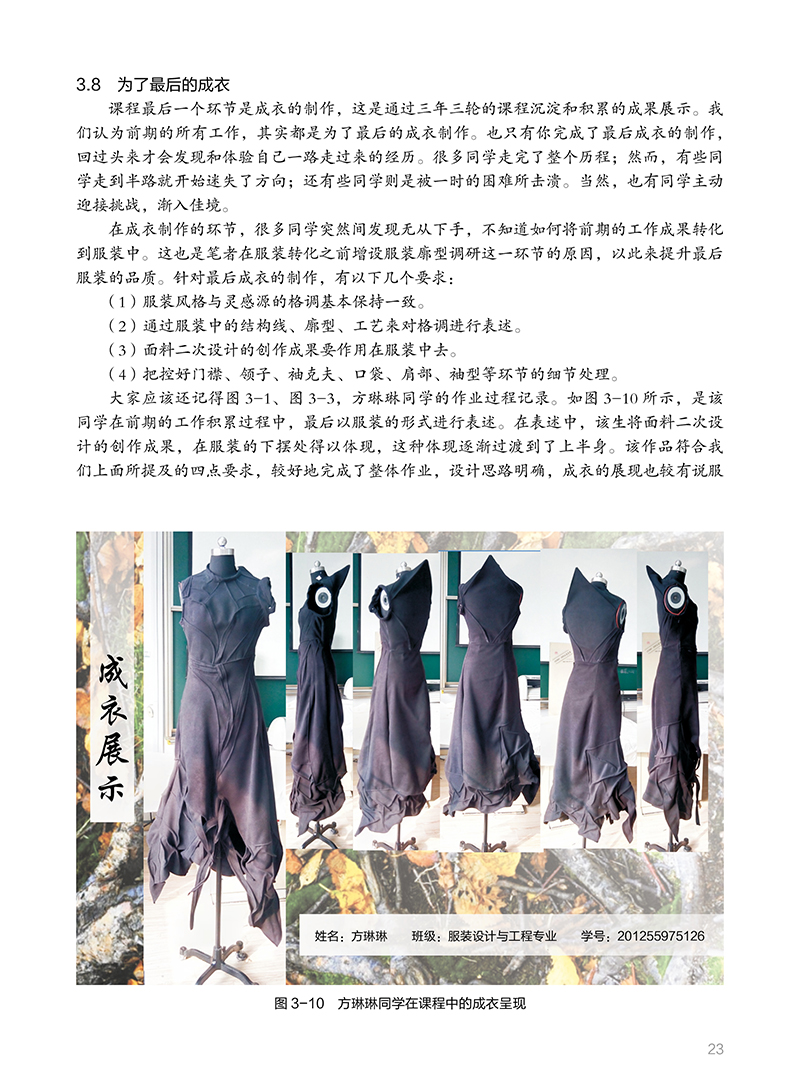 面料塑型课程的设计完成了类似课程的思路梳理,通过六个相互关联的课题设置,模拟台阶式的授课模式完成教学任务,使得学生能够在环环相扣、循序渐进的授课模式下,解决察思、面料、裁剪、形态、陌生化、服装规律、设计目的、设计价值等专业核心问题。撰写内容中的作业