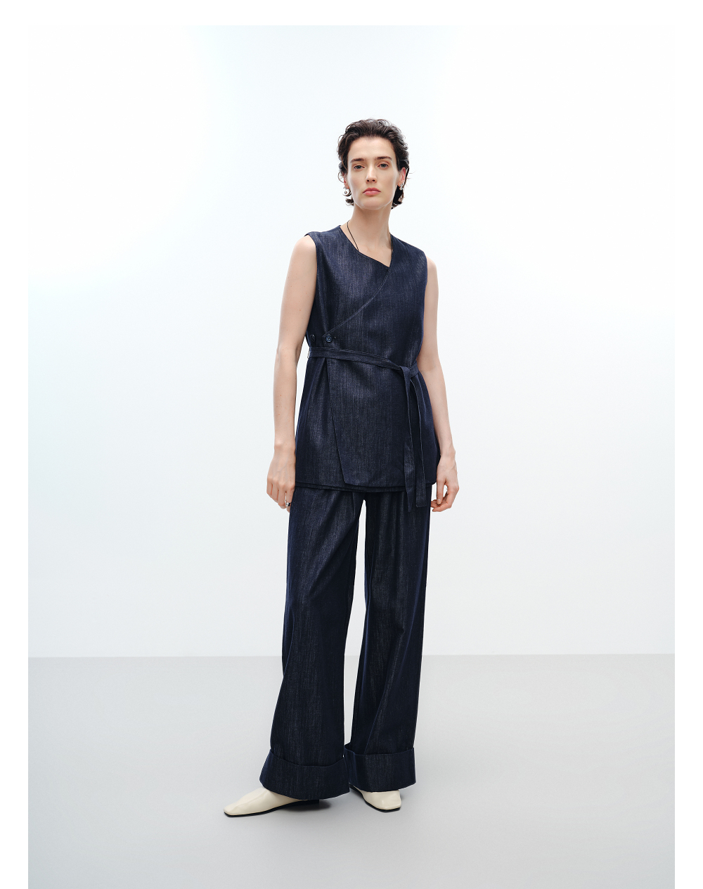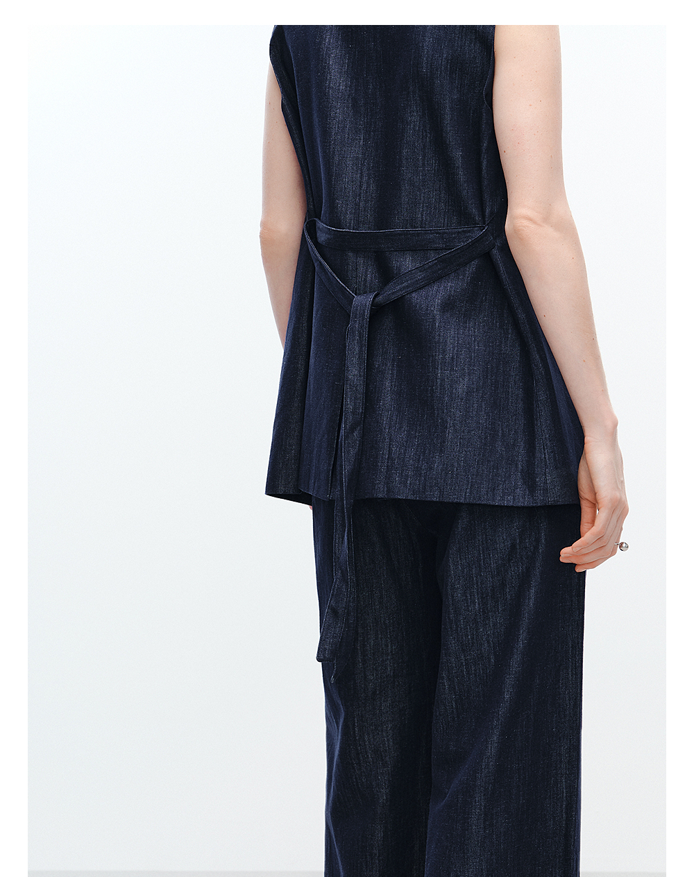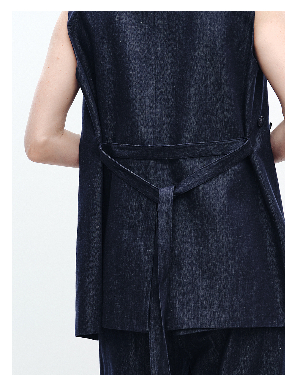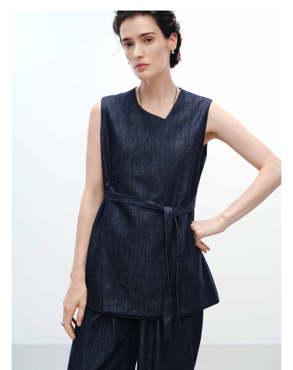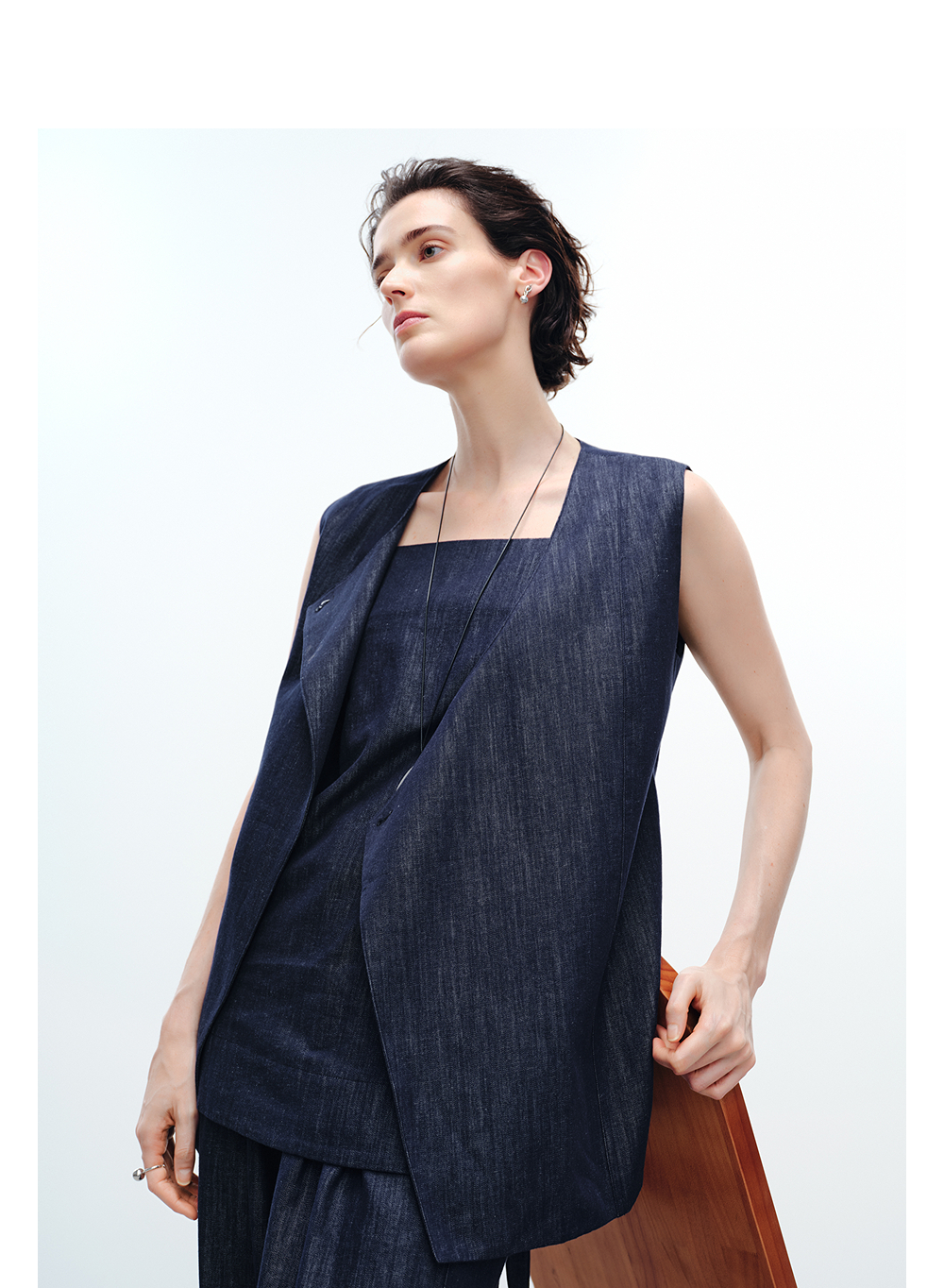舒库2025春季新款女装马甲莱赛尔亚麻高级感上衣品质牛仔蓝马夹