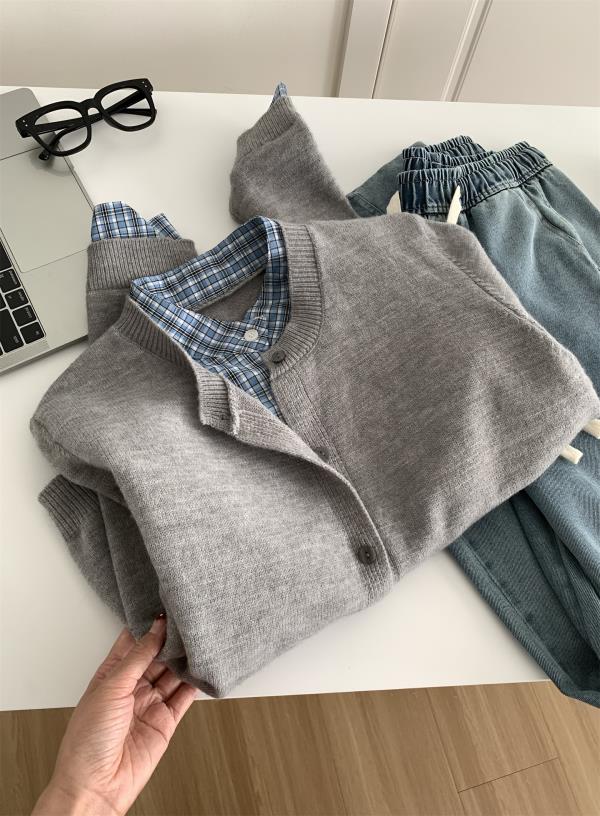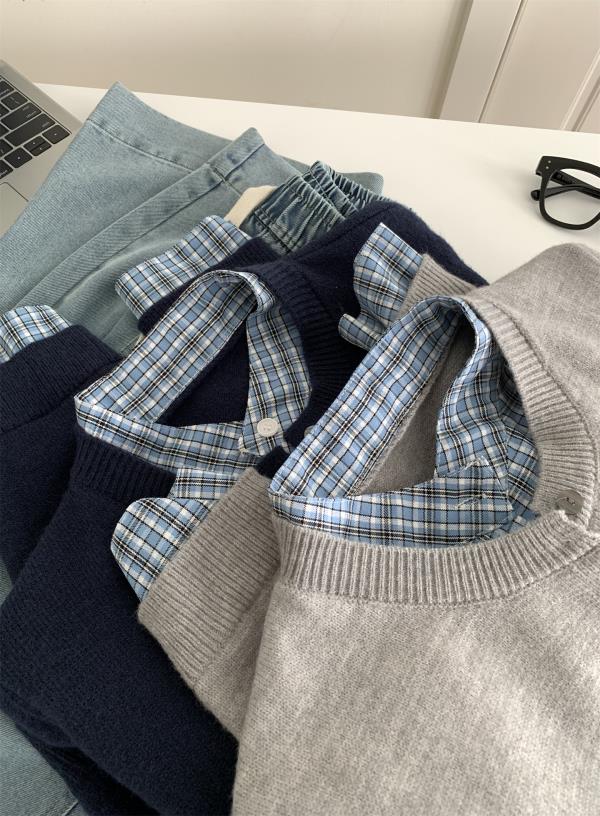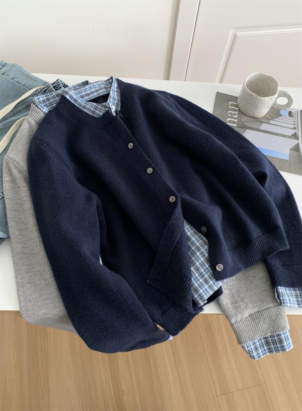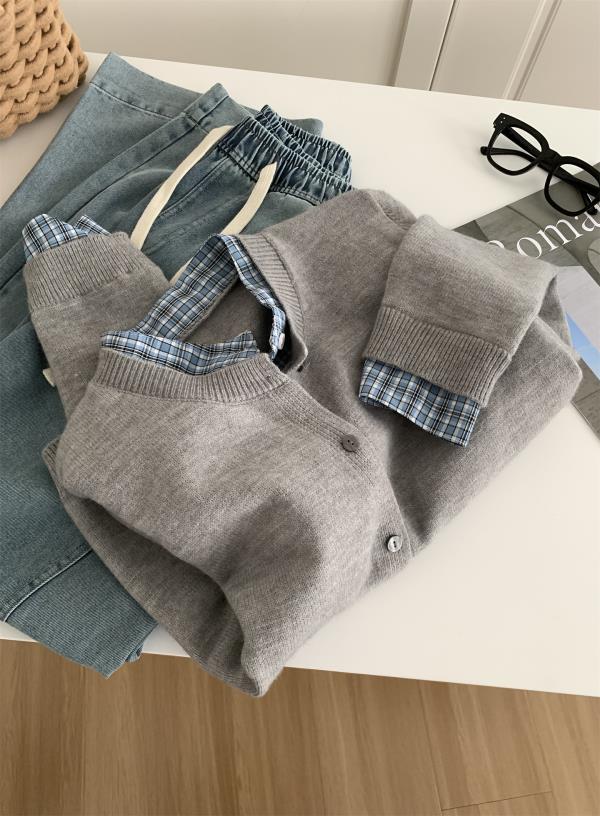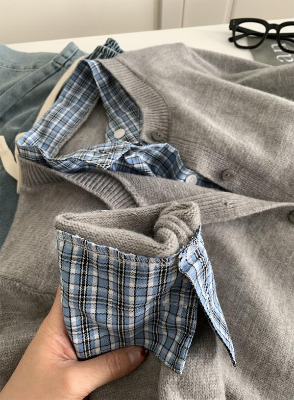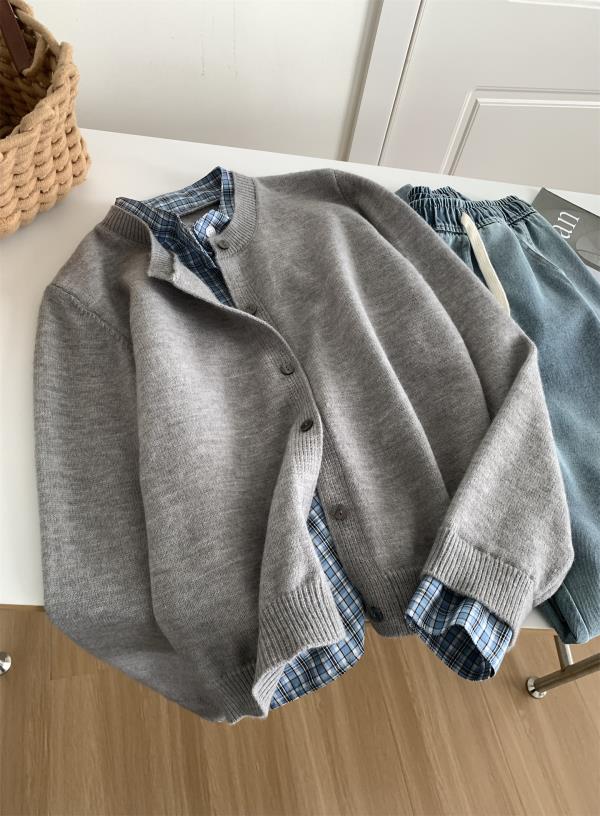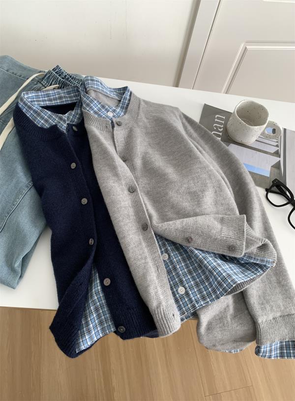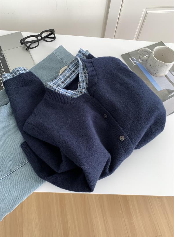 2025秋冬学院风拼接格子假两件针织开衫 显白复古藏青色毛衣外套