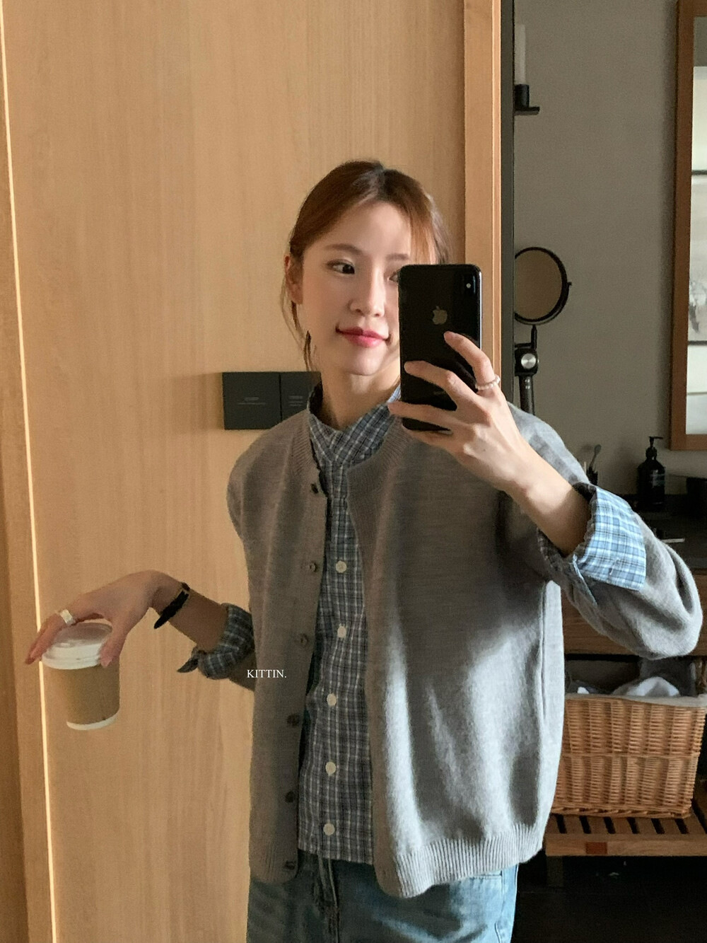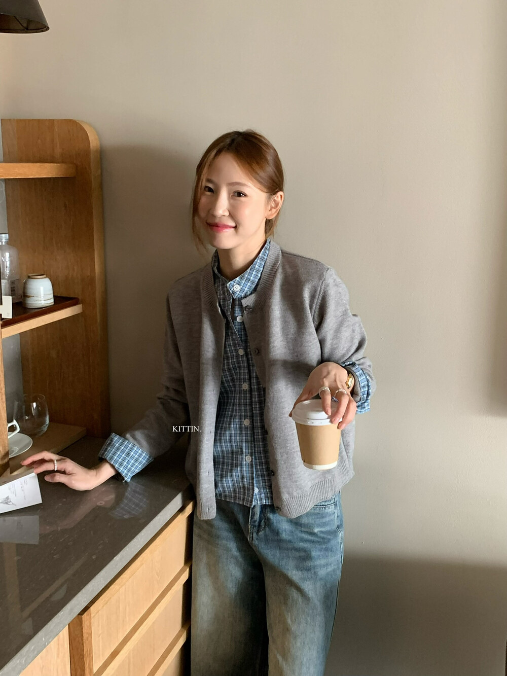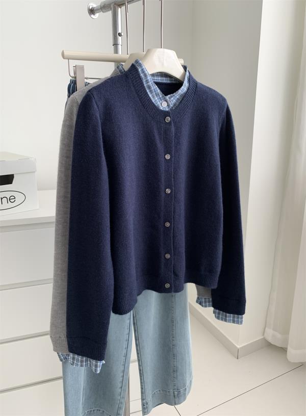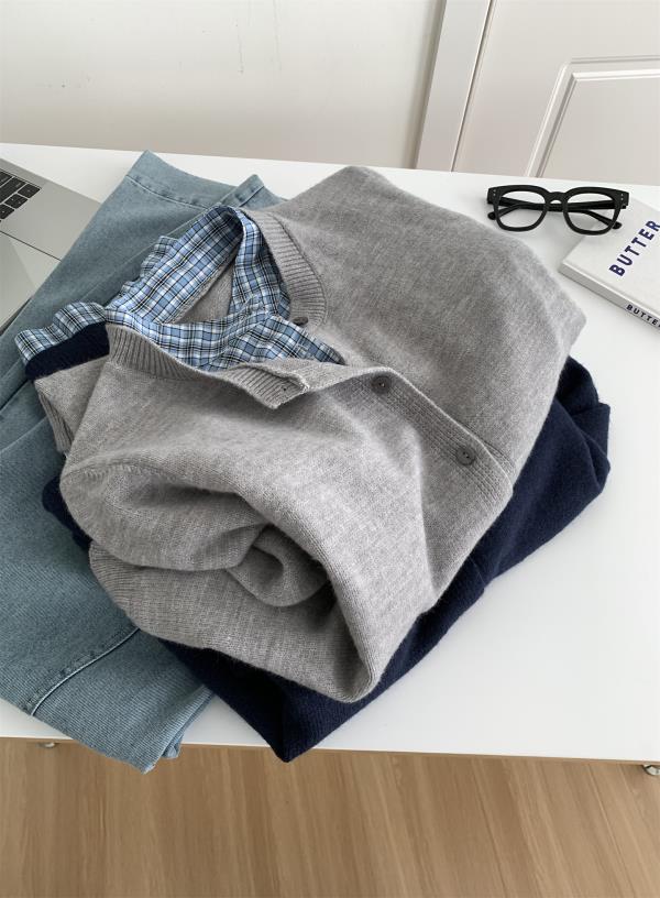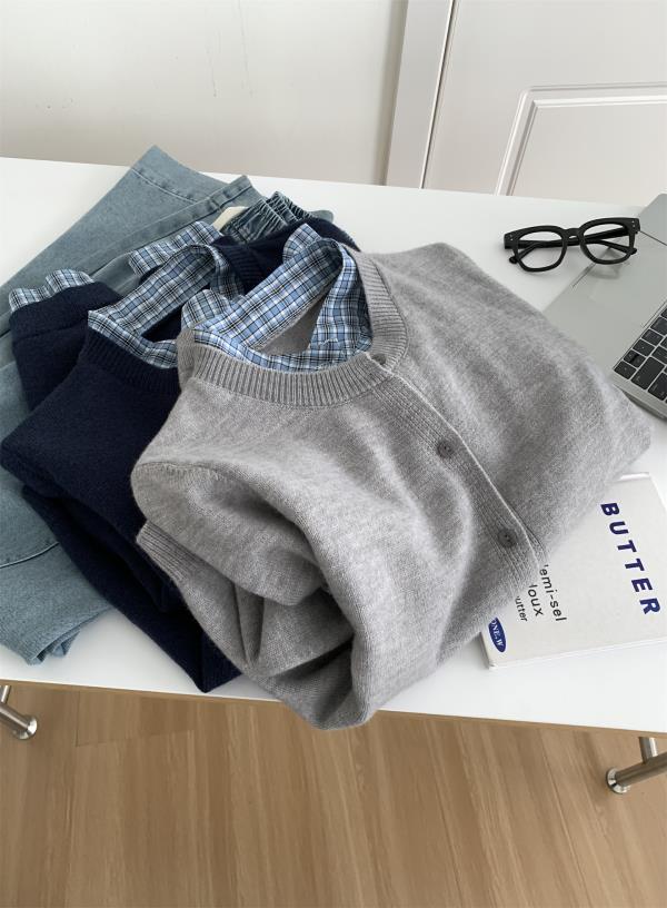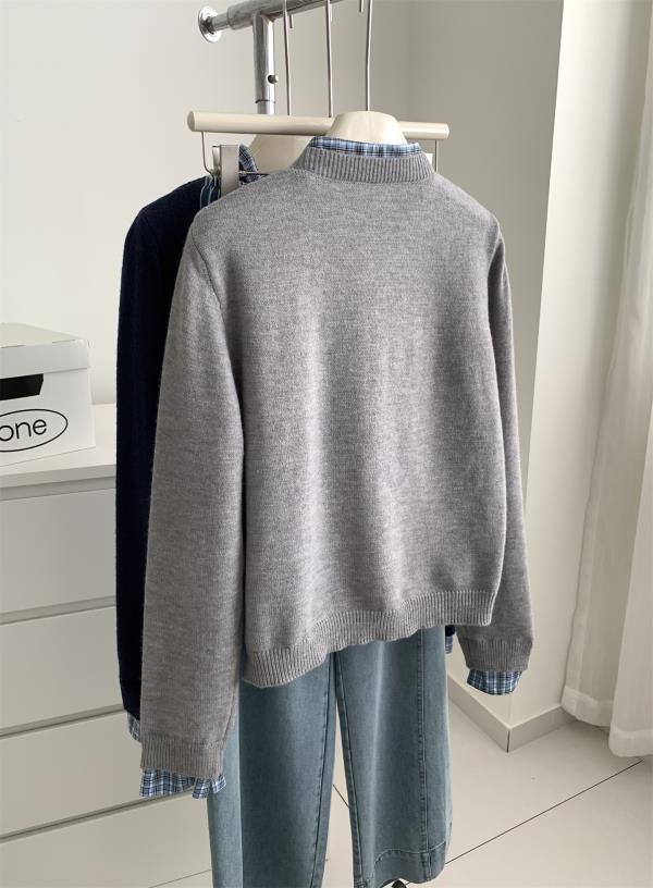 2025秋冬学院风拼接格子假两件针织开衫 显白复古藏青色毛衣外套