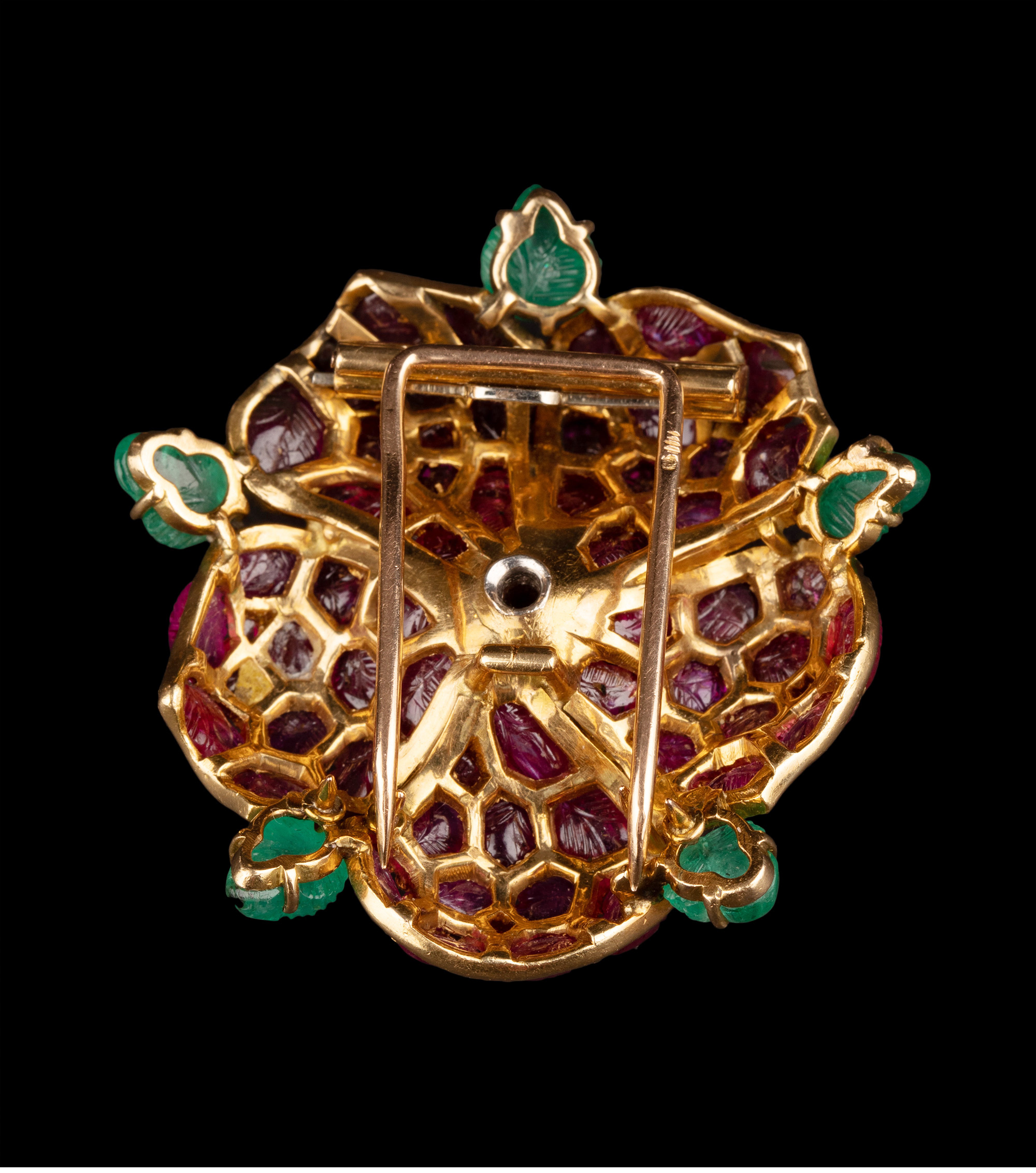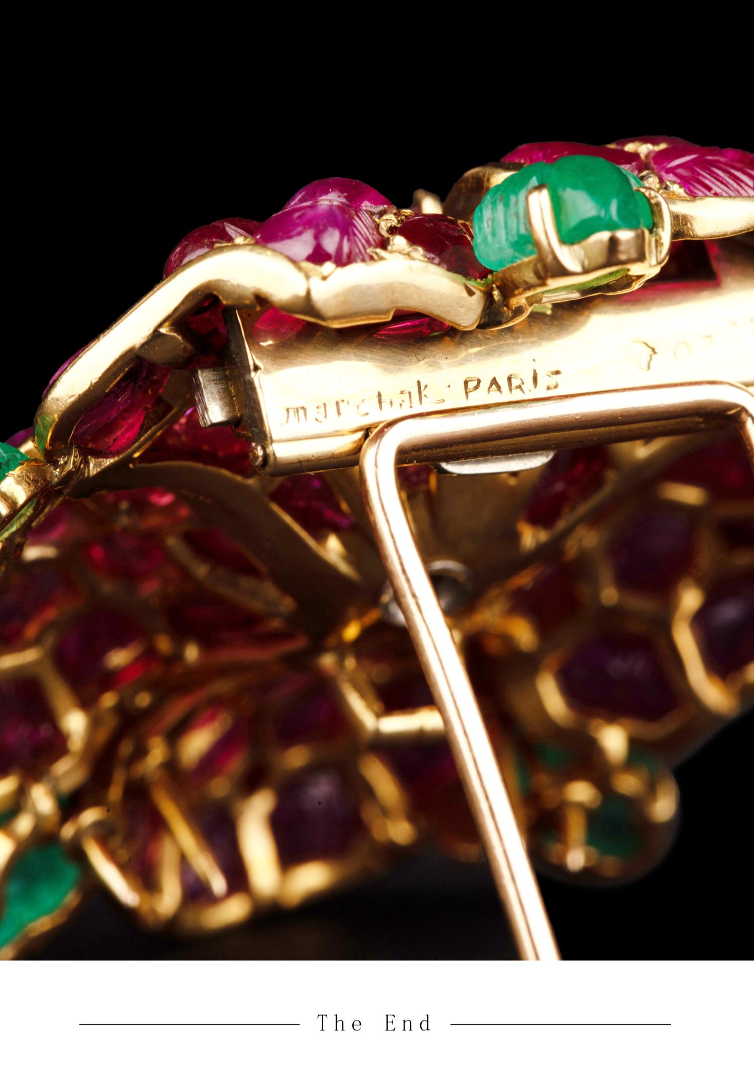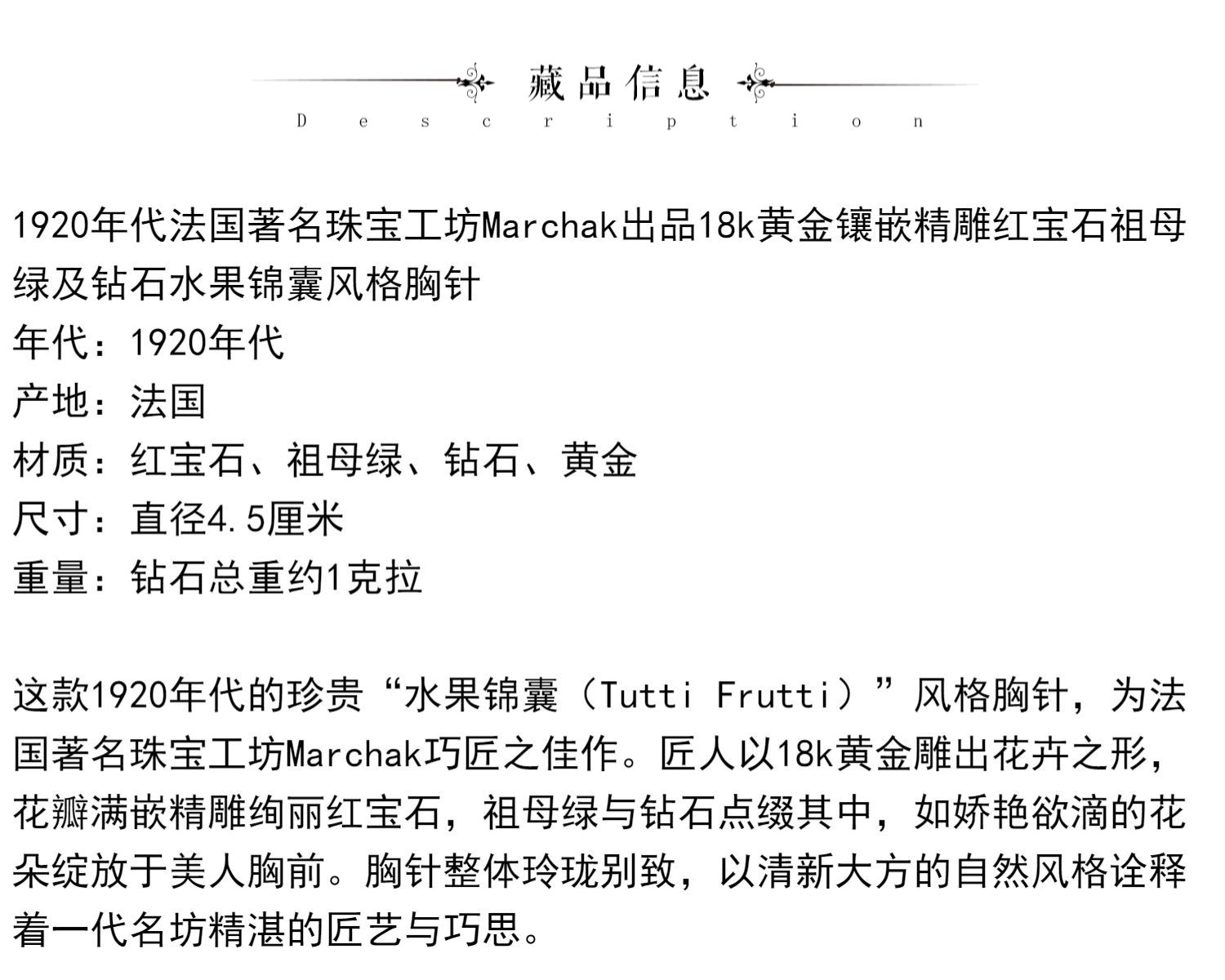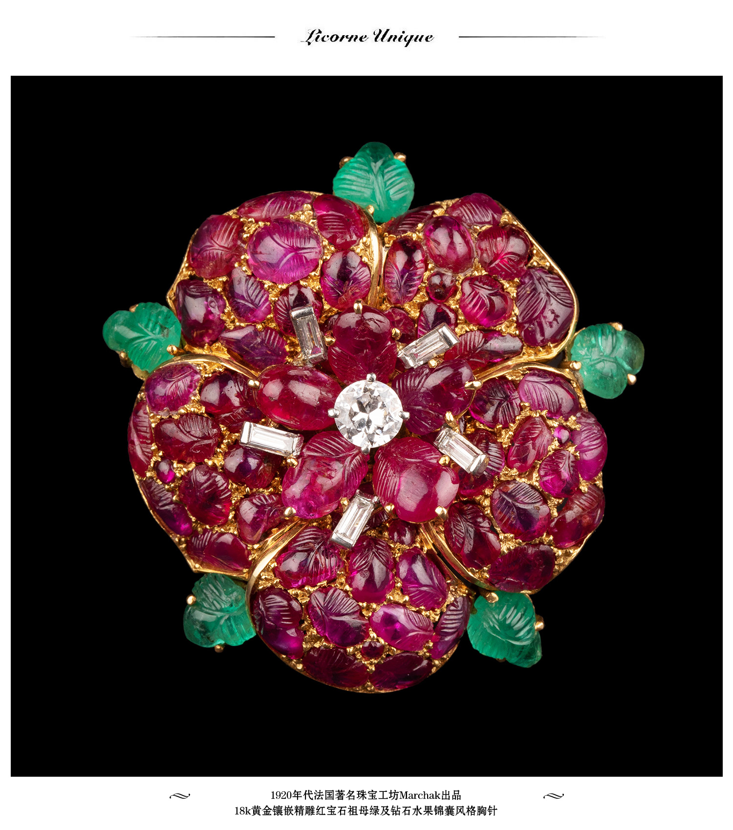 独角鹿西洋古董Marchak18K黄金镶红宝石祖母绿钻石水果锦囊胸针