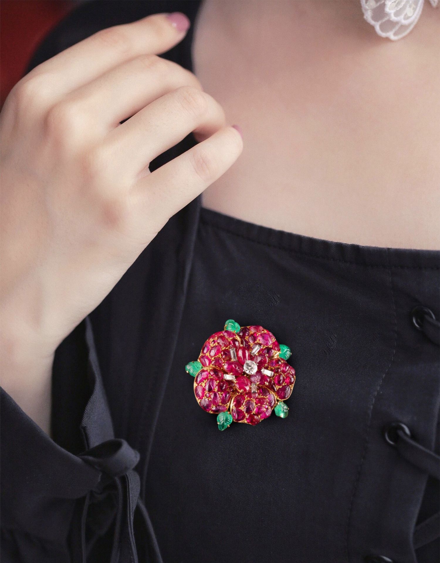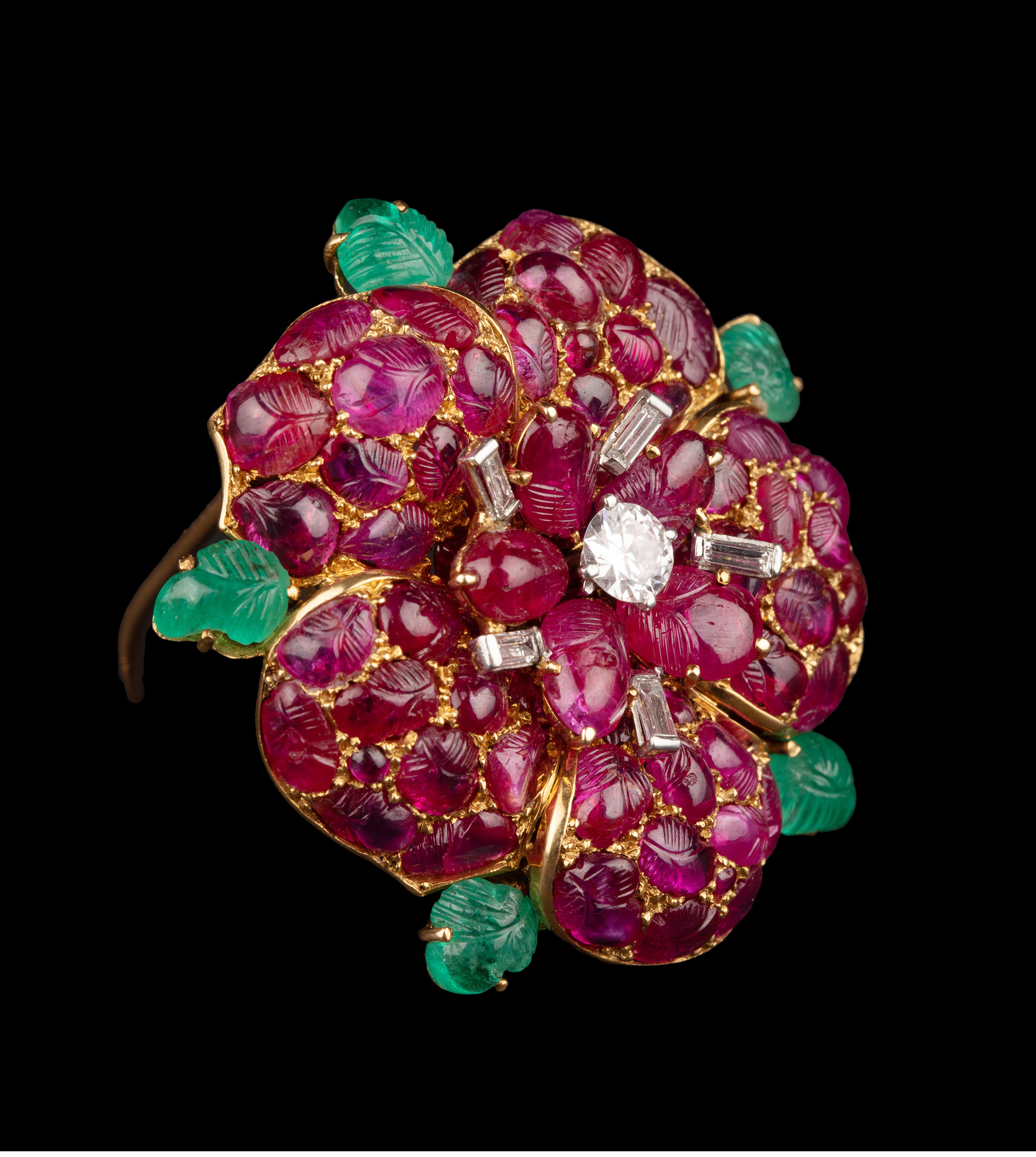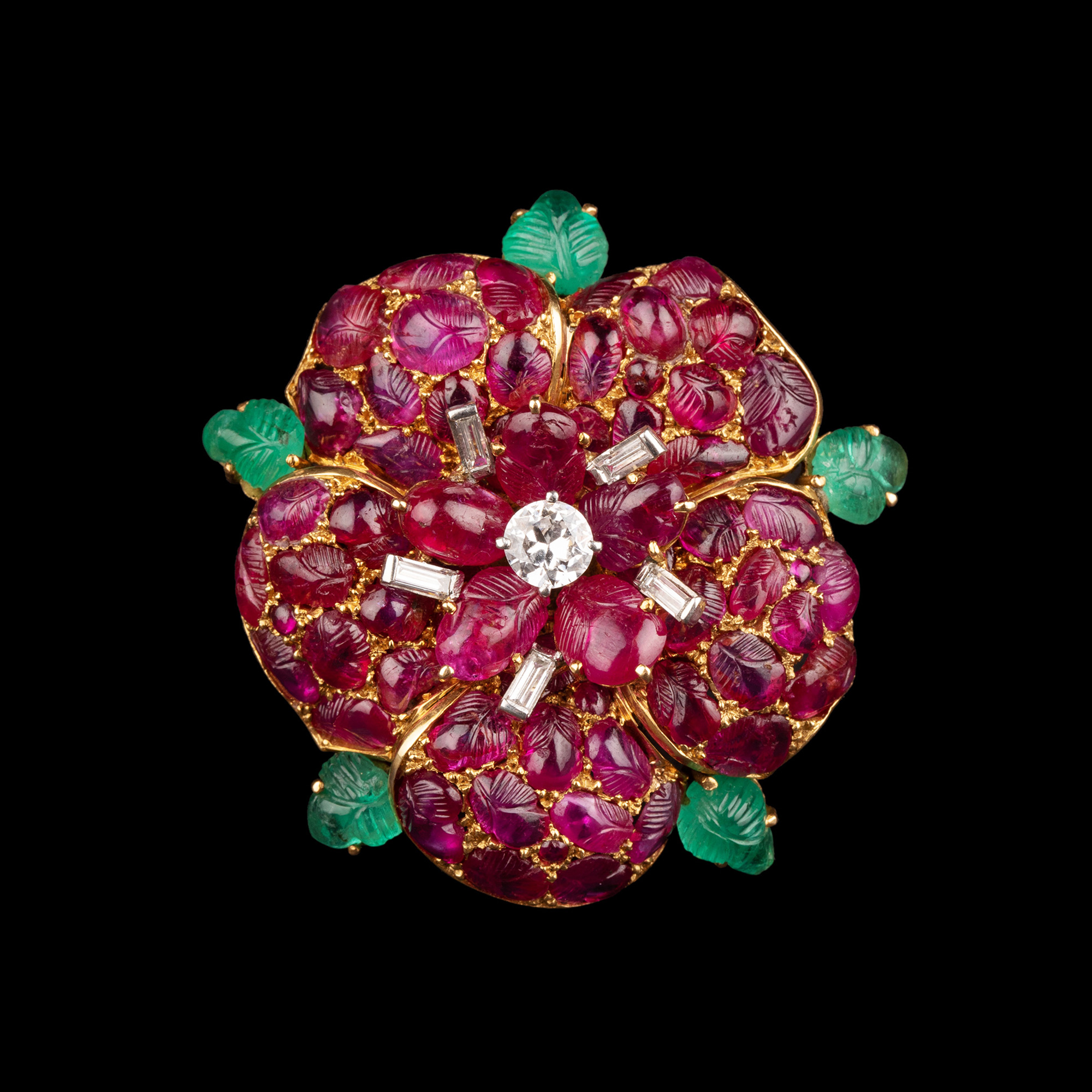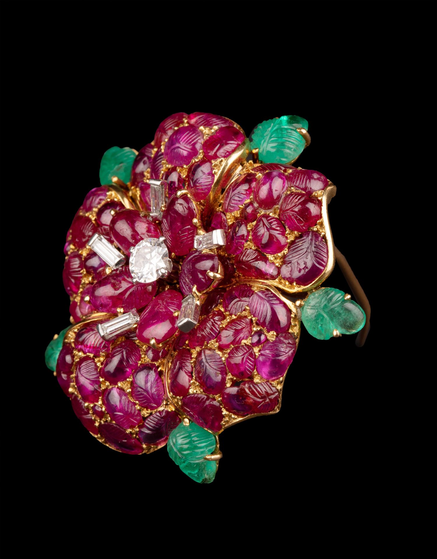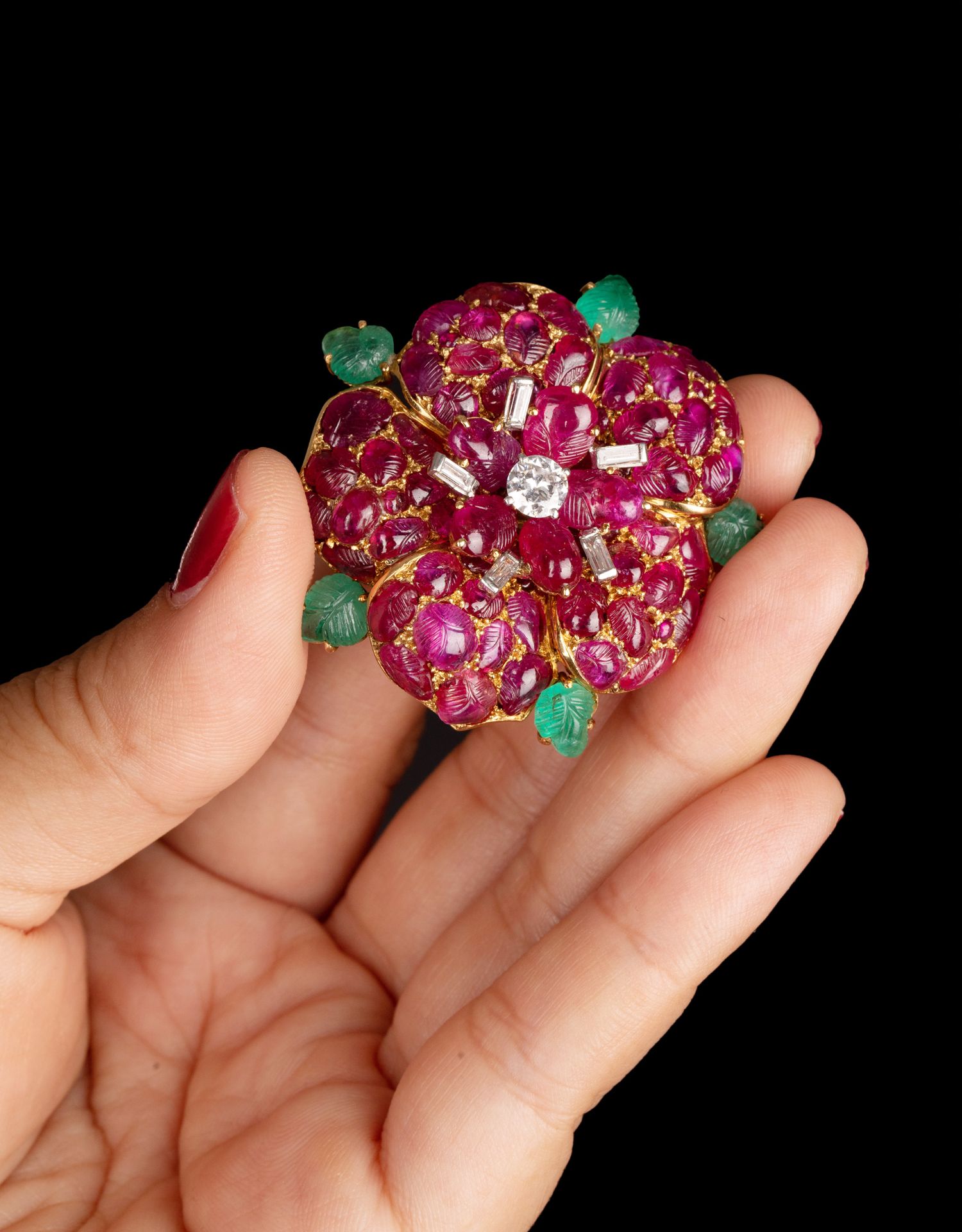 独角鹿西洋古董Marchak18K黄金镶红宝石祖母绿钻石水果锦囊胸针