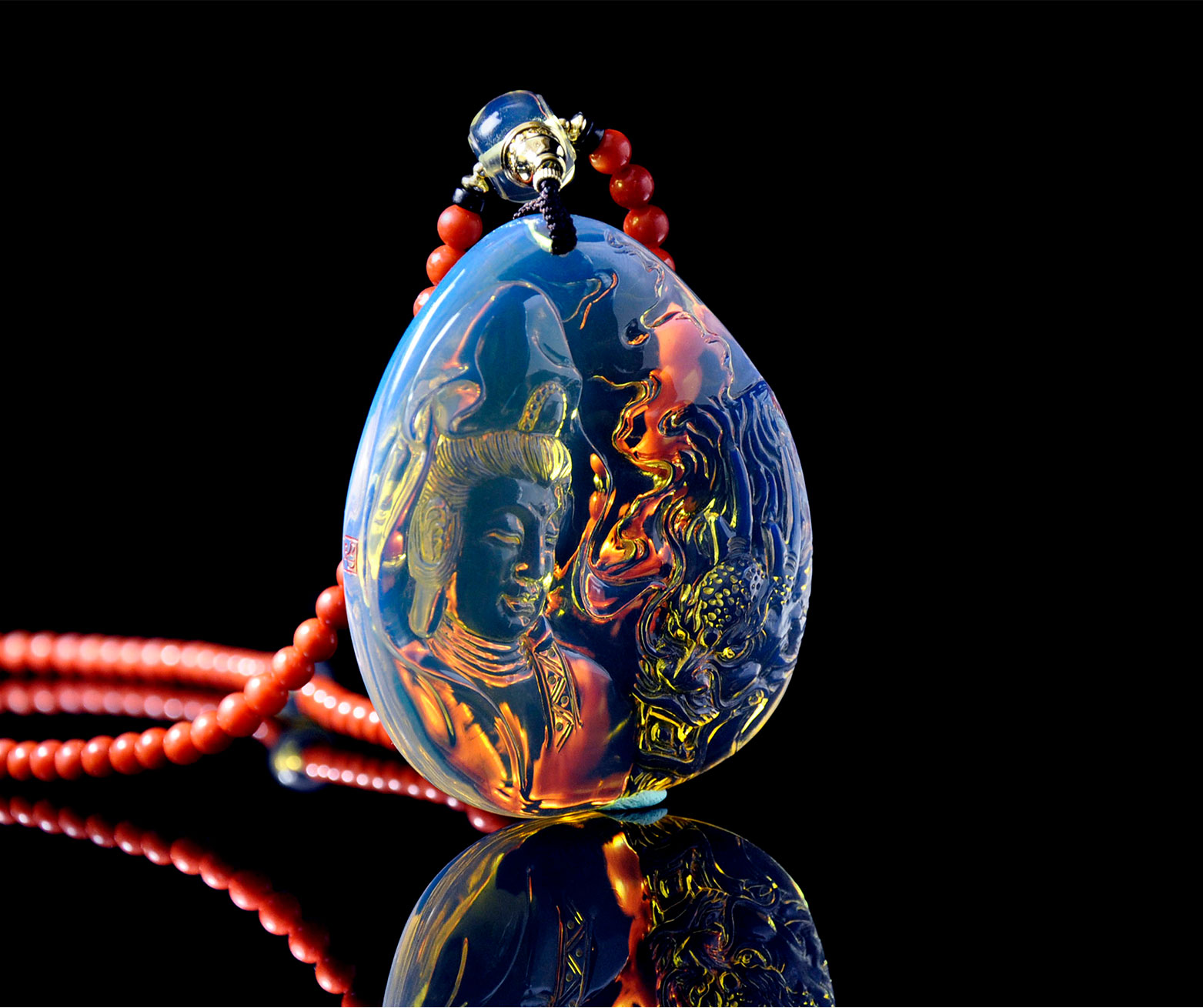 此款观音吊坠,结合观音与龙的图案雕刻于蓝珀之上,观音有种种妙相,各自美丽庄严。