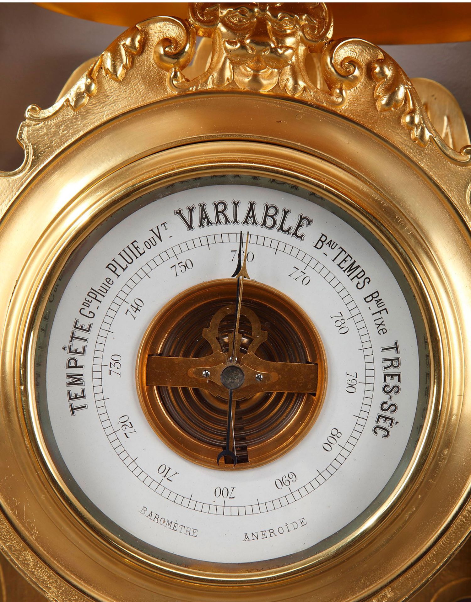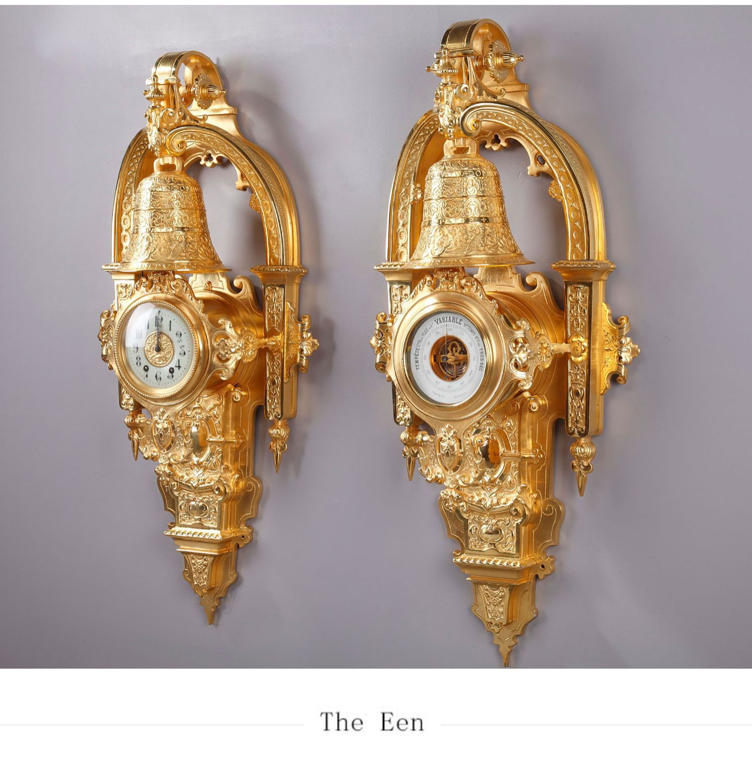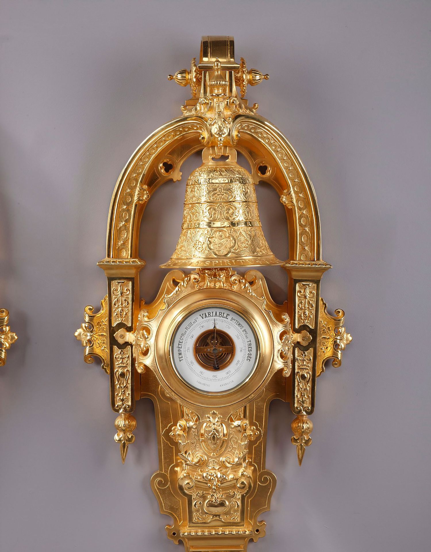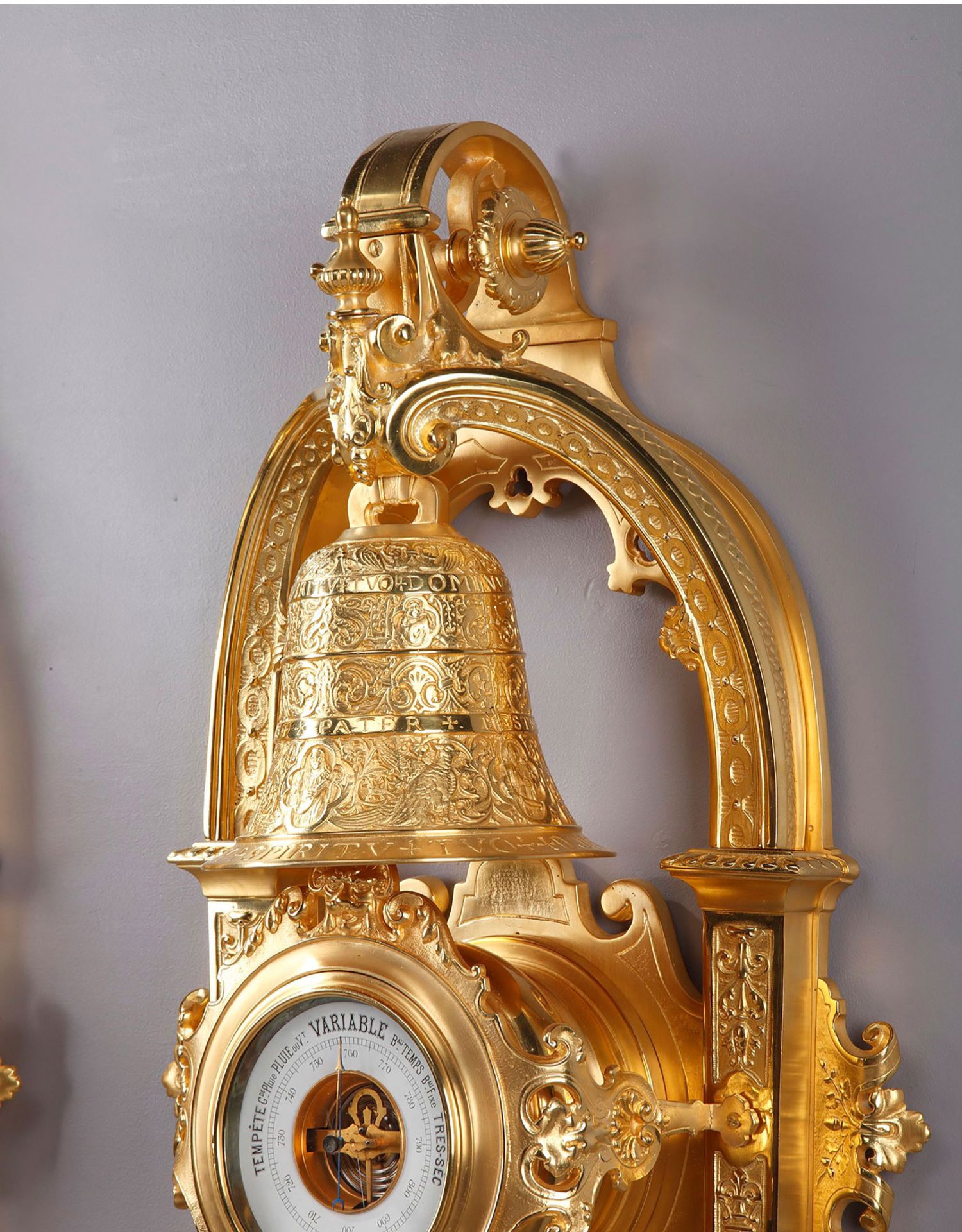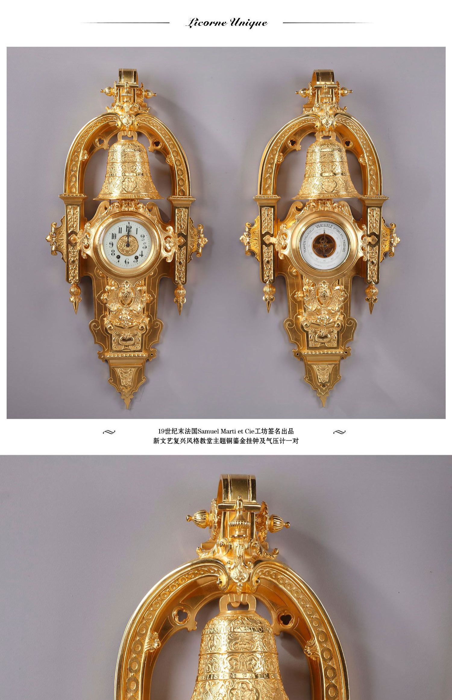 独角鹿西洋古董法国工坊签名教堂主题铜鎏金挂钟及气压计一对