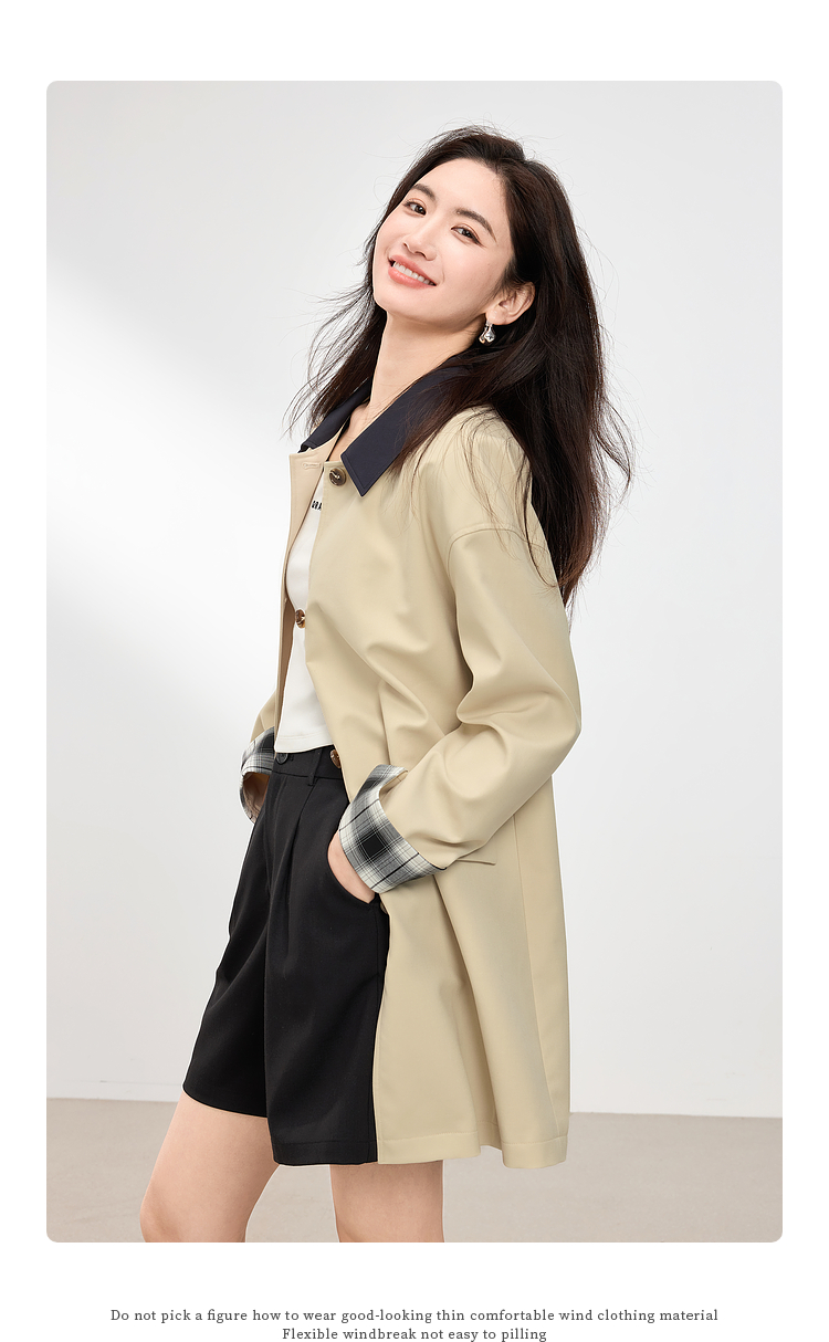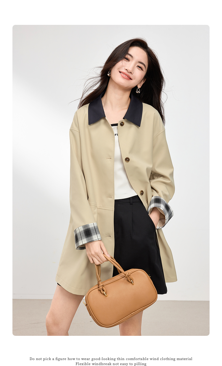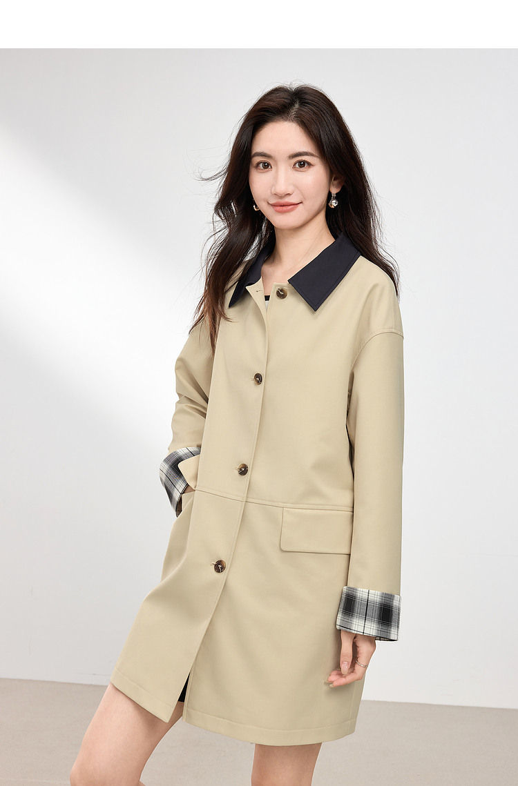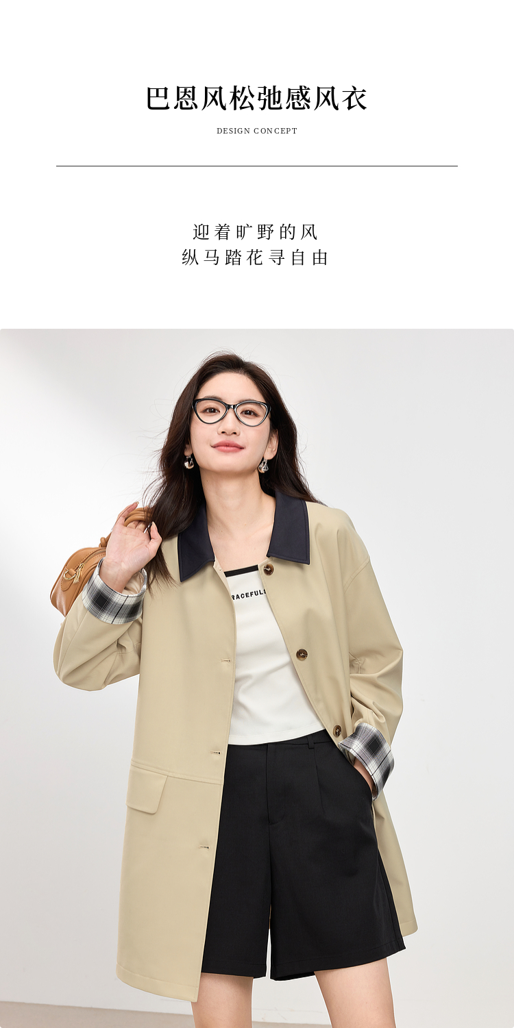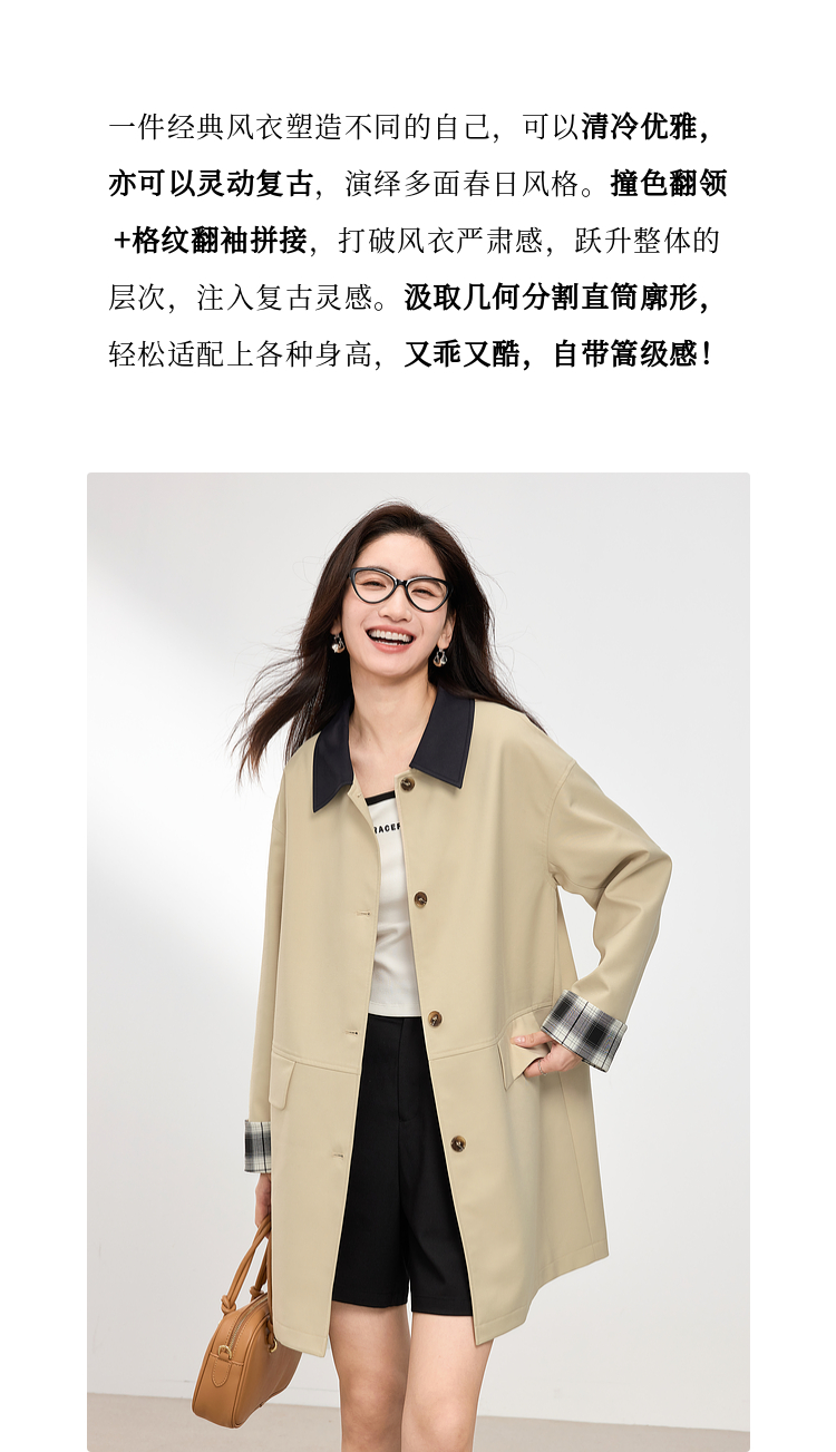 【专属特价】熙世界英伦风外套风衣女中长款2025春秋新款撞色翻领卡其色大衣
