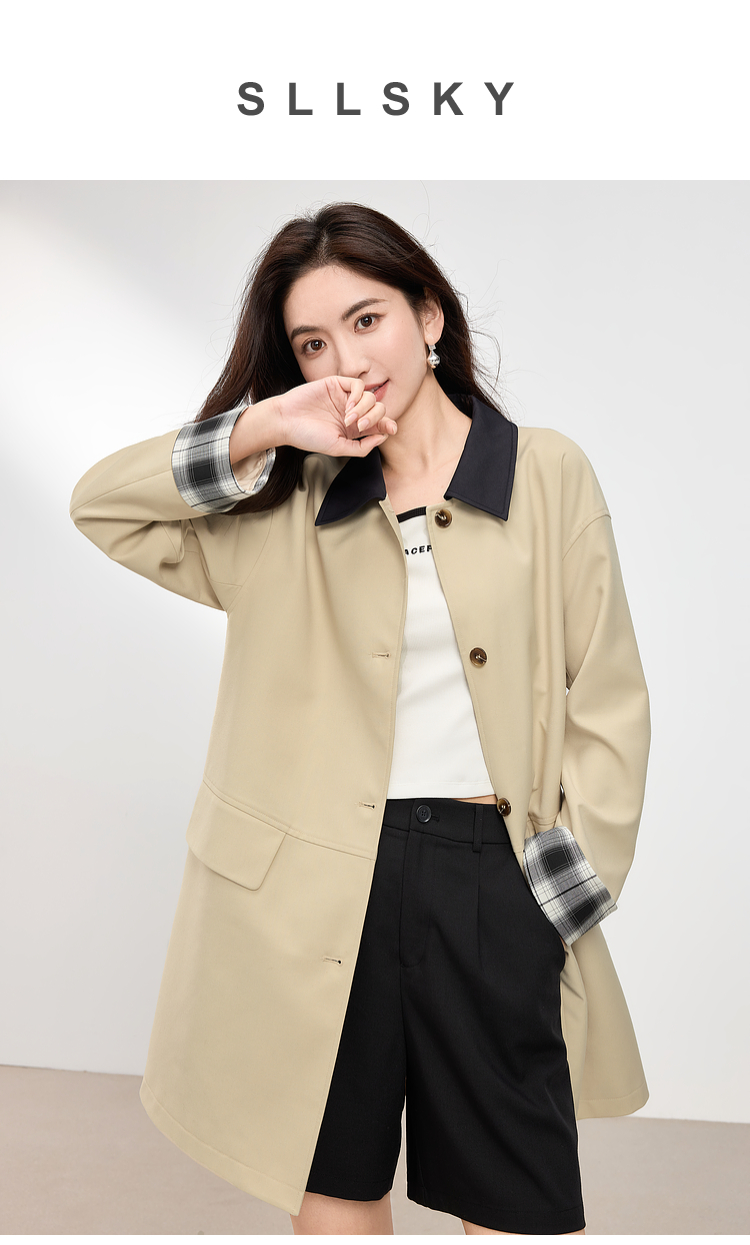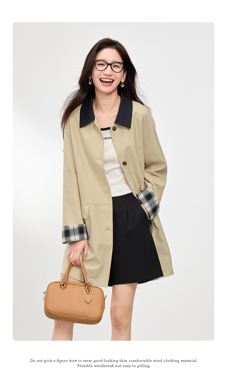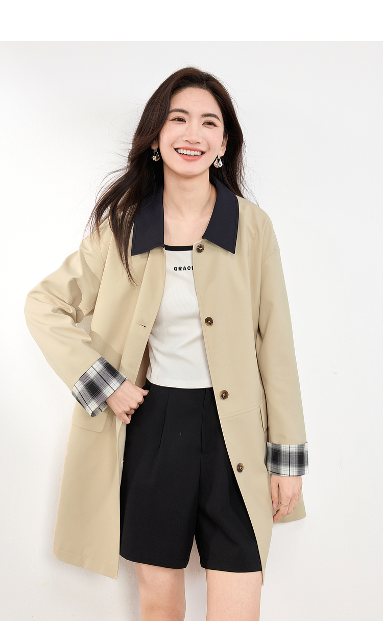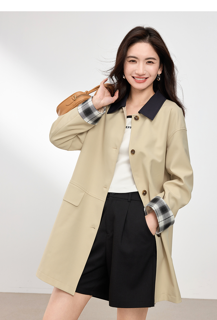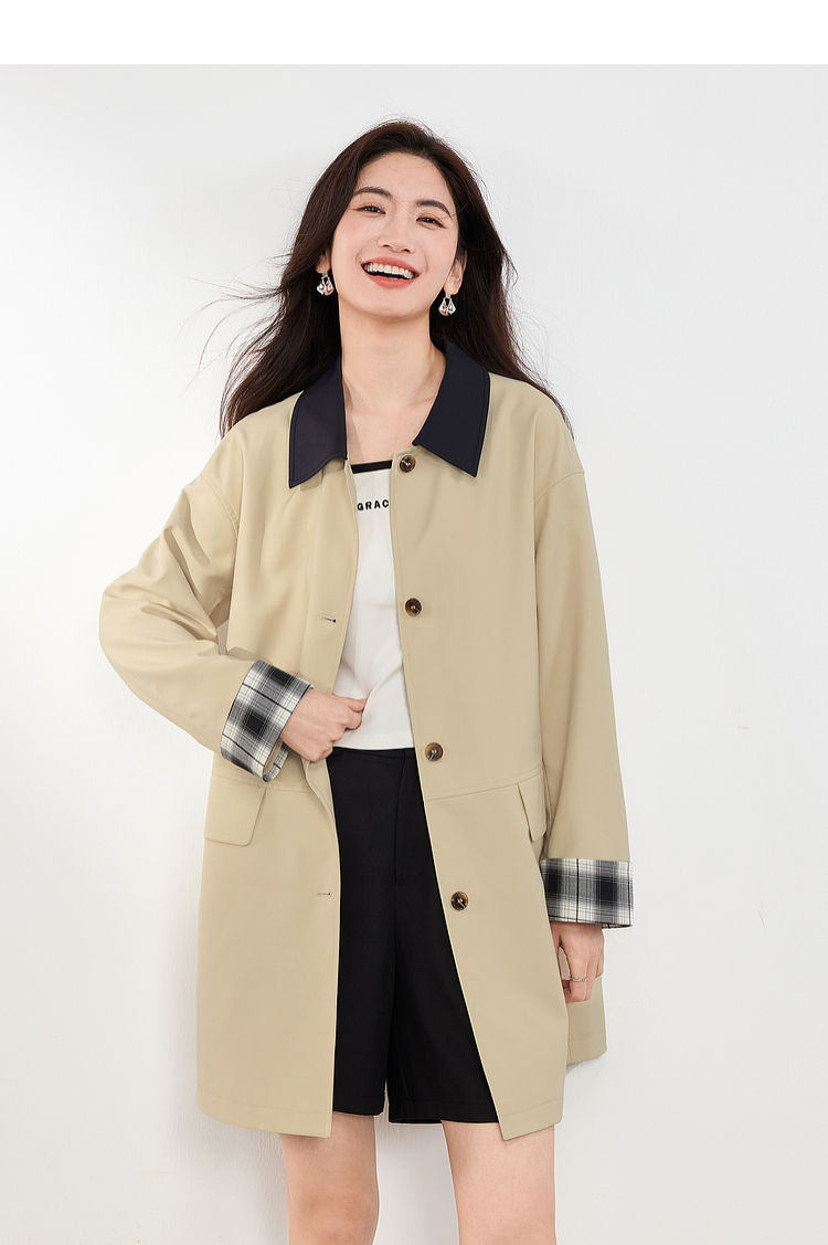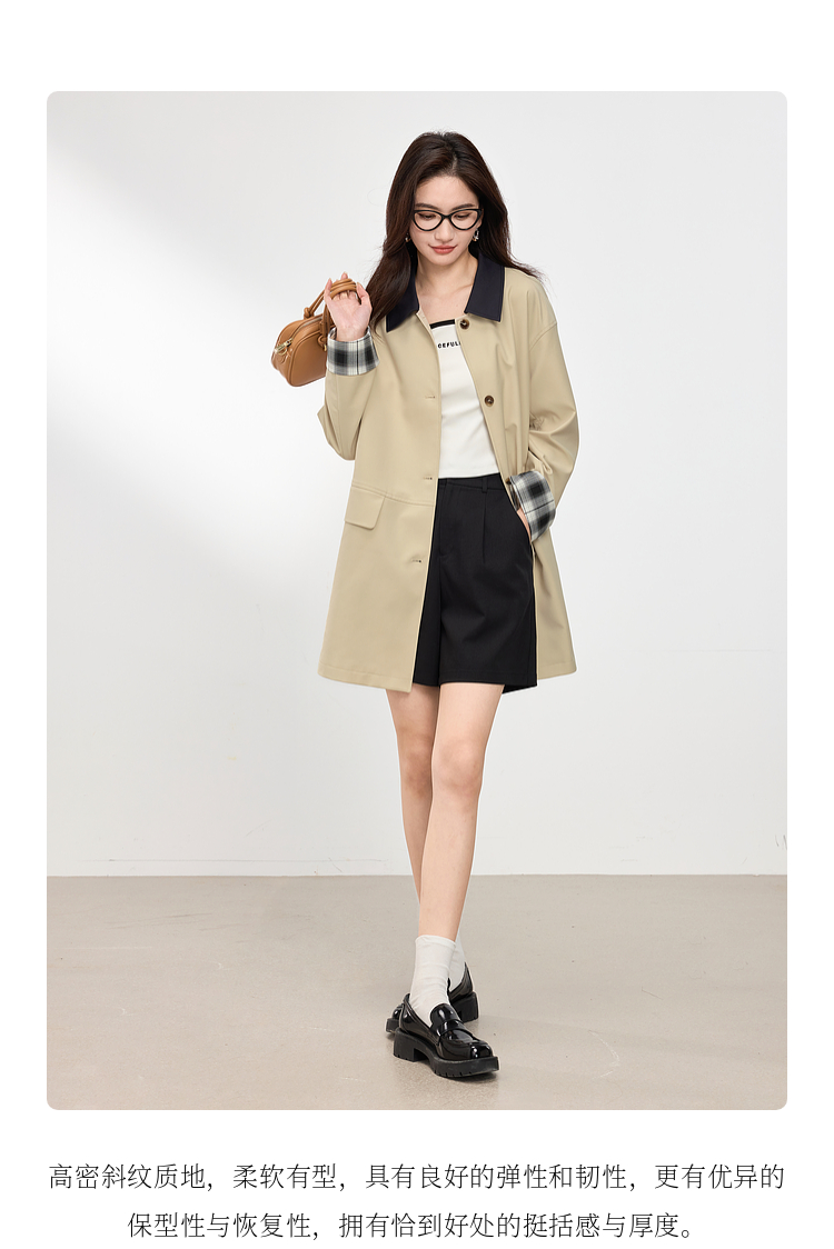 【专属特价】熙世界英伦风外套风衣女中长款2025春秋新款撞色翻领卡其色大衣