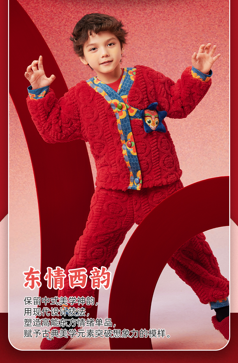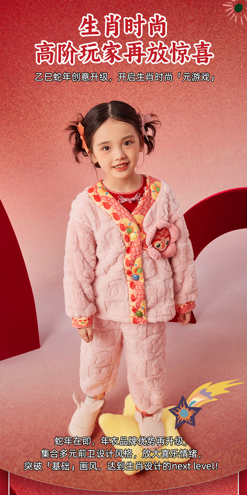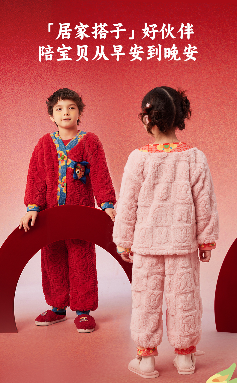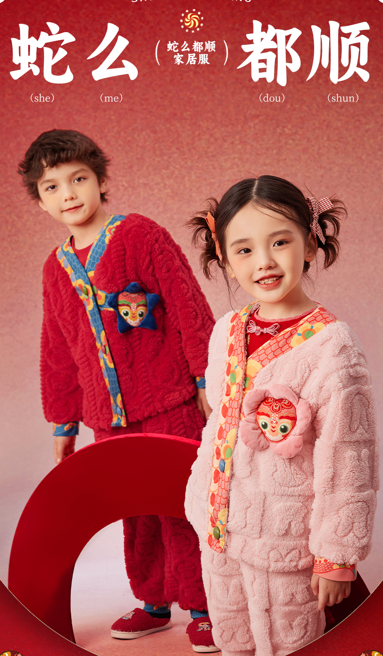 蛇么都旺年衣童装儿童家居服套装2025冬新款男女童睡衣本命年红色保暖套装