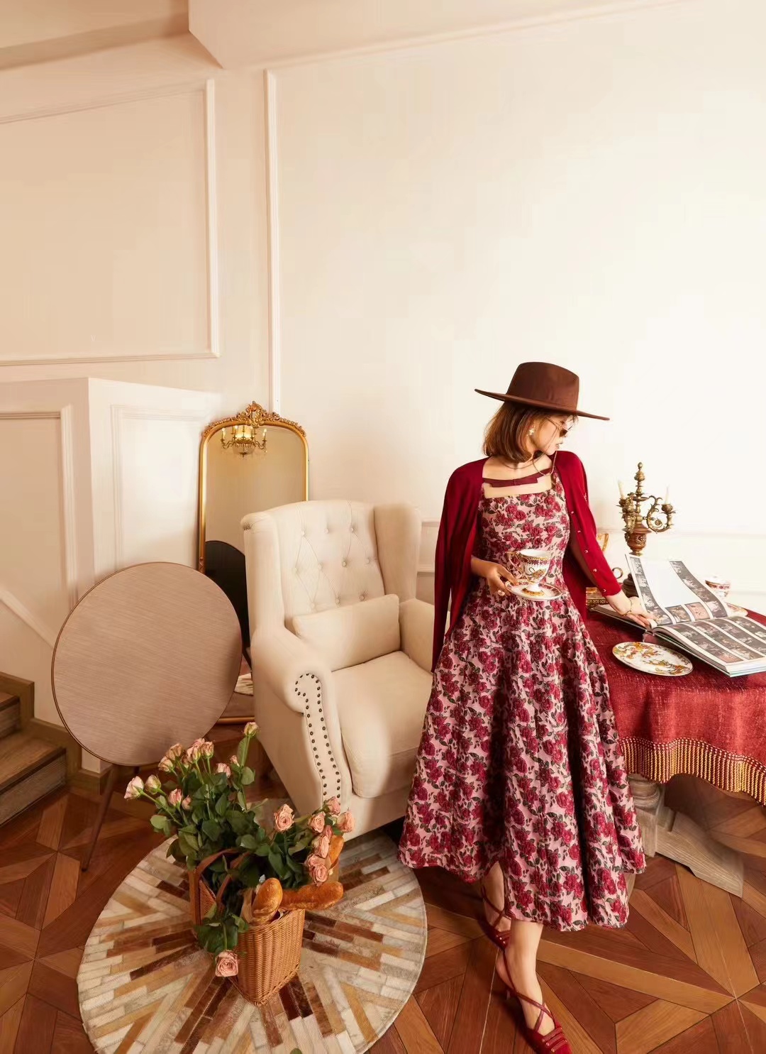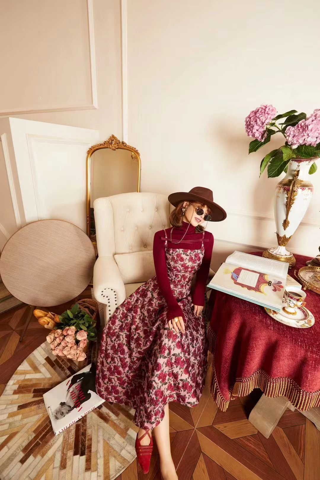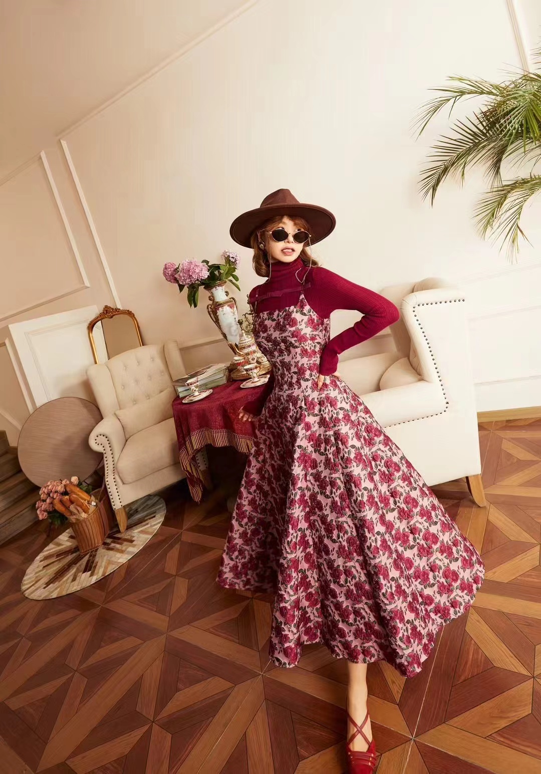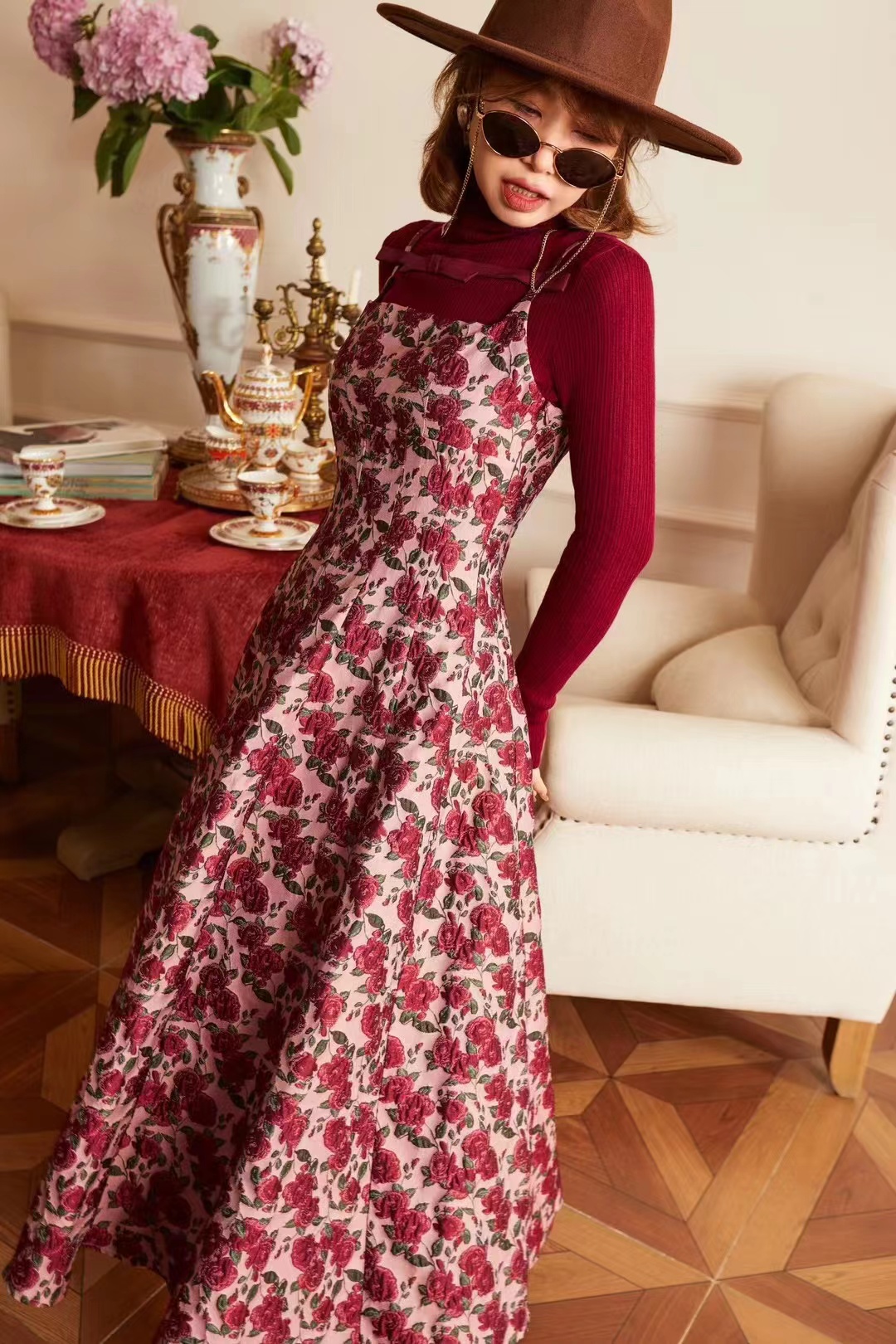 71125 # 早春款 贵气轻奢重工刺绣 复古精致高级半连身裙 设计经典耐看 一眼心动 重工刺绣工艺 花型立体生动 红S~X L码