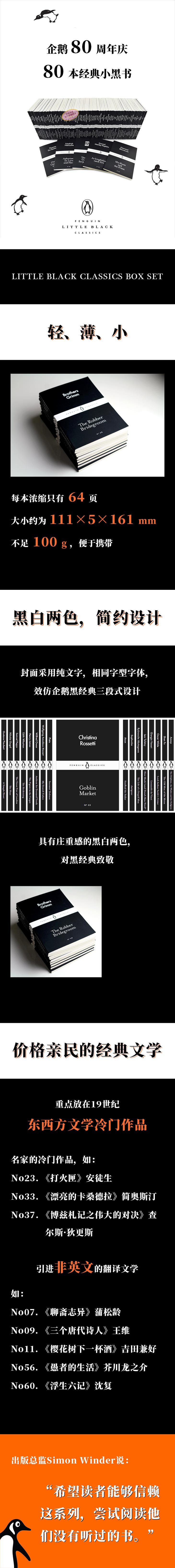 2015年,为了庆祝出版社成立80周年,企鹅图书公司送给自己一份生日礼物——1套包含80部经典短篇图书的系列丛书,名为"Little Black Classics"。