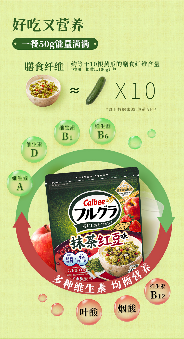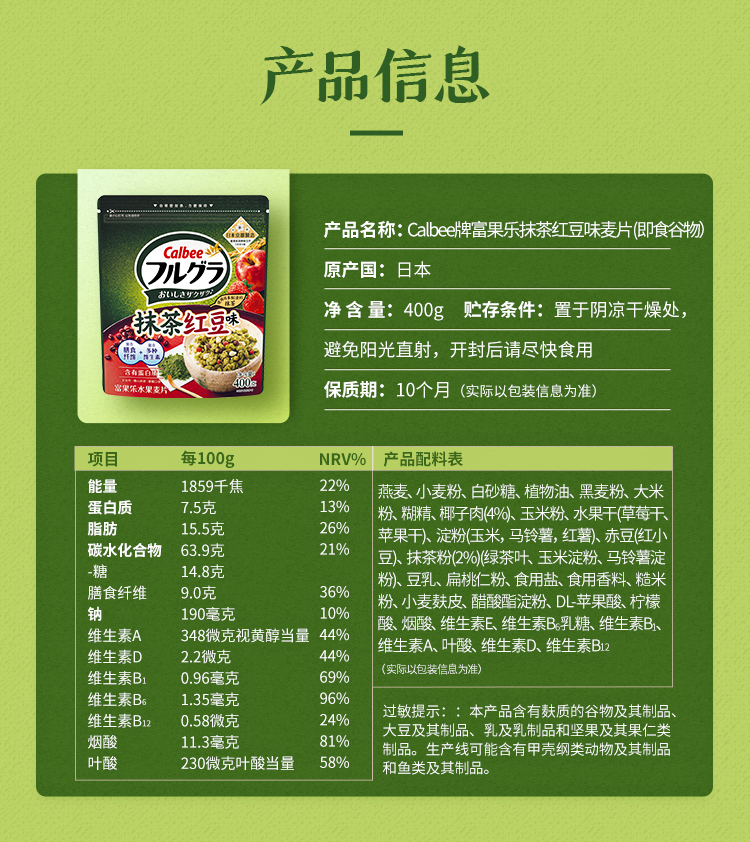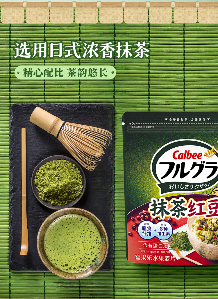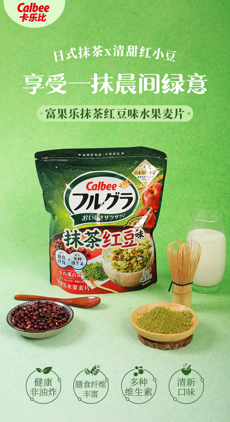 Calbee牌富果乐抹茶红豆味麦片即食谷物400g/032562 日式抹茶*清甜红小豆