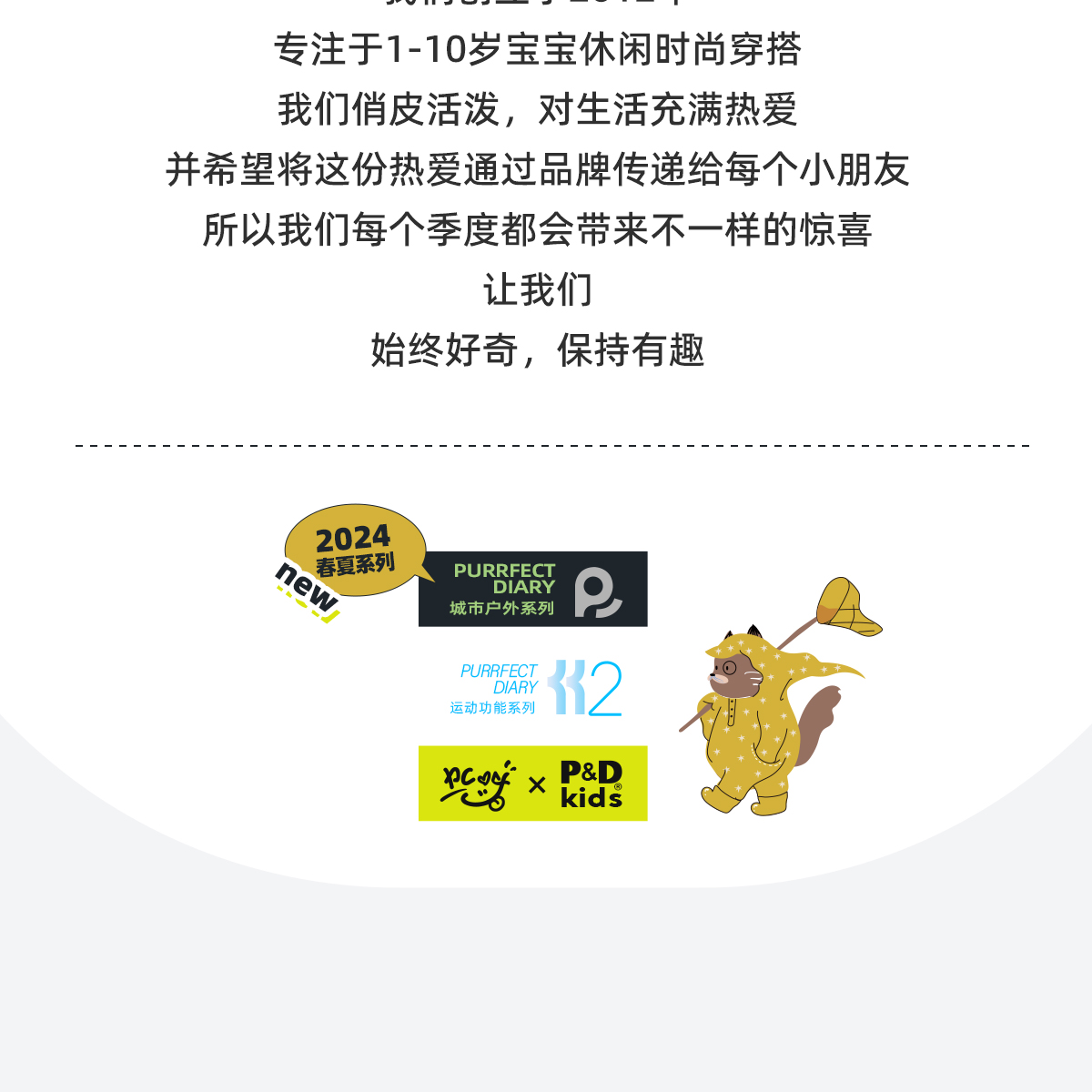 - Purrfect-Diary专注于贴近自然随性的穿着概念,轻奢平价的童装文化传播,在产品设计上更加注重婴童穿着的舒适性、安全性、更出众的国际化品牌,将欧美的育婴文化在中国进行深入的传播与推广。