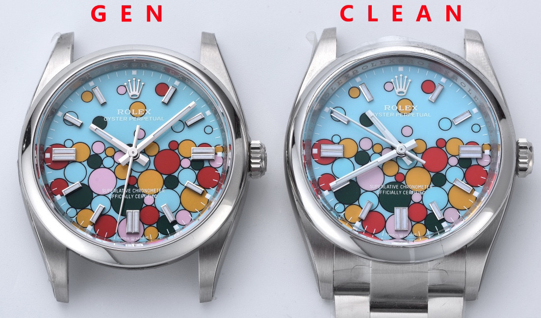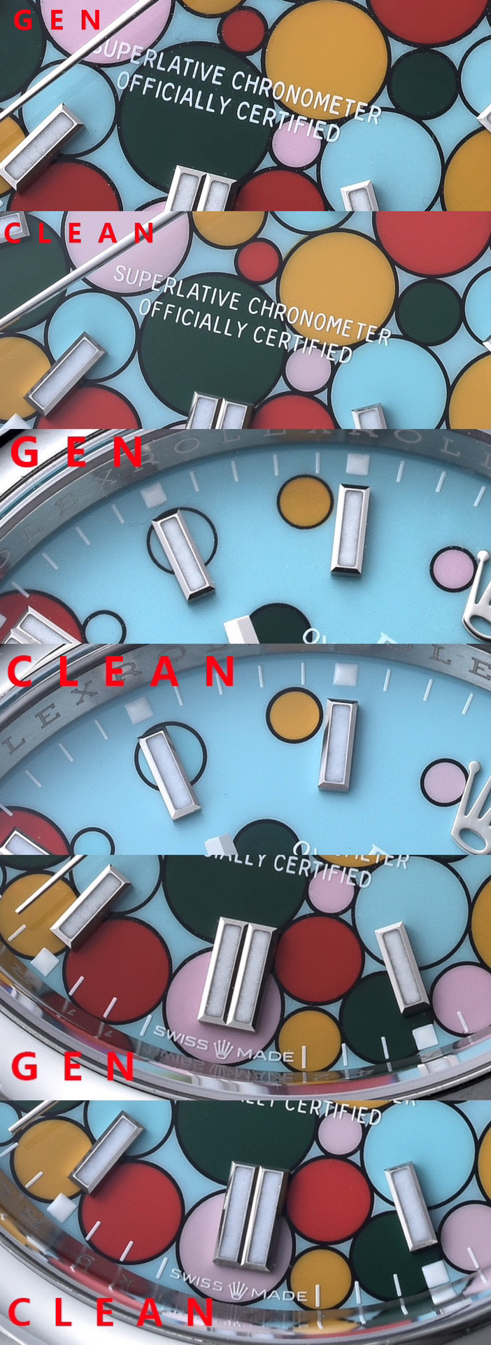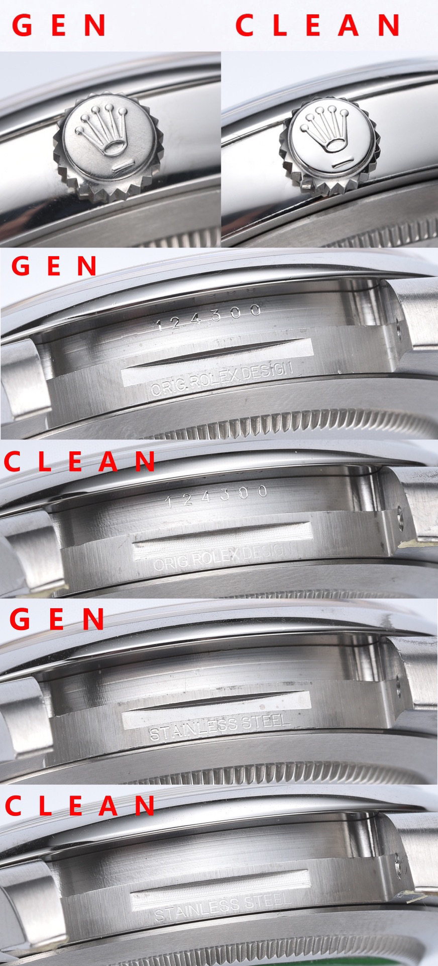 本次41mm恒动搭载3230机芯 完全一比一开模 随后附上真假对比 所有配件相似度极高,特别是蒂芙尼蓝色 花费近20w元一比一拆解 。熟悉的表友都知道,同款银面真品价格才5w左右,但是蒂芙尼蓝因为配色的特殊性 价格一度被炒到20w+ clean对于细节的追求大家有目共睹。表扣上的logo也是工艺的一大突破。cnc雕刻,形状规整 并且内侧伴有亮光处理。