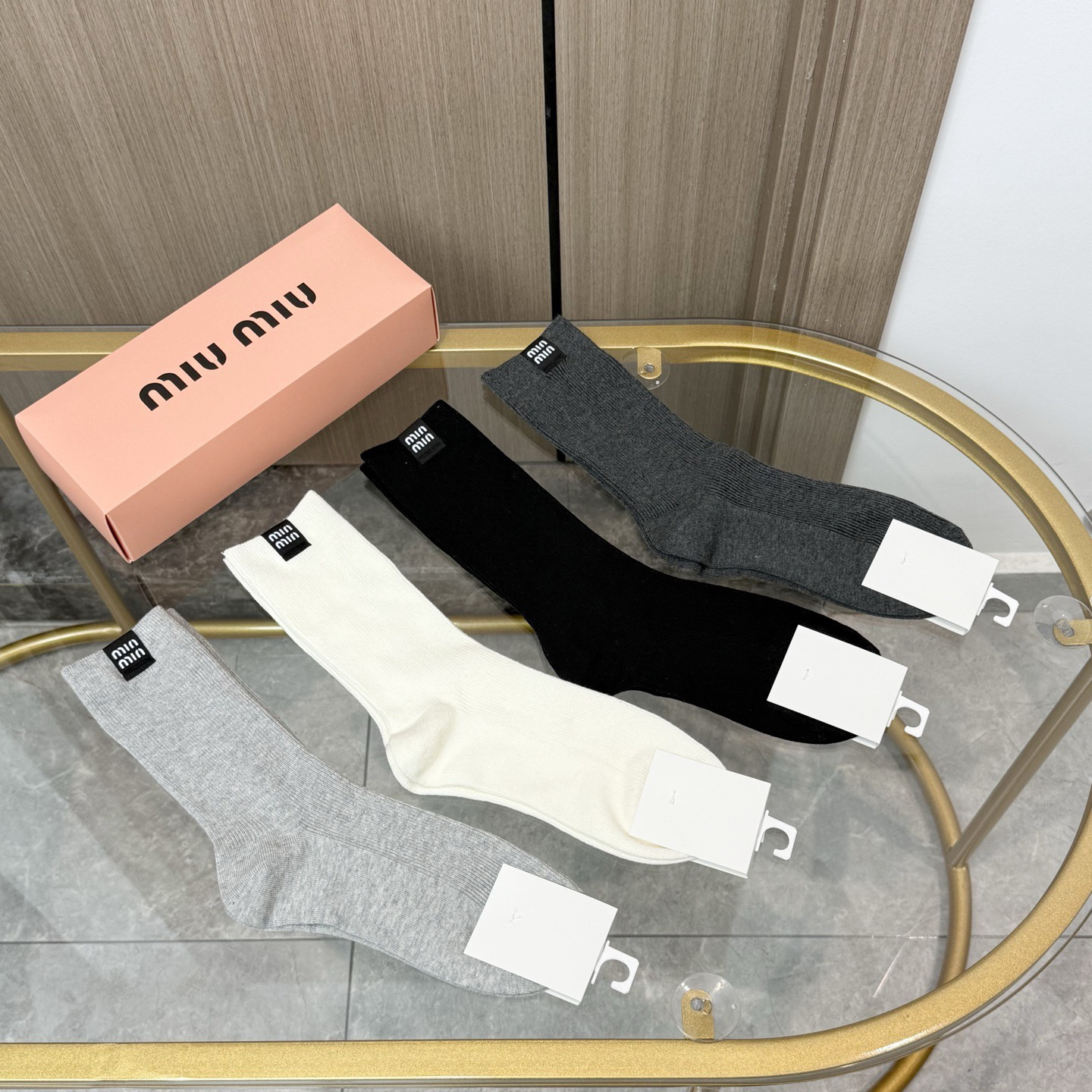 秋冬特惠💰140【一盒四双】MIUMIU 缪缪高版本袜子 ~好看到爆炸 MIUMIU 袜子 双针烫印中筒袜