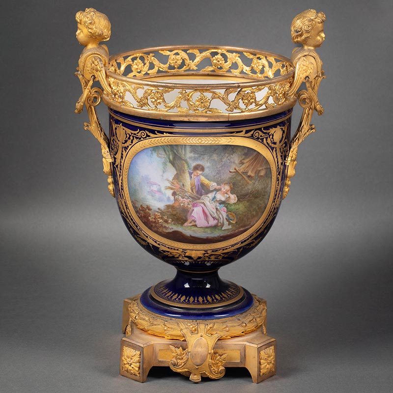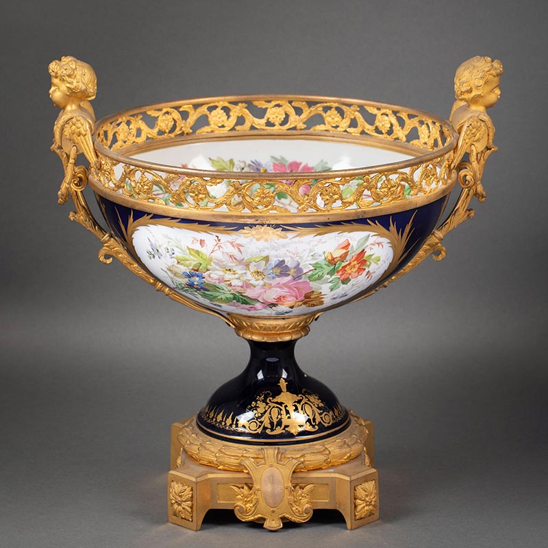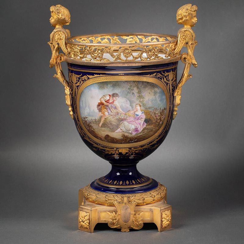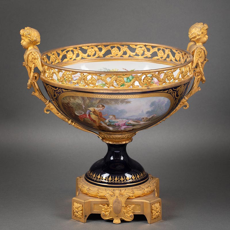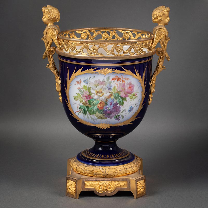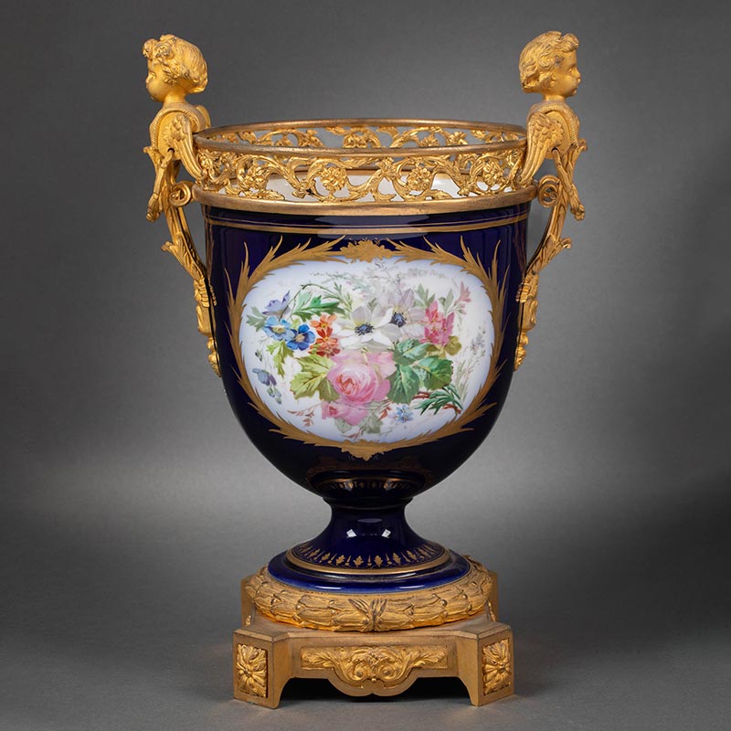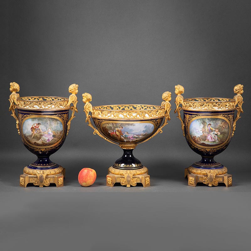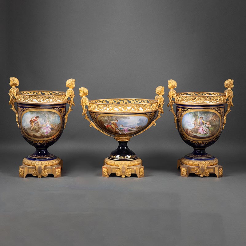 19世纪末法国出品小天使铜鎏金精雕嵌花卉人物主题手绘描金装饰深蓝釉花盆三件套