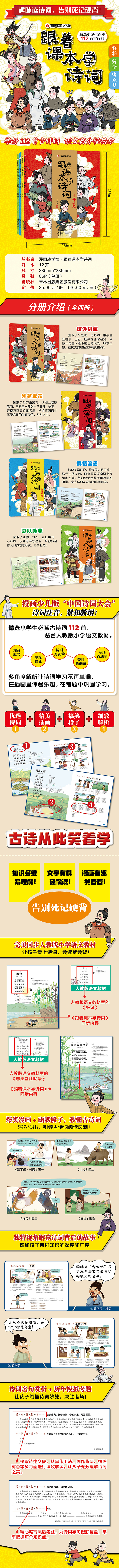 【6-10岁】《漫画趣学馆:跟着课本学诗词》(全4册)紧扣教纲!小学诗词就靠它 精选小学生课本112首古诗词