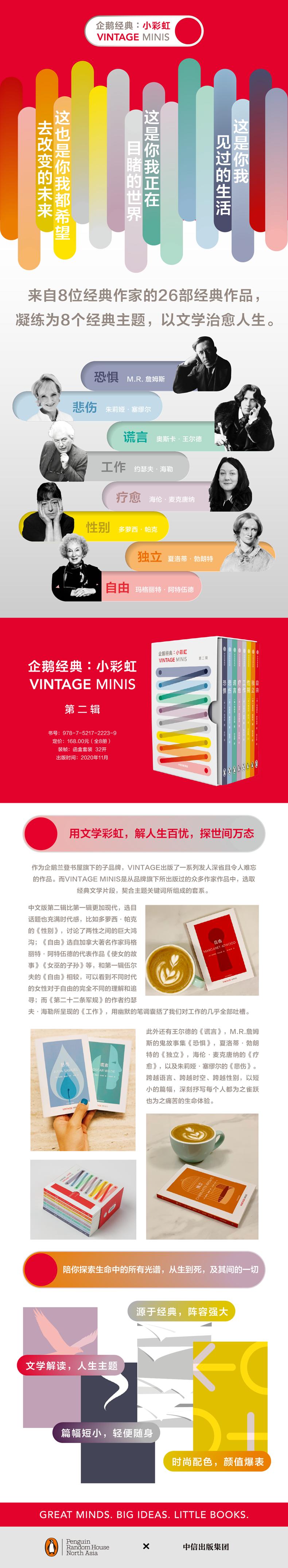 企鹅小彩虹,口袋书之歌,以轻逸对抗沉重生活,人生问题的“答案之书”。小彩虹系列第二辑由8本小开本口袋书组成,内含8位世界文学大家,聚焦人生经历。每册以一个关键词命名,摘选作家一本或多本作品的精选片段,阐释由“生” “死” 的各种人生命题。与小黑书不同,小彩虹系列并不以知名作家的冷门作品为重,而是更关注主题本身,探讨那些使人之所以为“人”的体验。设计上承袭极简主义风格,每一本的封面以与书内容主题相适应的简洁色块为主,兼具审美和收藏价值,方便通勤携带。