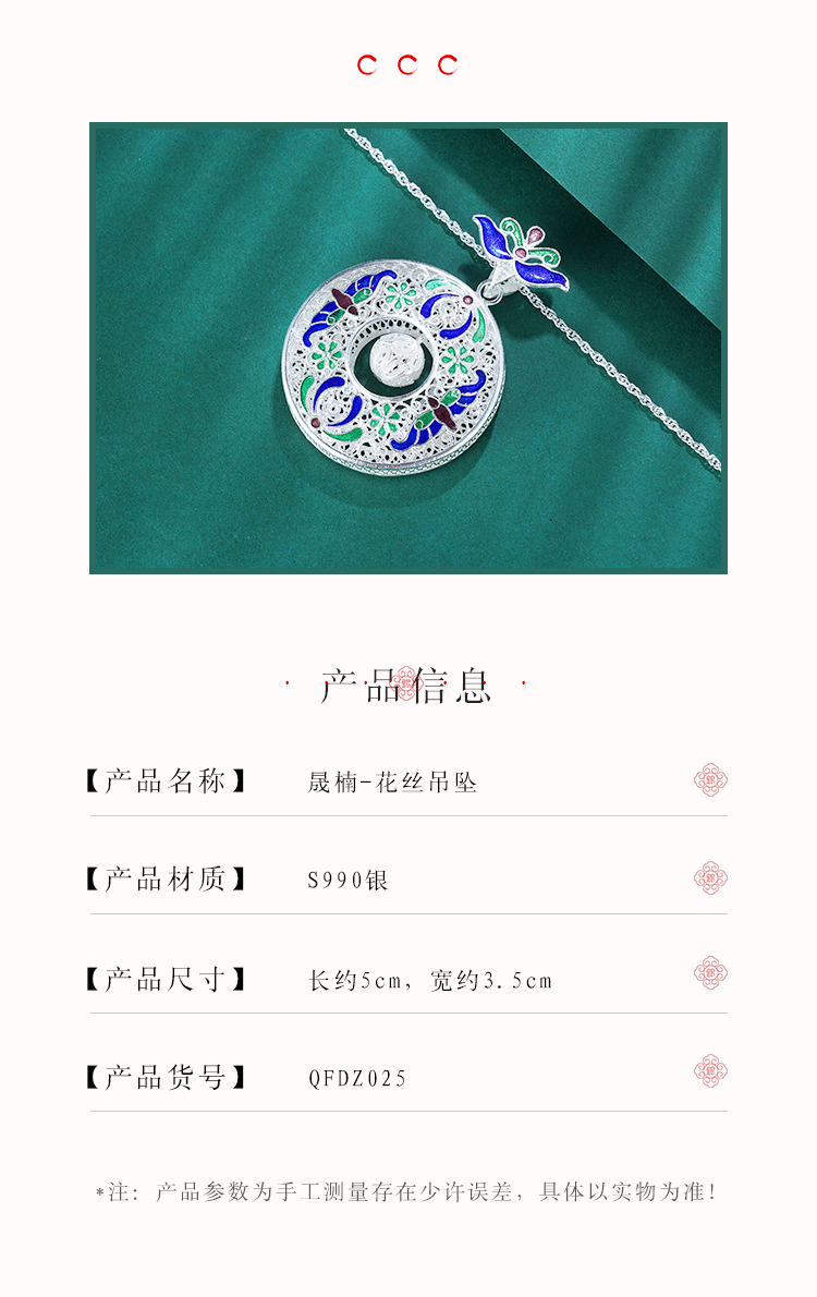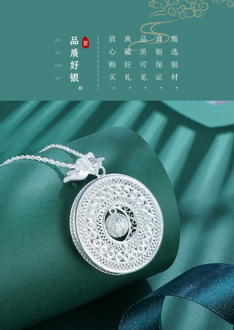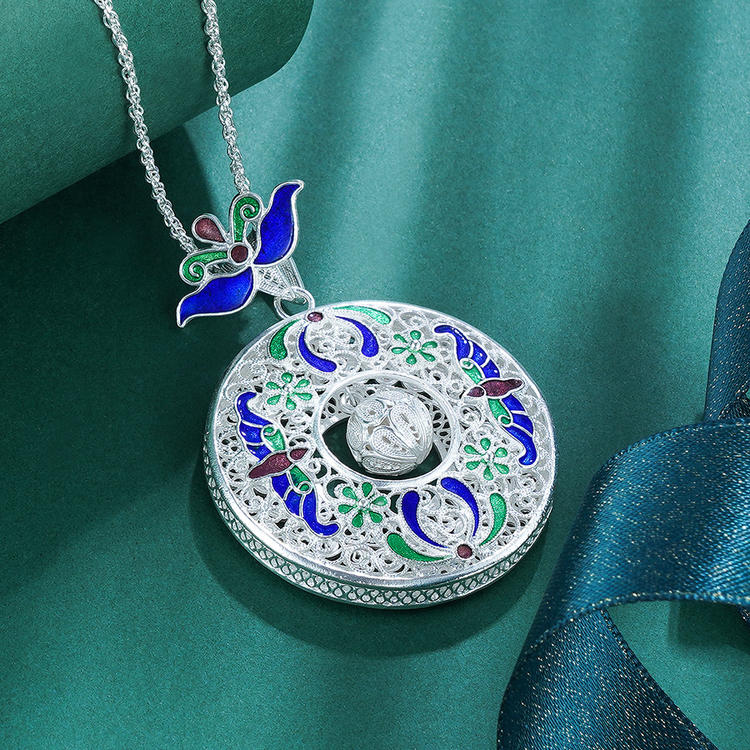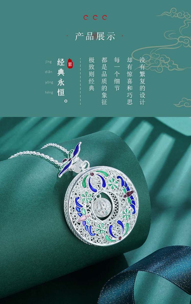 【寓意】:草木葱茏,阳光洒落,银花丝与景泰蓝工艺巧妙融合,营造出一片繁茂之境。中心活动圆珠设计,为吊坠增添灵动之美。适合送礼的非遗佳品,寓意生活从此蒸蒸日上。